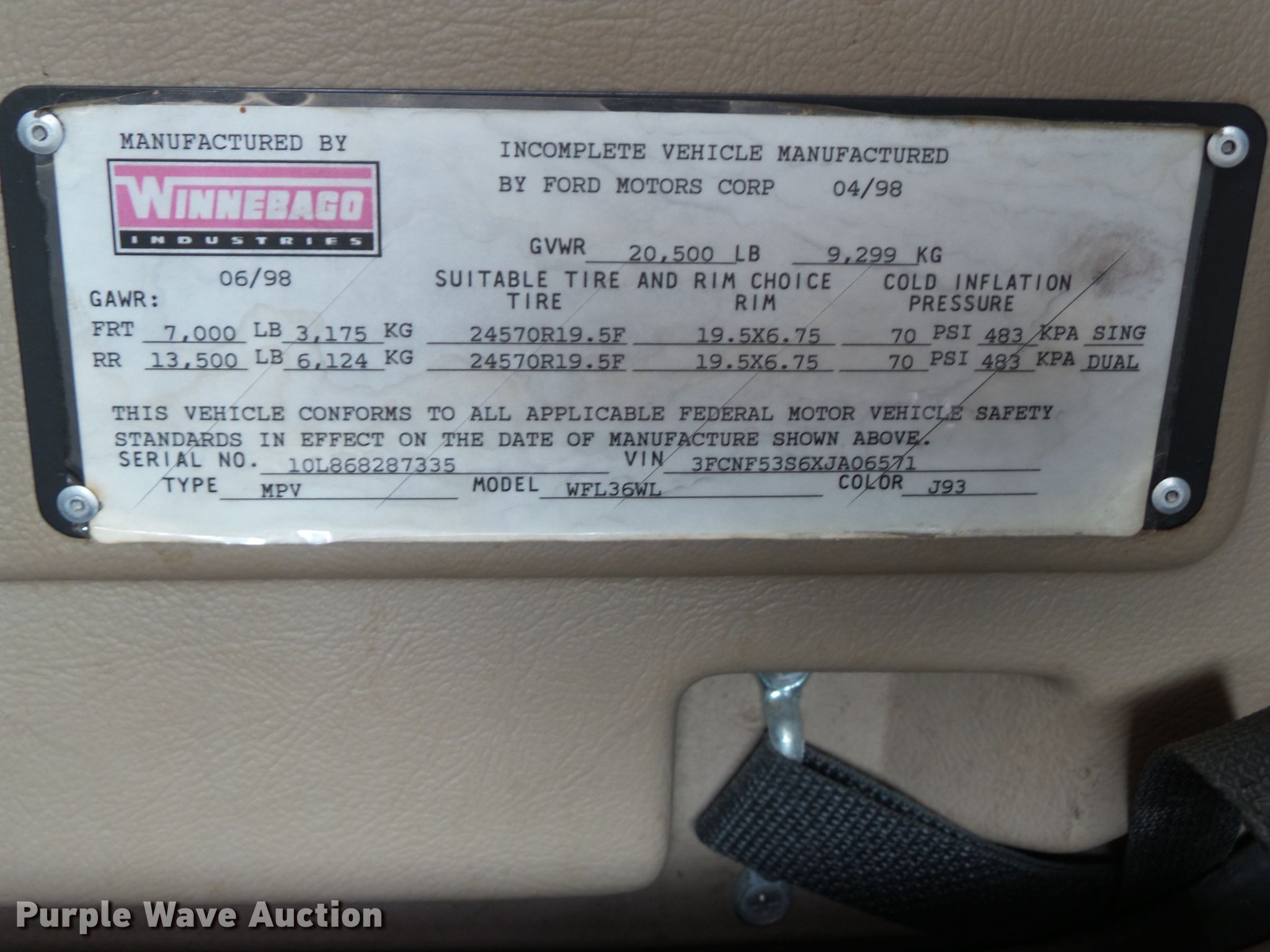 1999 Winnebago Chieftain 36WL RV. 55,161 miles on odometer, 6.8L V10 SOHC 20V gas engine, Automatic transmission, Single axle, 36'L, Slide-out, (5) awnings, Kitchen Sink, Refrigerator/freezer, Microwave, Propane stove, Onan Marquis 7000 generator 701 hours on meter, Gas engine, 6.8 kW, Spring suspension, Hydraulic brakes, 242" wheelbase, 245/70R15 tires, GVWR 20,500 lbs. Iowa title. Seller is a government entity who will be assigning and distributing the title. Please contact the seller for distribution questions. 3FCNF53S6XJA06571. Dallas County Sheriff Department. 201 Nile Kinnick Dr N. Adel, IA 50003