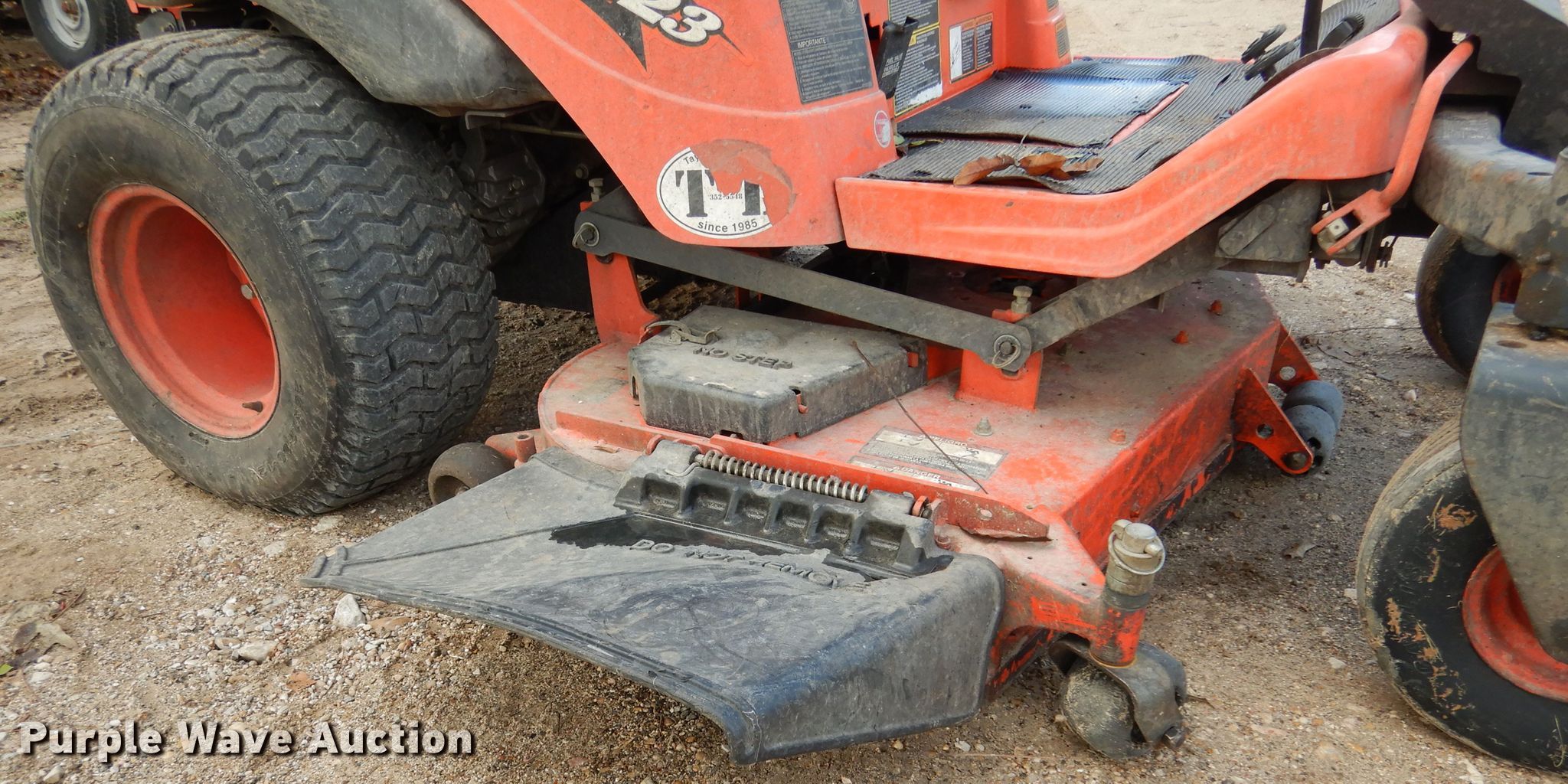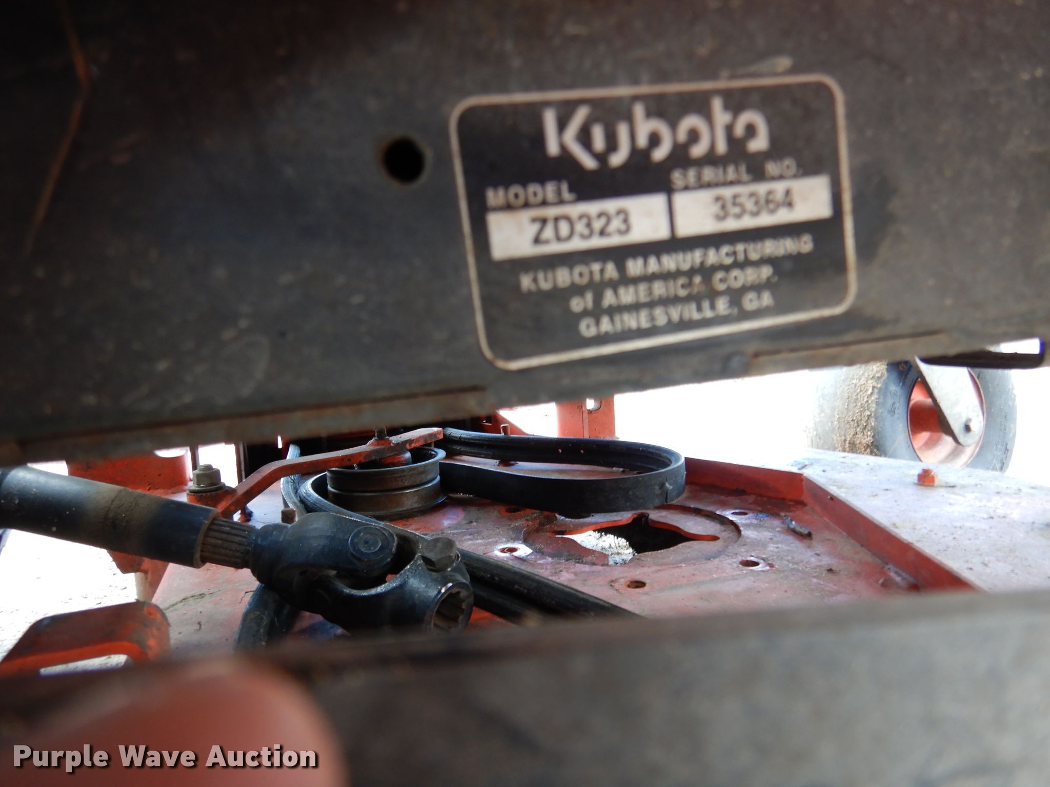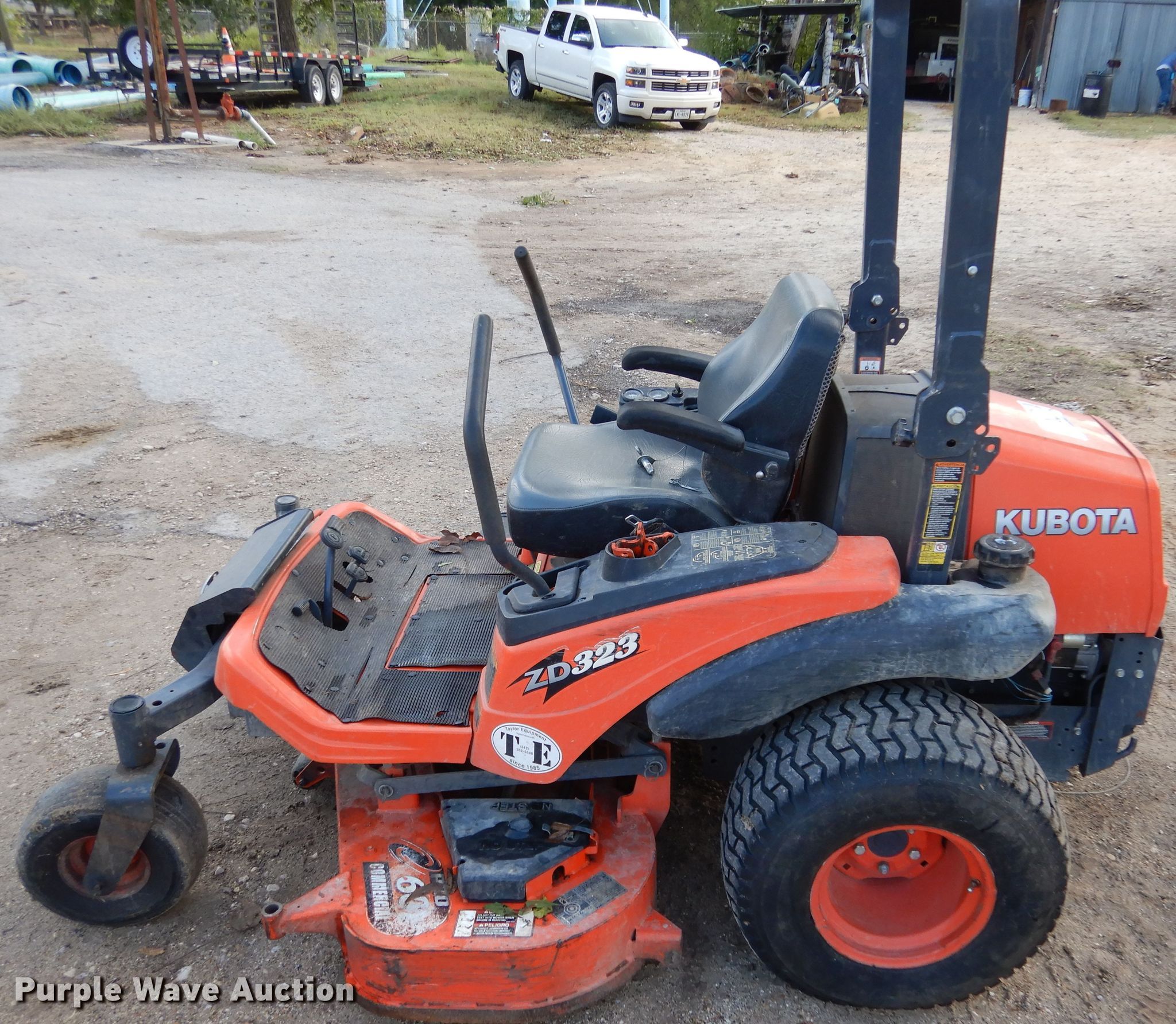 Purple Wave is selling a used Lawn Mower in Texas. This item is a Kubota ZD323 ZTR lawn mower with the following: 690 hours on meter, 60" cut, Kubota D902 three cylinder diesel engine, 23 HP, Hydrostatic transmission, OROPS, Carlisle 15x6x6 front tires, Carlisle 26x12x12 rear tires, Ignition issues, Weak battery, Non-operational mower deck gearbox, Serial 35364, Unit# 335