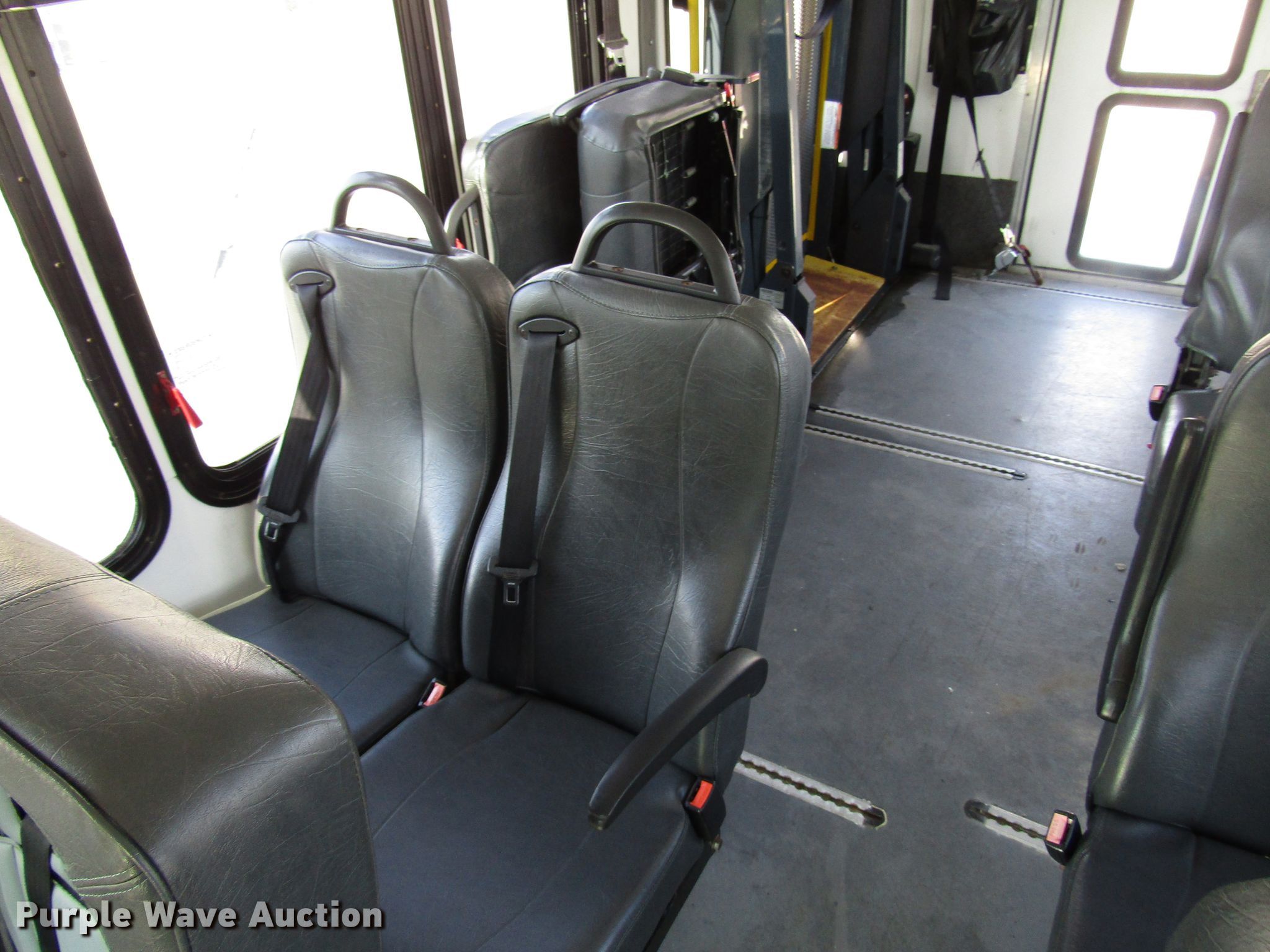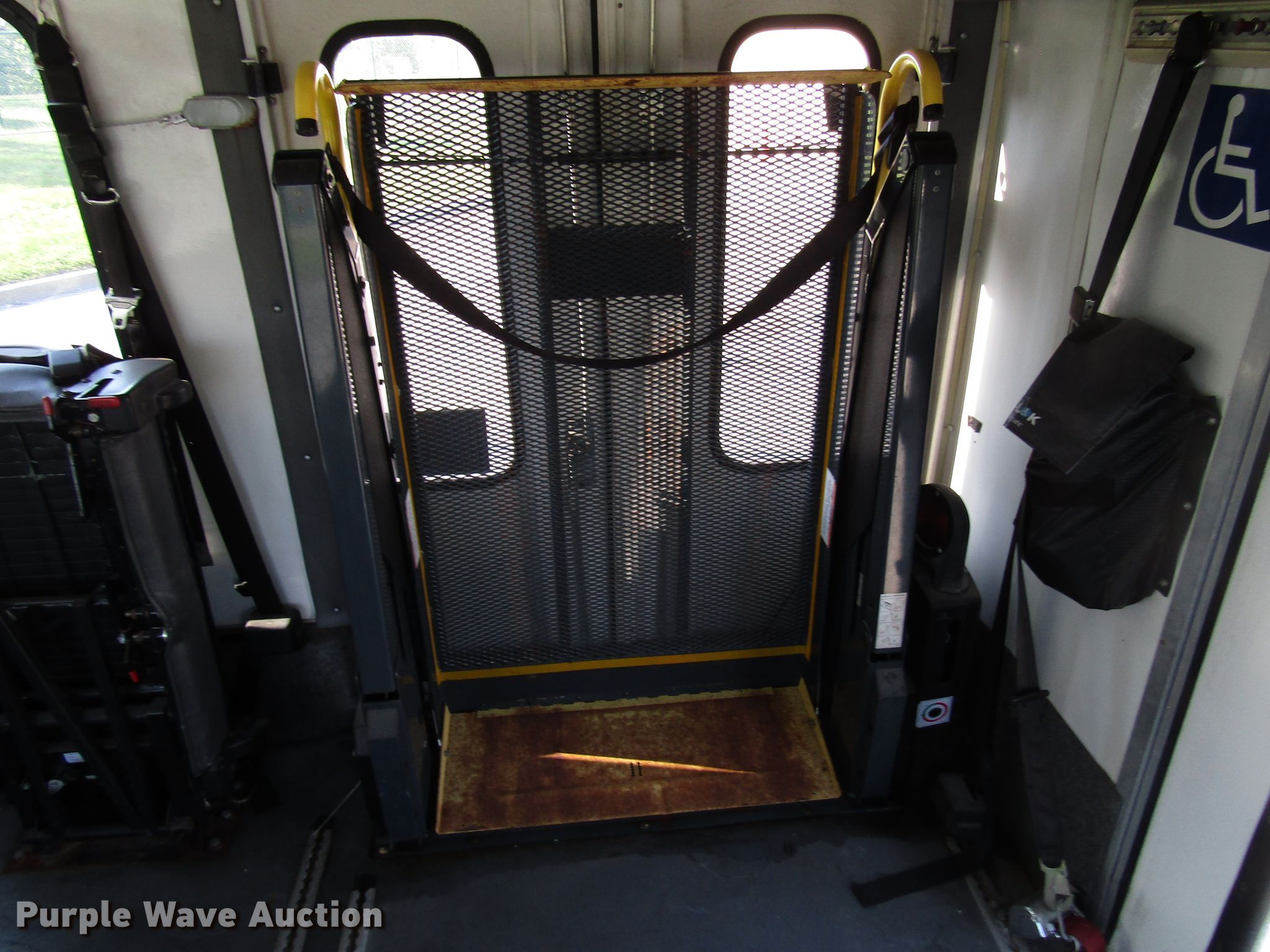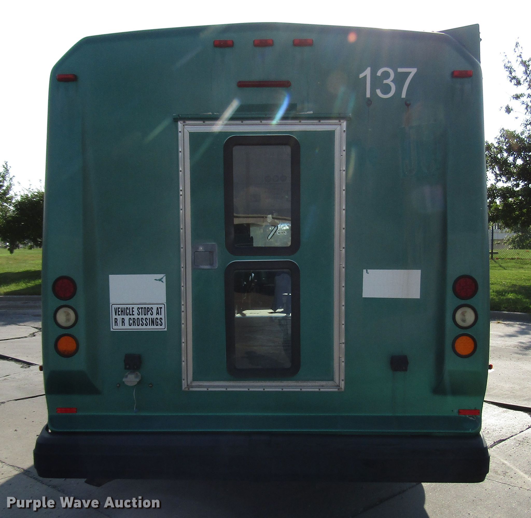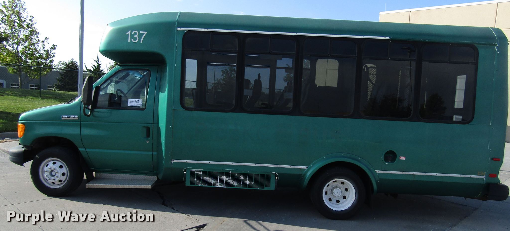 Purple Wave is selling a used Bus in Kansas. This item is a 2007 Ford E450 shuttle bus with the following: 218,637 miles on odometer, 6.0L V8 OHV 32V diesel engine, Automatic transmission, Single axle, AC and heat, 15 passenger capacity, (2) child safety seats, Wheel chair lift, Spring suspension, Hydraulic brakes, 158" wheelbase, 225/75R16 tires, GVWR 14,050 lbs, Batteries dead, ABS light on, AC does not blow cold, Unit# JCT137