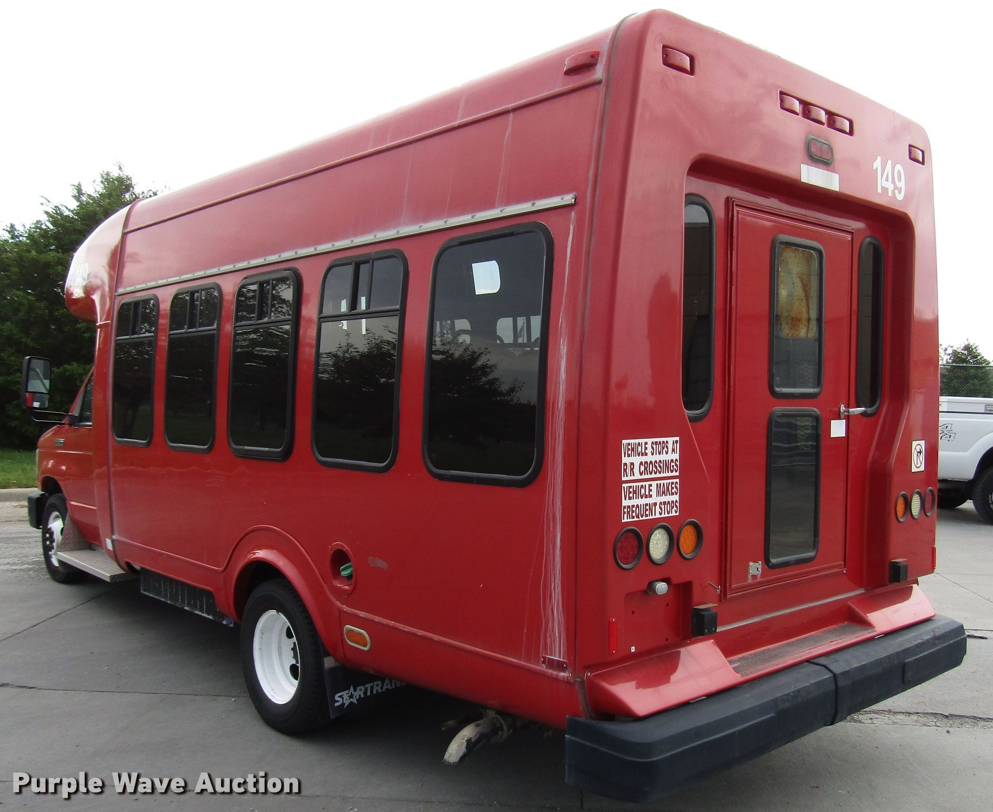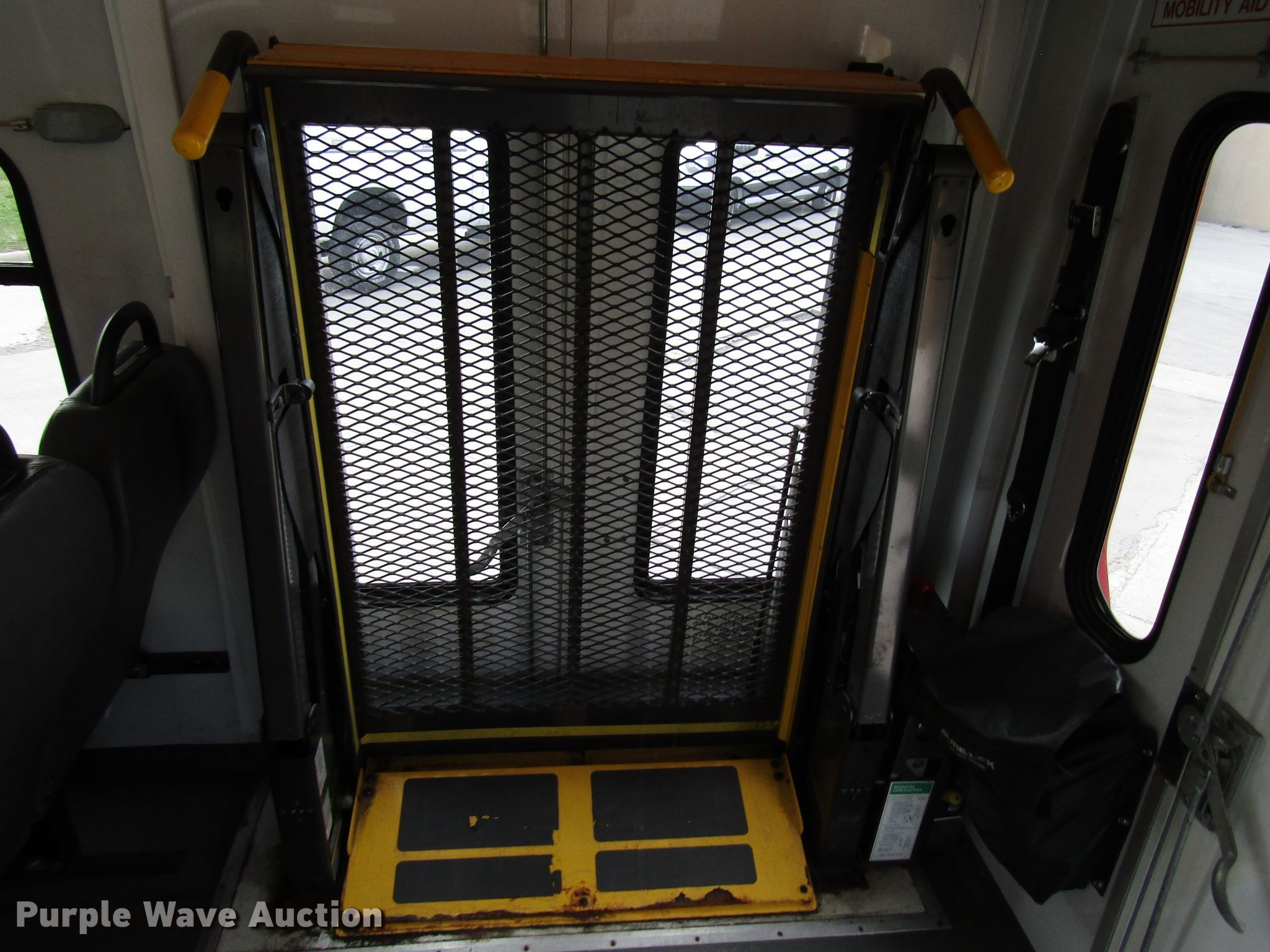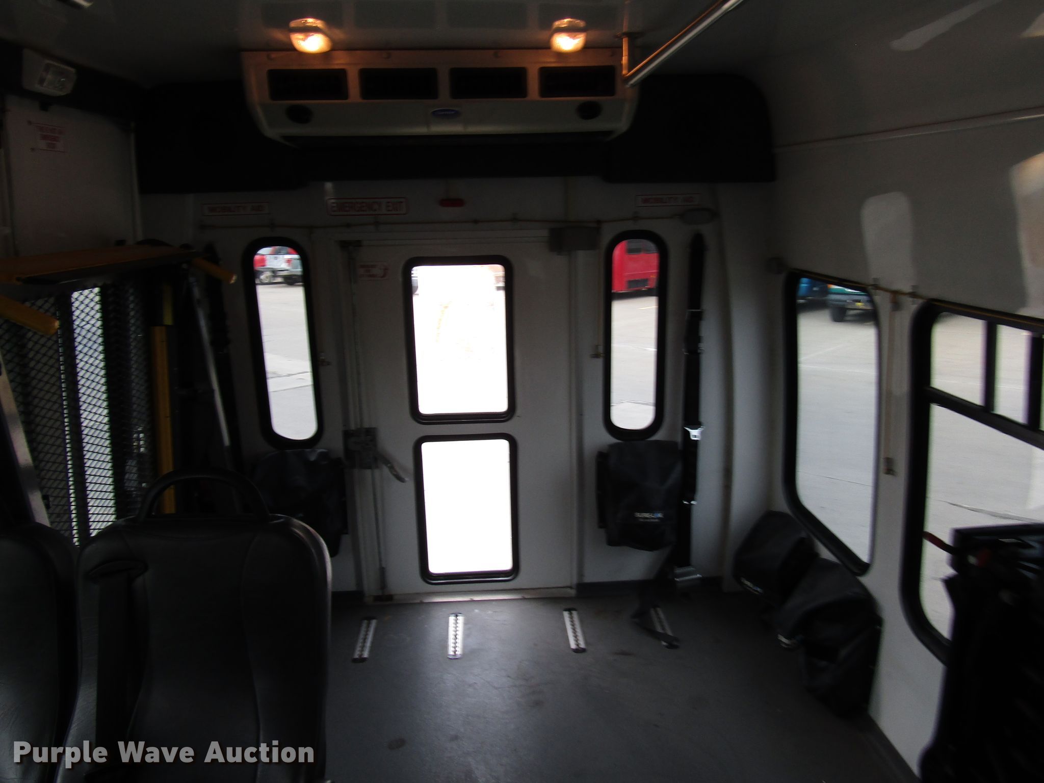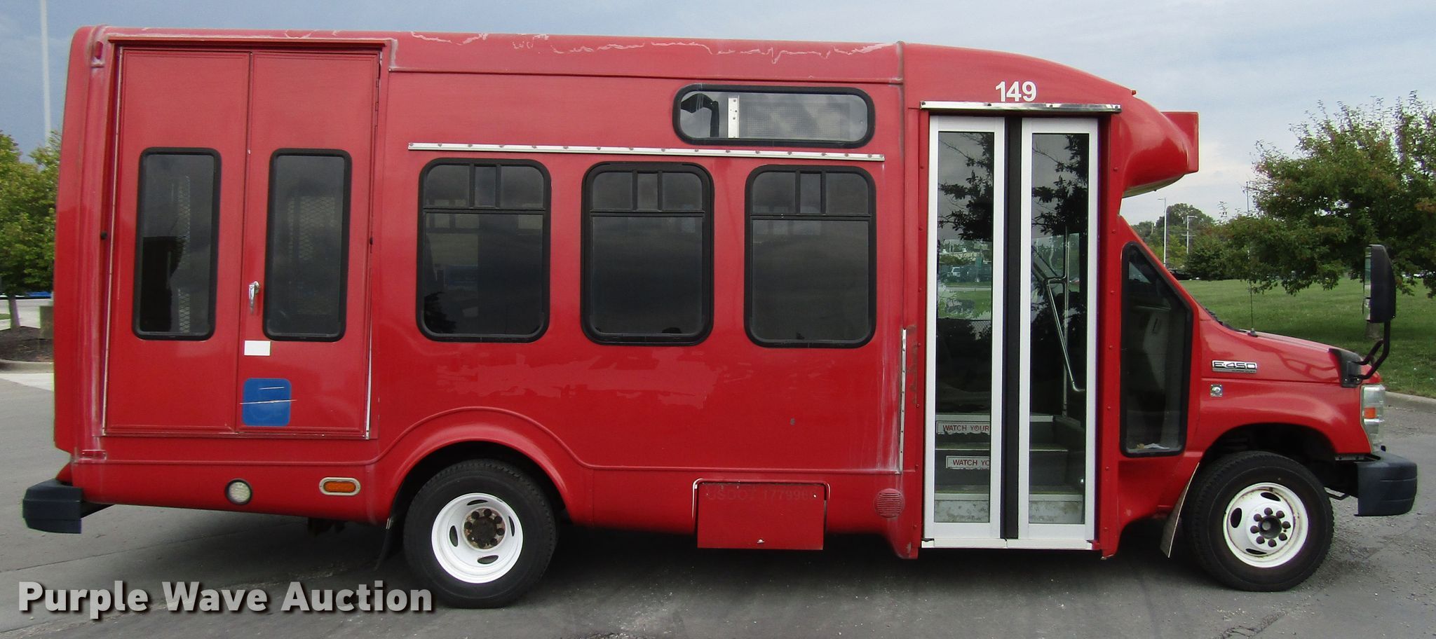 Purple Wave is selling a used Bus in Kansas. This item is a 2009 Ford E450 shuttle bus with the following: 186,524 miles on odometer, 6.0L V8 OHV 32V diesel engine, Automatic transmission, Single axle, AC and heat, Electric passenger sliding door, 14 passenger capacity, (2) child safety seats, Wheelchair lift, Spring suspension, Hydraulic brakes, 158" wheelbase, 225/75R16 tires, GVWR 14,500 lbs, AC system issues, Batteries dead, Unit# JCT149