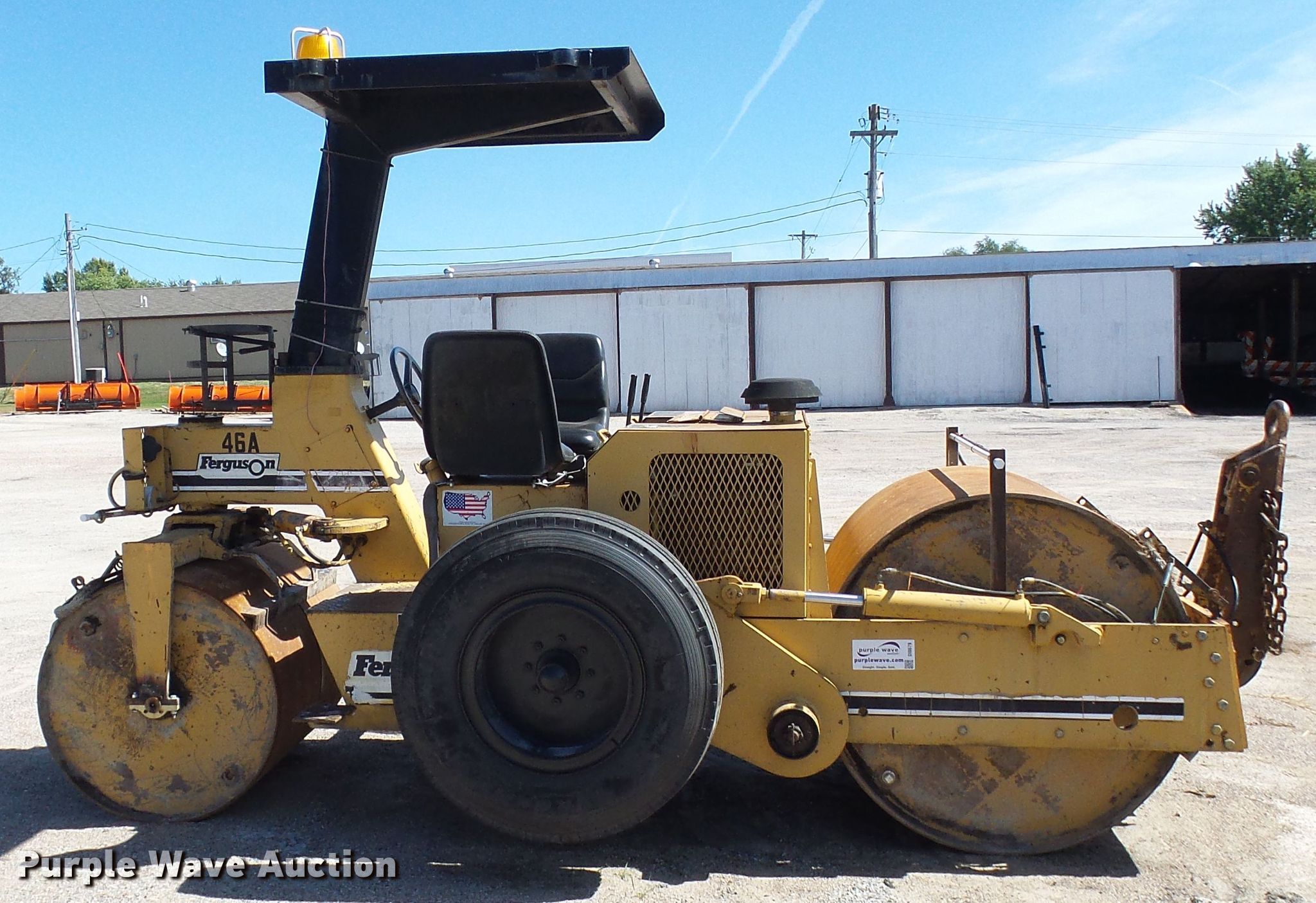 Purple Wave is selling a used Double Drum Roller Compactor in Missouri. This item is a Ferguson 46A double drum vibratory roller with the following: 2,543 hours on meter, Four cylinder diesel engine, Single vibratory system, 40"W x 36" diameter front drum, 42"W x 48" diameter rear drum, Front and rear drum scrapers, Rear water spray applicator, (2) 10R20 transport tires, Towable, Serial 4599, MODOT ID 8704