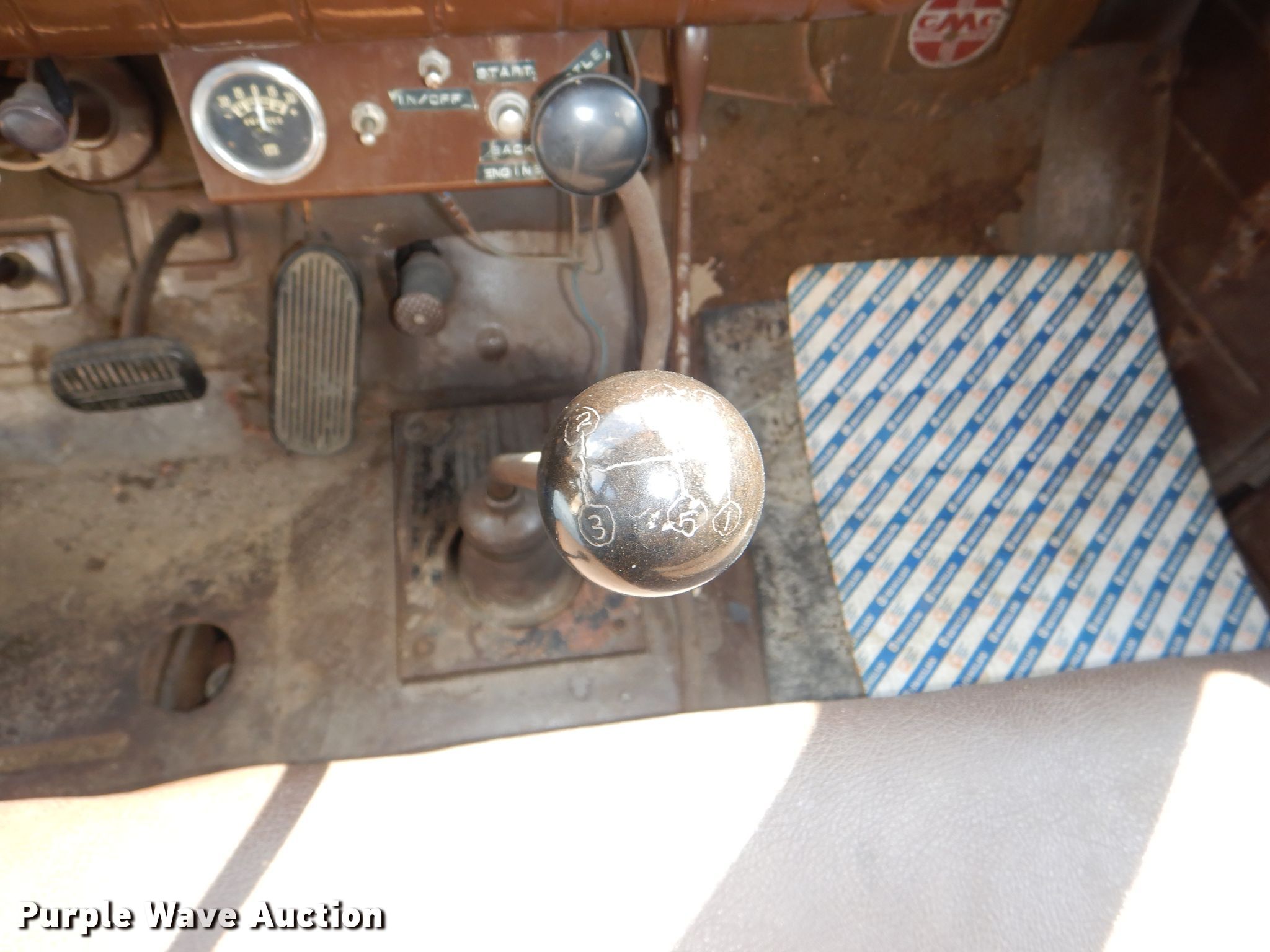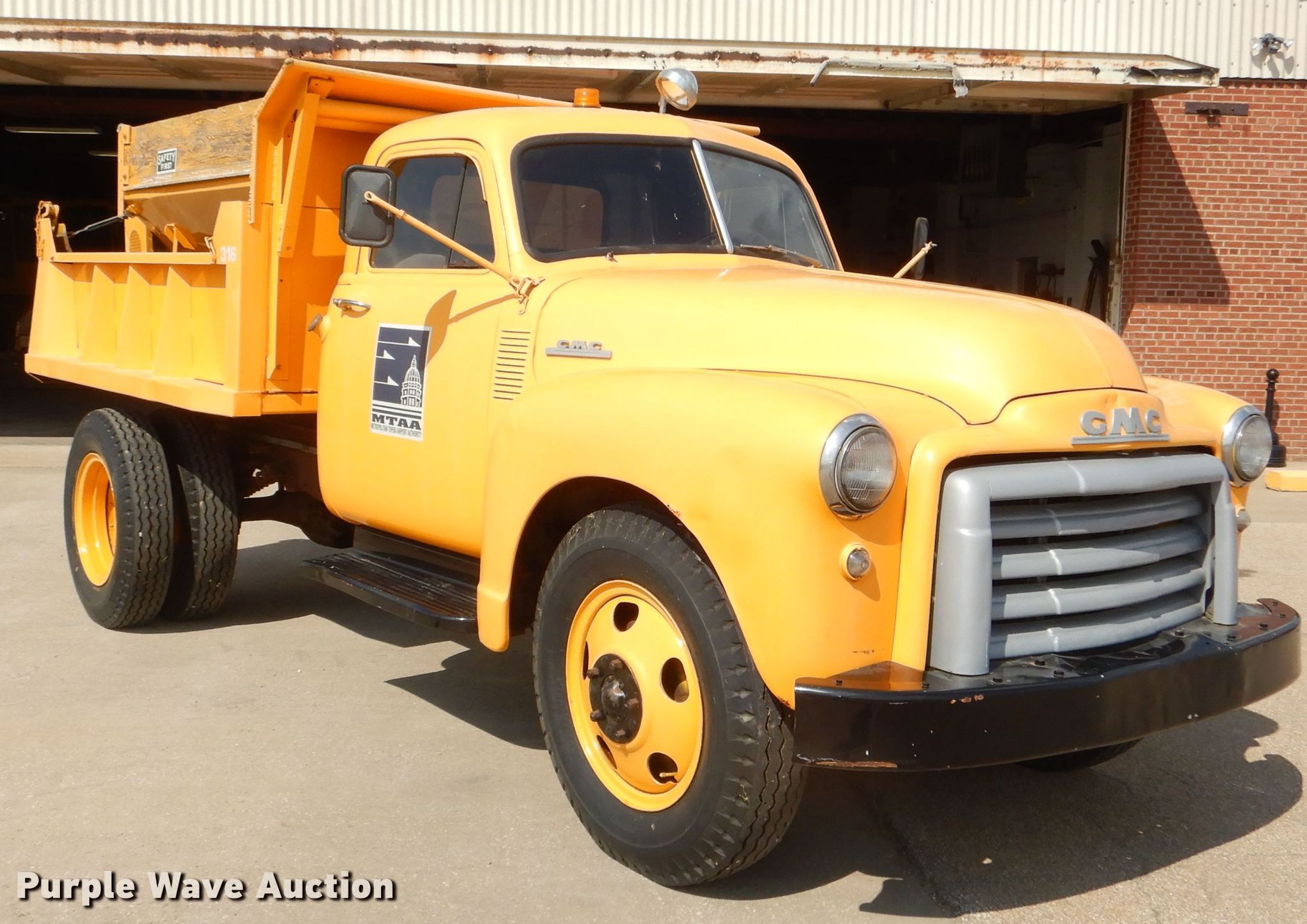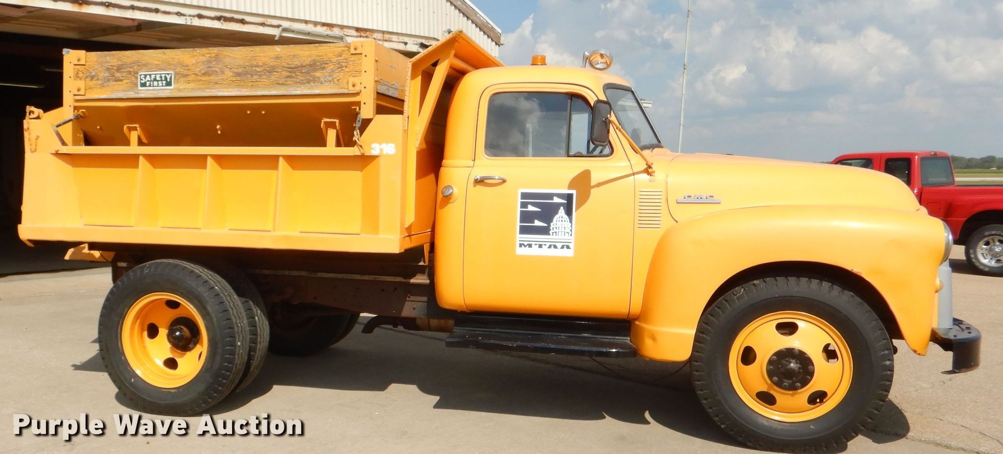 Purple Wave is selling a used Construction Dump Truck in Kansas. This item is a 1953 GMC dump truck with the following: 16,943 miles on odometer, Four cylinder gas engine, Five speed manual transmission, Single axle, Heat, Anthony 620-7-D6 steel dump bed, 8'L x 90"W, 19" side height, Manual end gate, Highway 7-D spreader, Gas engine, 12V battery, Dead battery,, Spring suspension, Hydraulic brakes, 140" wheelbase, General 8.25-20 tires, Driver side window broken, Unit# 316