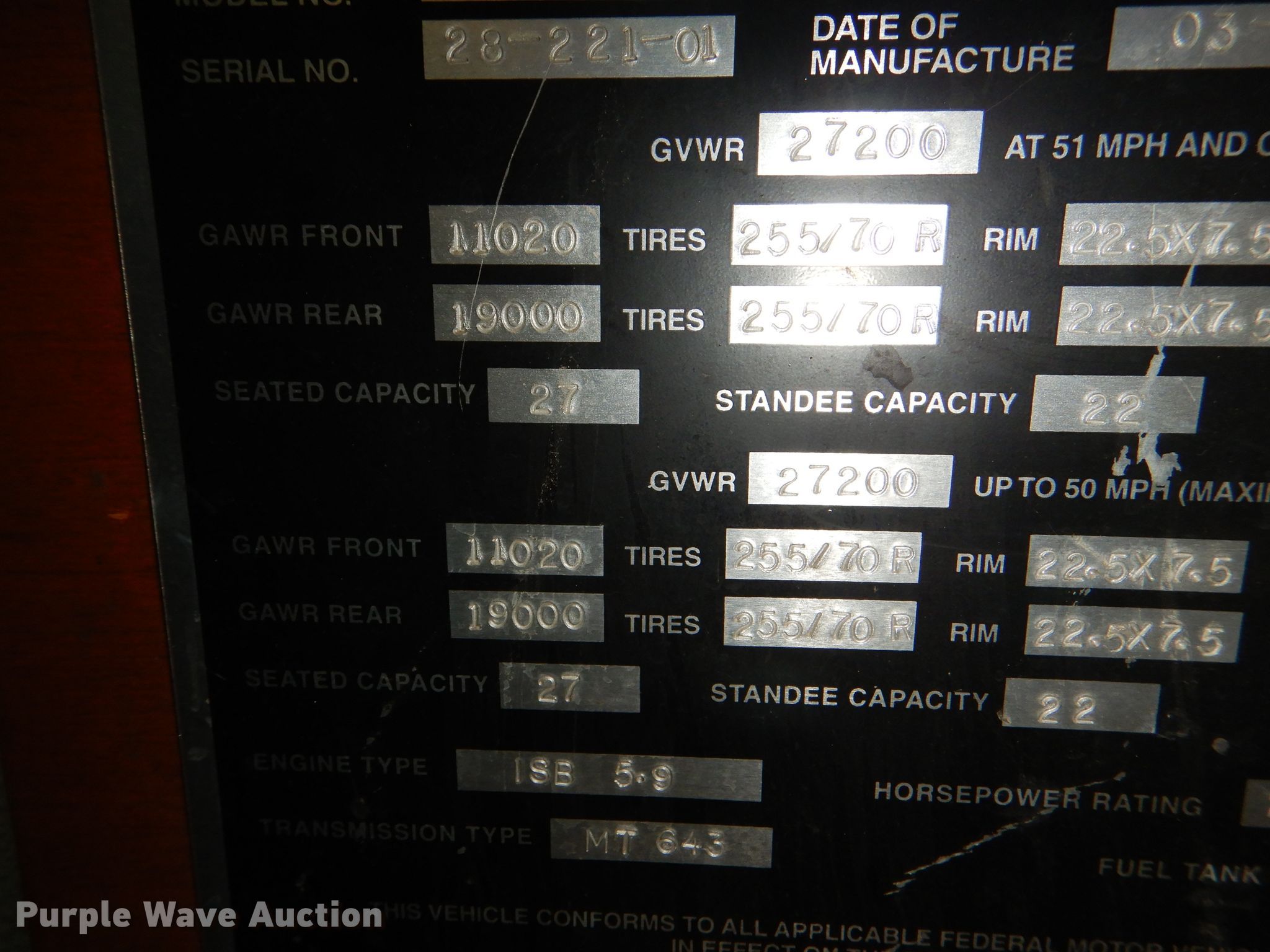 Purple Wave is selling a used Bus in Kansas. This item is a 2001 Chance Coach AH-28 trolley with the following: 100,651 miles on odometer, 5,688 miles on hubodometer, Approx. 106,339 total miles, Cummins diesel engine, Automatic transmission, Single axle, AC and heat, Heated mirrors, Electric passenger sliding door, 27 passenger seated capacity, 22 passenger standing capacity, Hand rails, Mobile-Tech wheelchair lift, Air suspension, Air brakes, 173" wheelbase, Dynatrac 255/70R22.5 tires, GVWR 27,200 lbs, FAWR 11,020 lbs, RAWR 19,000 lbs, Non-operational AC, Non-operational odometer, No key, May be started by hot-wiring, Leaks oil, Rear air suspension leaks