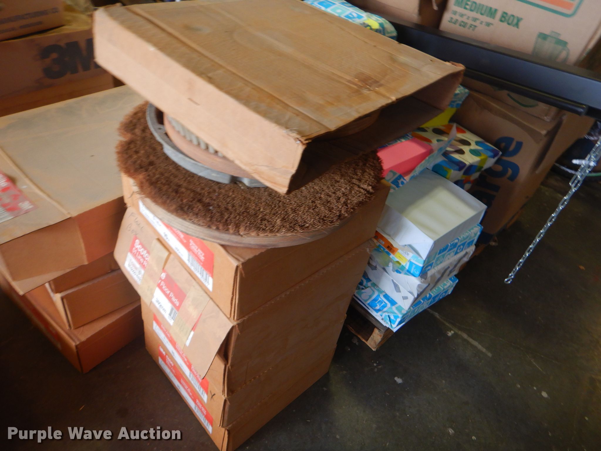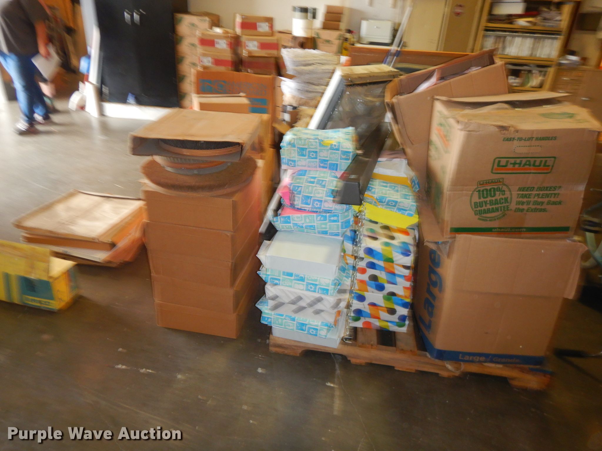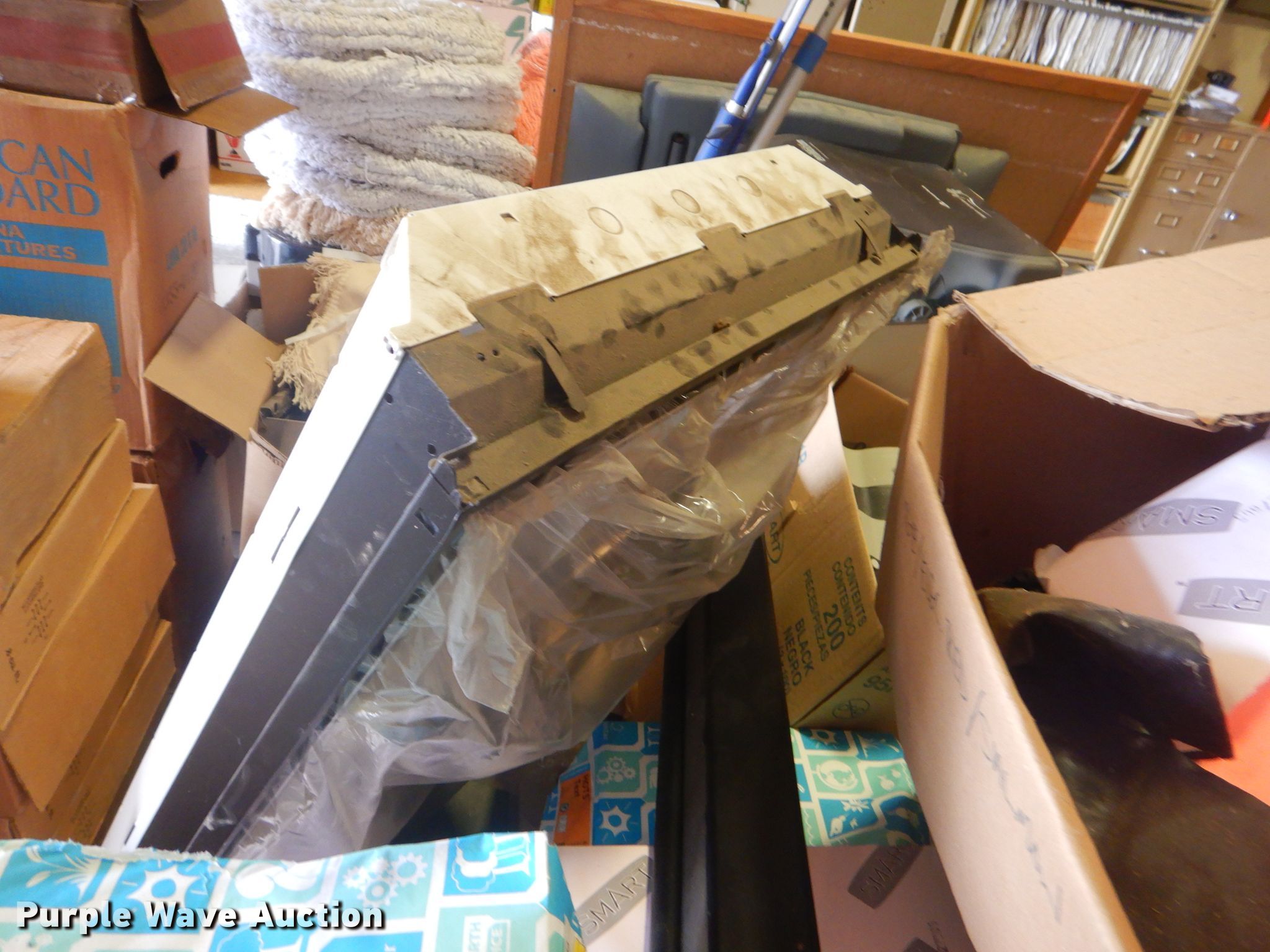 Purple Wave is selling a used Office Supplies and Equip. in Kansas. This item is a Office supplies and equipment with the following: (2) basketball rims, Hand sanitizer dispensers, Sanitary napkin trash can, Toilet paper dispensers, Bulletin board, Lecturn, Stand, (27) 9" x 11" dry erase boards, Vacuum bags, String mops and dust mop heads, Ball bearing casters, (10) cases of 17" round buffer pads, (4) cases of 15" round buffer pads, Case of 17" round sanding screens, 100 grit, Case of 20" round sanding screens, 100 grit, (4) cases of 20" round sanding screens, 120 grit, Light fixture, Urinal floor mats, (50) Caddy 512-T grid box hangers, 24" span, (2) sinks, Projector screen, Copier paper