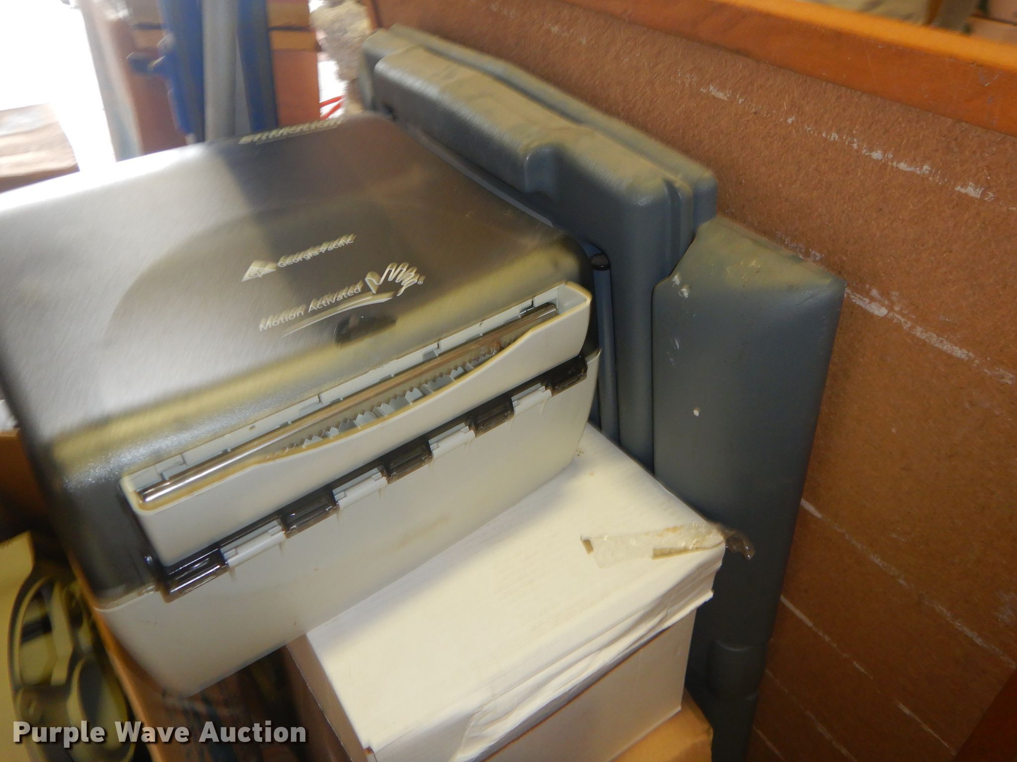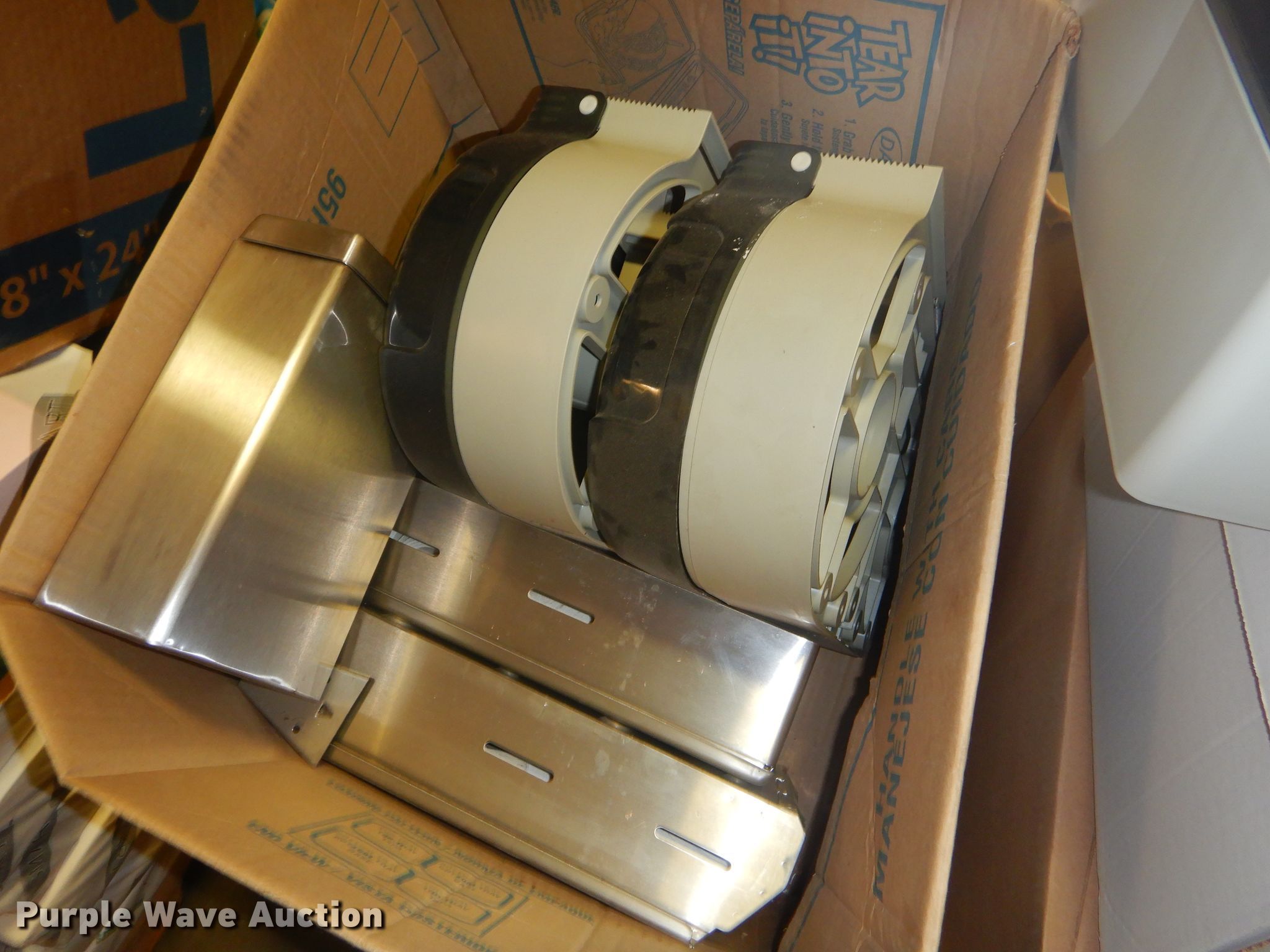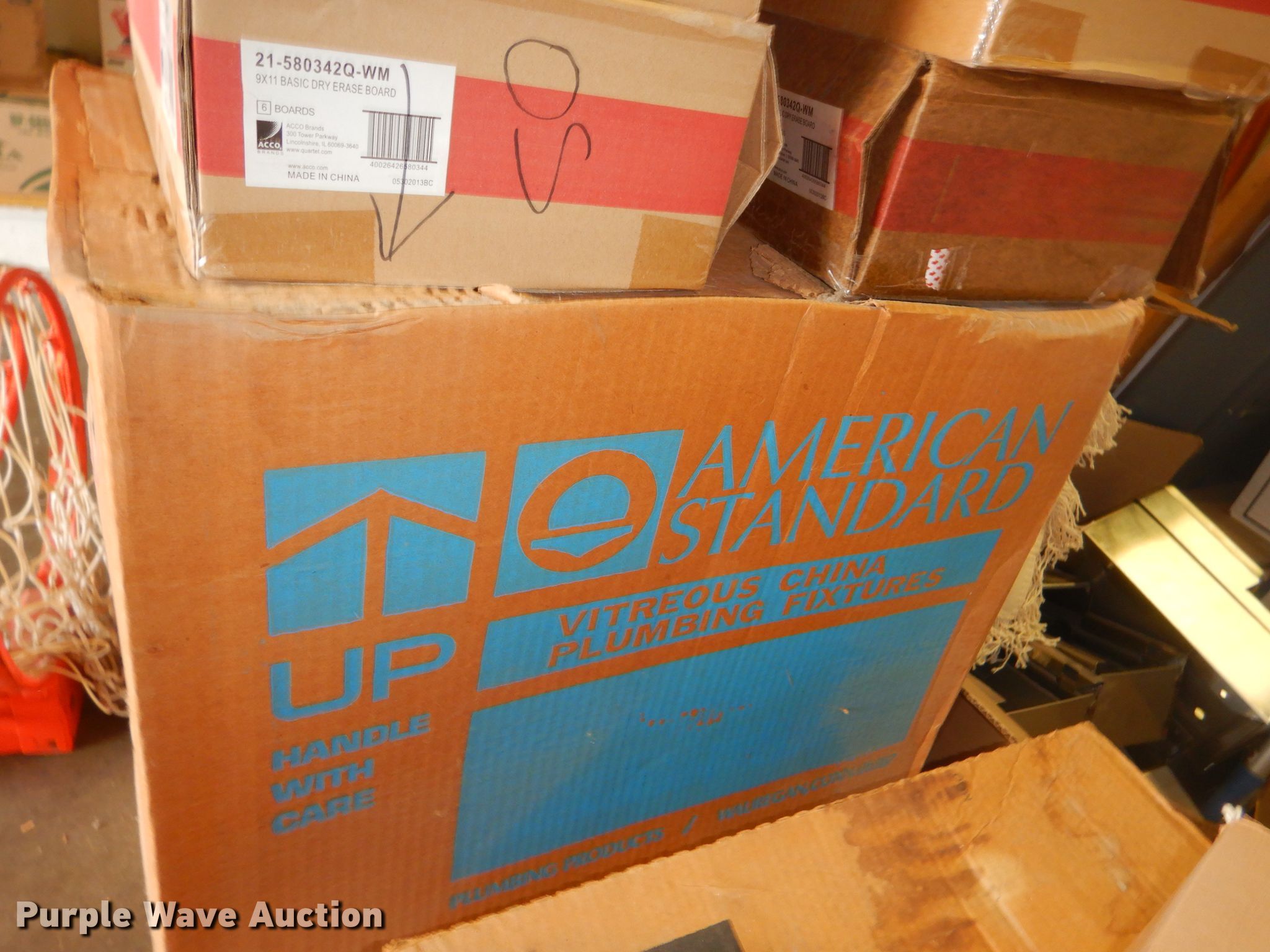 Purple Wave is selling a used Office Supplies and Equip. in Kansas. This item is a Office supplies and equipment with the following: (2) basketball rims, Hand sanitizer dispensers, Sanitary napkin trash can, Toilet paper dispensers, Bulletin board, Lecturn, Stand, (27) 9" x 11" dry erase boards, Vacuum bags, String mops and dust mop heads, Ball bearing casters, (10) cases of 17" round buffer pads, (4) cases of 15" round buffer pads, Case of 17" round sanding screens, 100 grit, Case of 20" round sanding screens, 100 grit, (4) cases of 20" round sanding screens, 120 grit, Light fixture, Urinal floor mats, (50) Caddy 512-T grid box hangers, 24" span, (2) sinks, Projector screen, Copier paper
