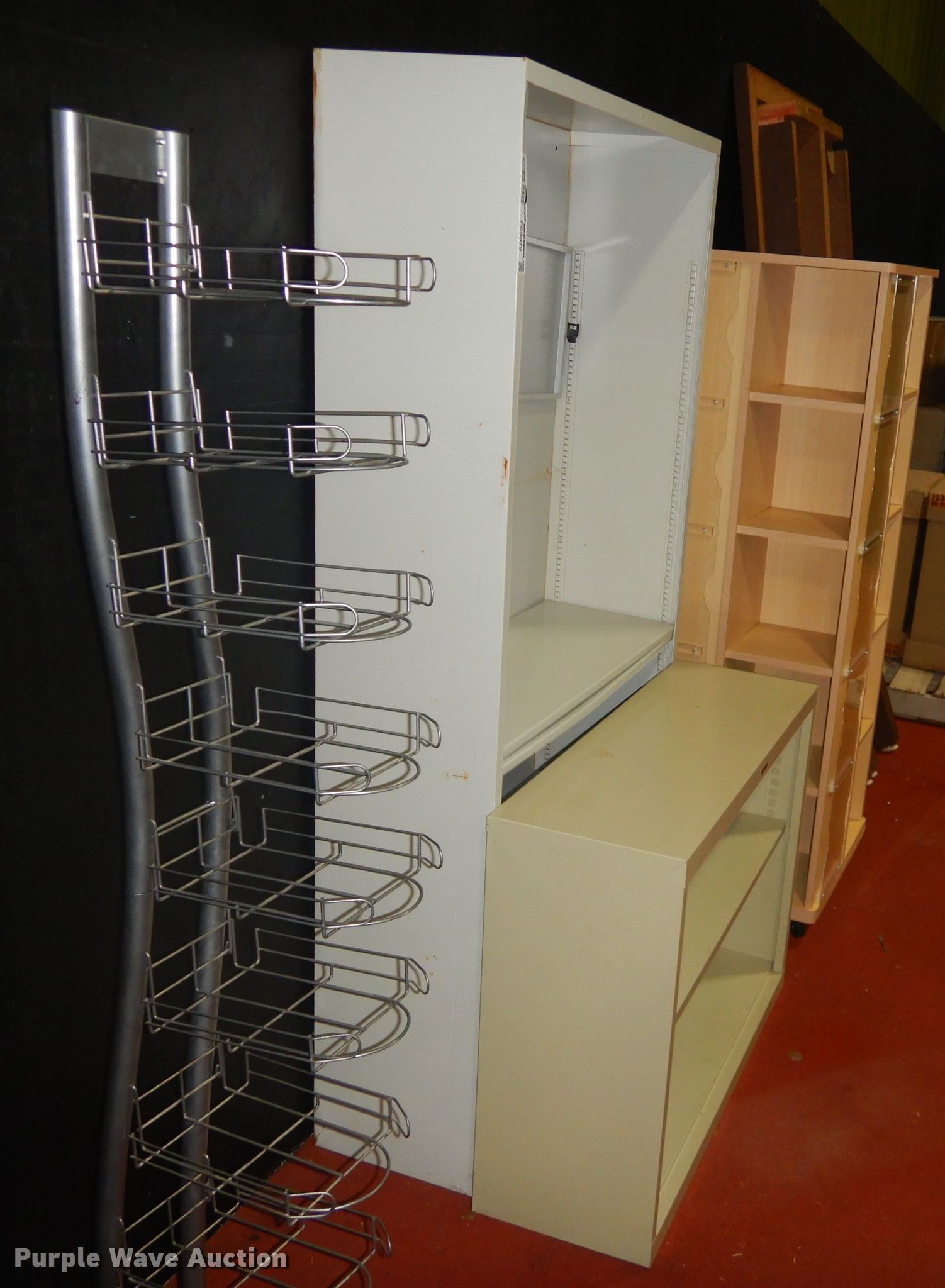 Purple Wave is selling a used Office Supplies and Equip. in Kansas. This item is a Office supplies with the following: Hat display rack, Metal bookshelves, Wood rotating display, Wood table