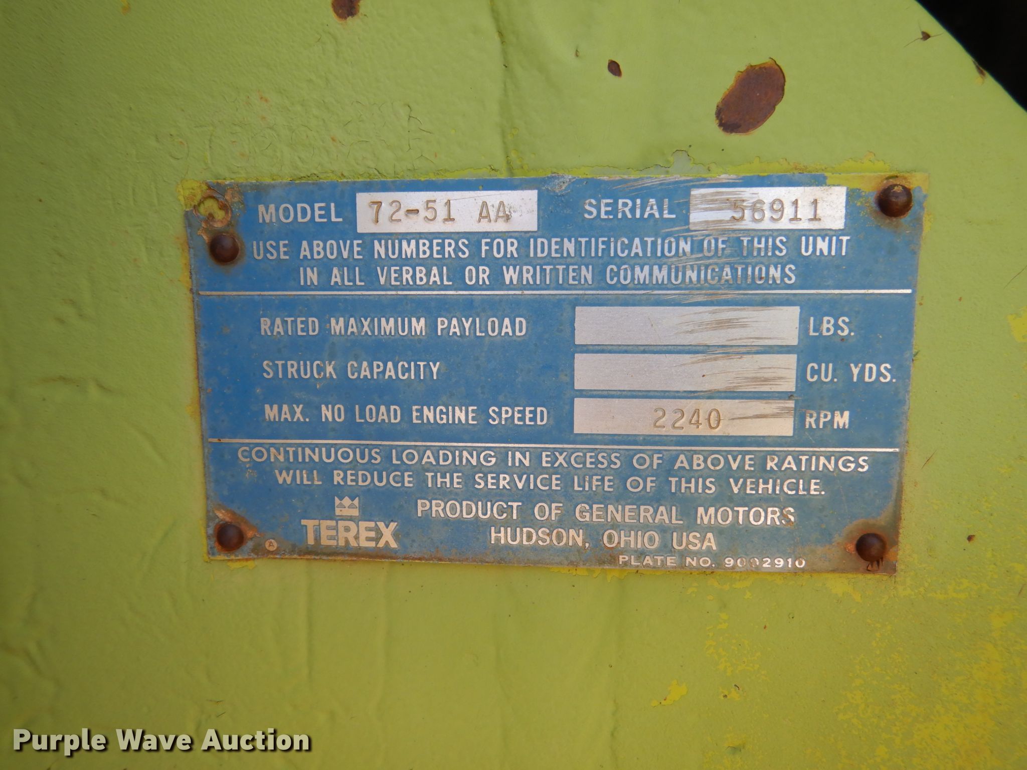 Purple Wave is selling a used Wheel Loader in South Dakota. This item is a 1971 Terex 72-51 AA wheel loader with the following: 2,608 hours on meter, Detroit Diesel six cylinder diesel engine, Powershift transmission, 2F-1R gears, Enclosed cab, Two-lever bucket controls, 114"W general purpose bucket, Bolt-on cutting edge, 23.5R25 tires, Cracked windshield, Door glass will be replaced prior to auction, Serial 56911