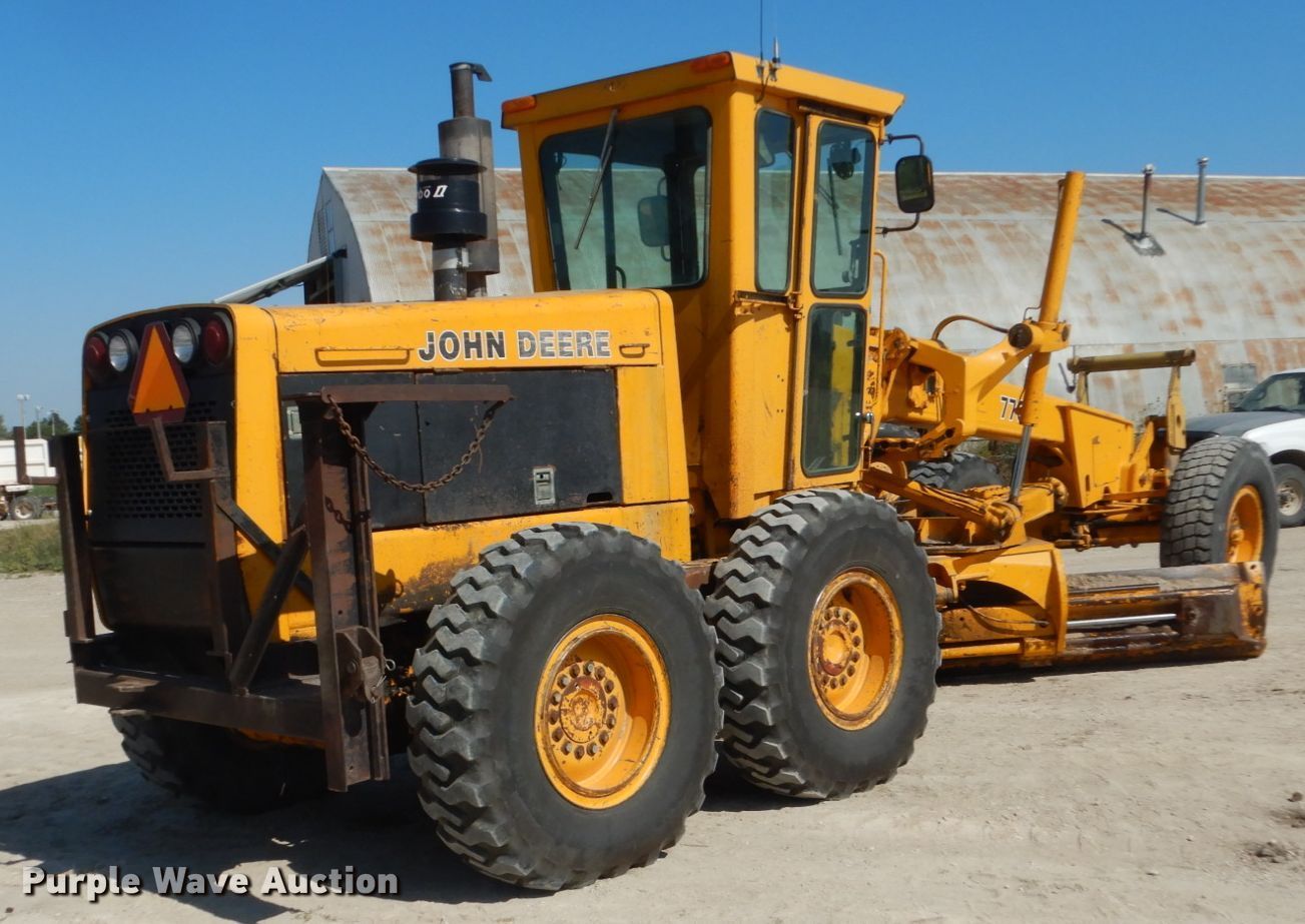 Purple Wave is selling a used Motor Grader in South Dakota. This item is a 1982 John Deere 770A motor grader with the following: 646 hours on meter, John Deere six cylinder diesel engine, Powershift transmission, 8F-8R gears, Differential lock, Enclosed cab, Heat, Two moldboard hydraulic control valves, Two snow wing hydraulic control valves, 14'W moldboard, Tip control, Side shift, Circle slip clutch, Front mounted lift group, Falls Series 2000 snow wing, 11'8"W, 14.00R24 tires, Glass cracked, Serial 406475DW