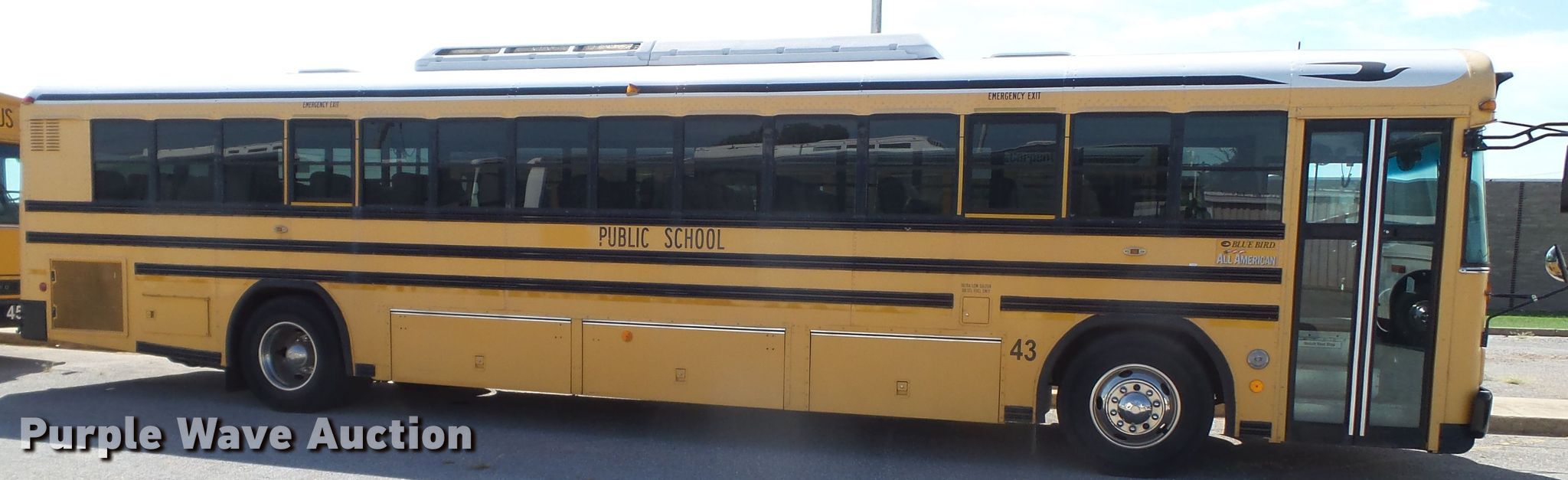 Purple Wave is selling a used Bus in Oklahoma. This item is a 2009 Blue Bird All American FE school bus with the following: 69,582 miles on odometer, 2,314 hours on meter, Caterpillar C7 7.2L L6 diesel engine, Automatic transmission, Single axle, AC and heat, 42 passenger capacity, Air suspension, Air brakes, 11R22.5 tires, GVWR 36,200 lbs, Unit# 43