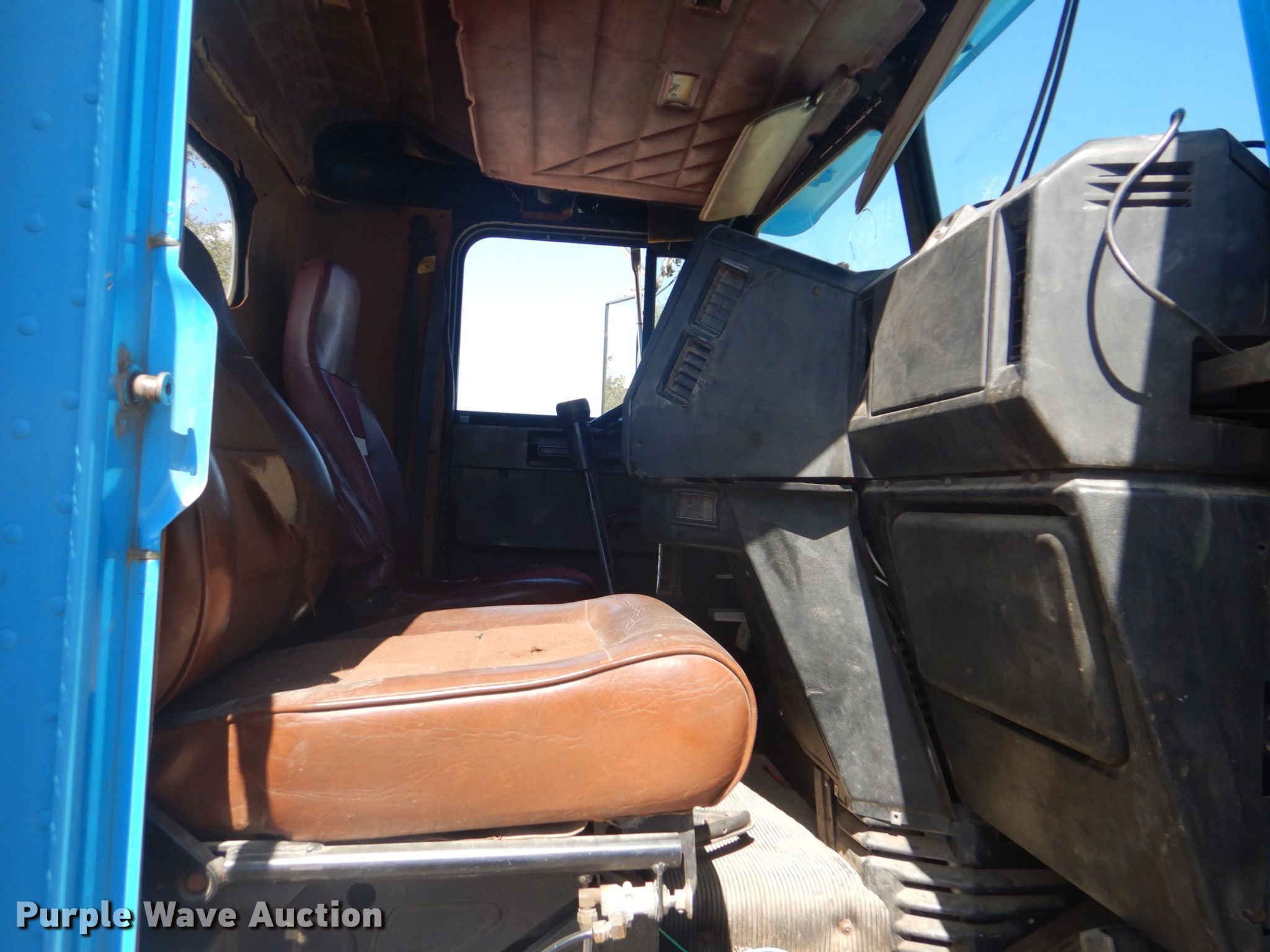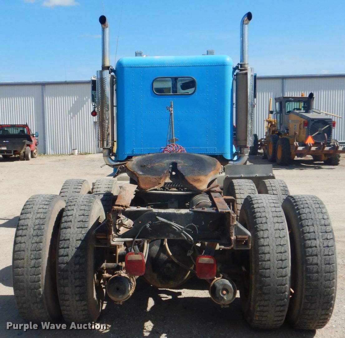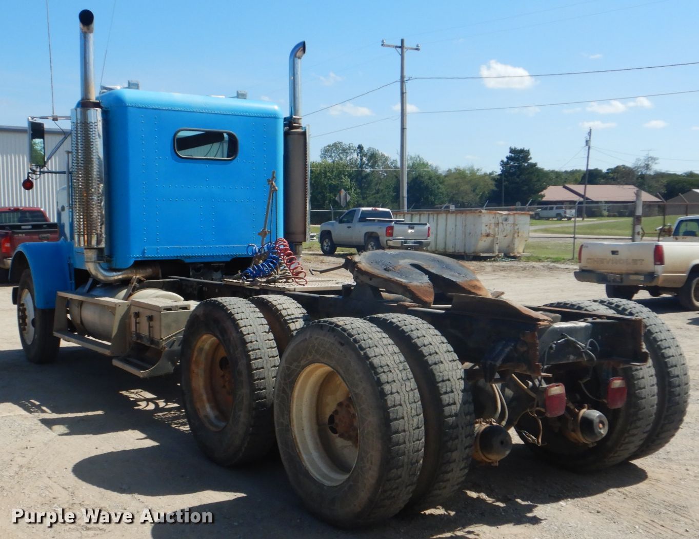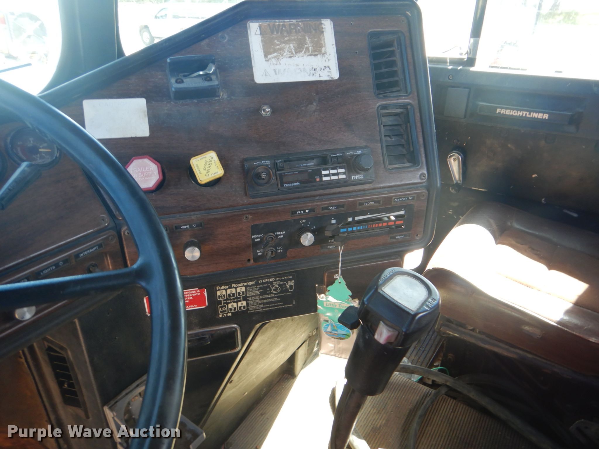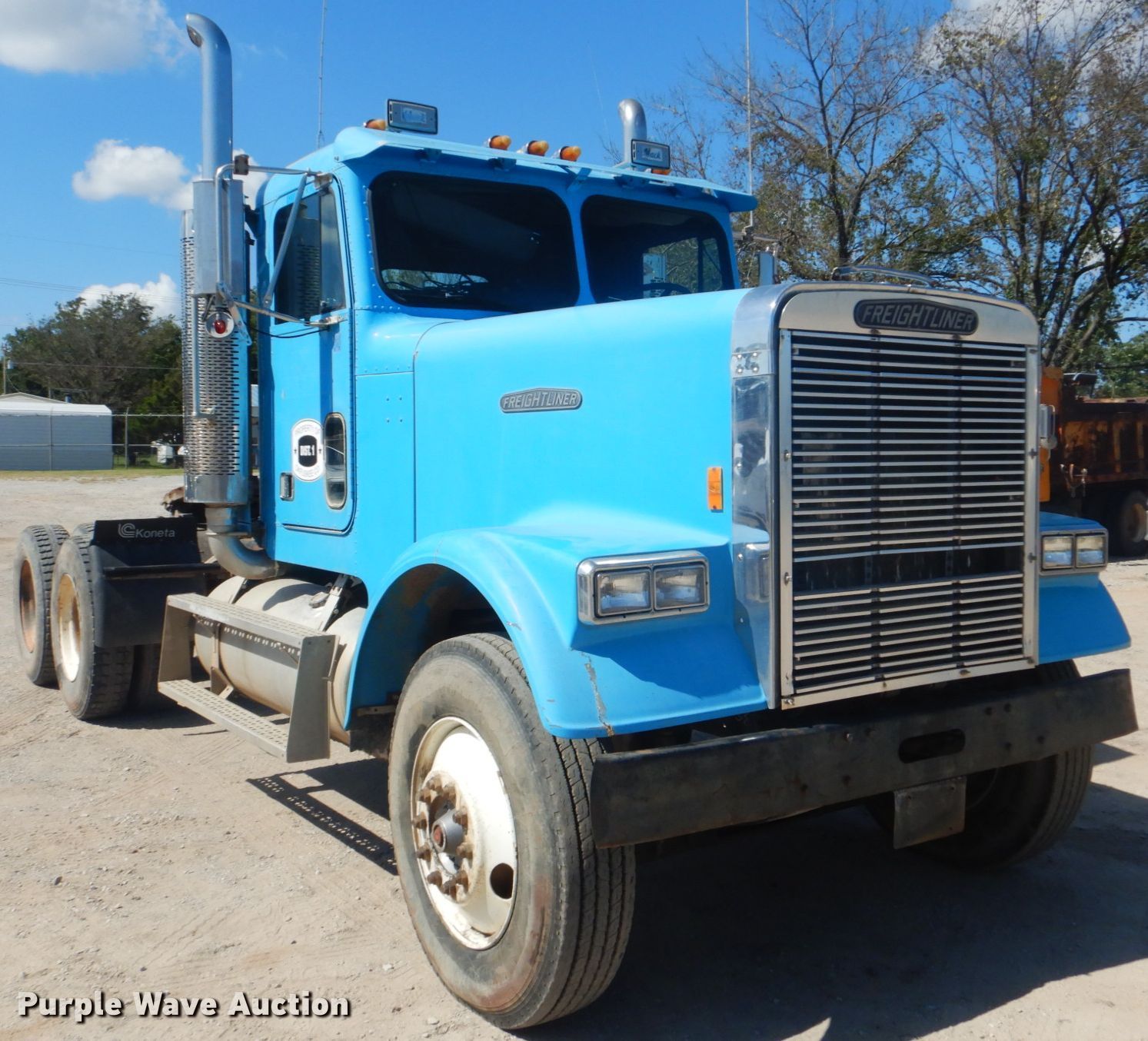 Purple Wave is selling a used Truck Tractor in Oklahoma. This item is a 1989 Freightliner FLC semi truck with the following: 238,442 miles on odometer, Cummins 14.0L six cylinder diesel engine, 10 speed manual transmission, Tandem axle, AC and heat, Steel deck plate, Air operated fifth wheel plate, Dual fuel tanks, Spring suspension, Air brakes, 225" wheelbase, 11R24.5 tires, GVWR 48,000 lbs