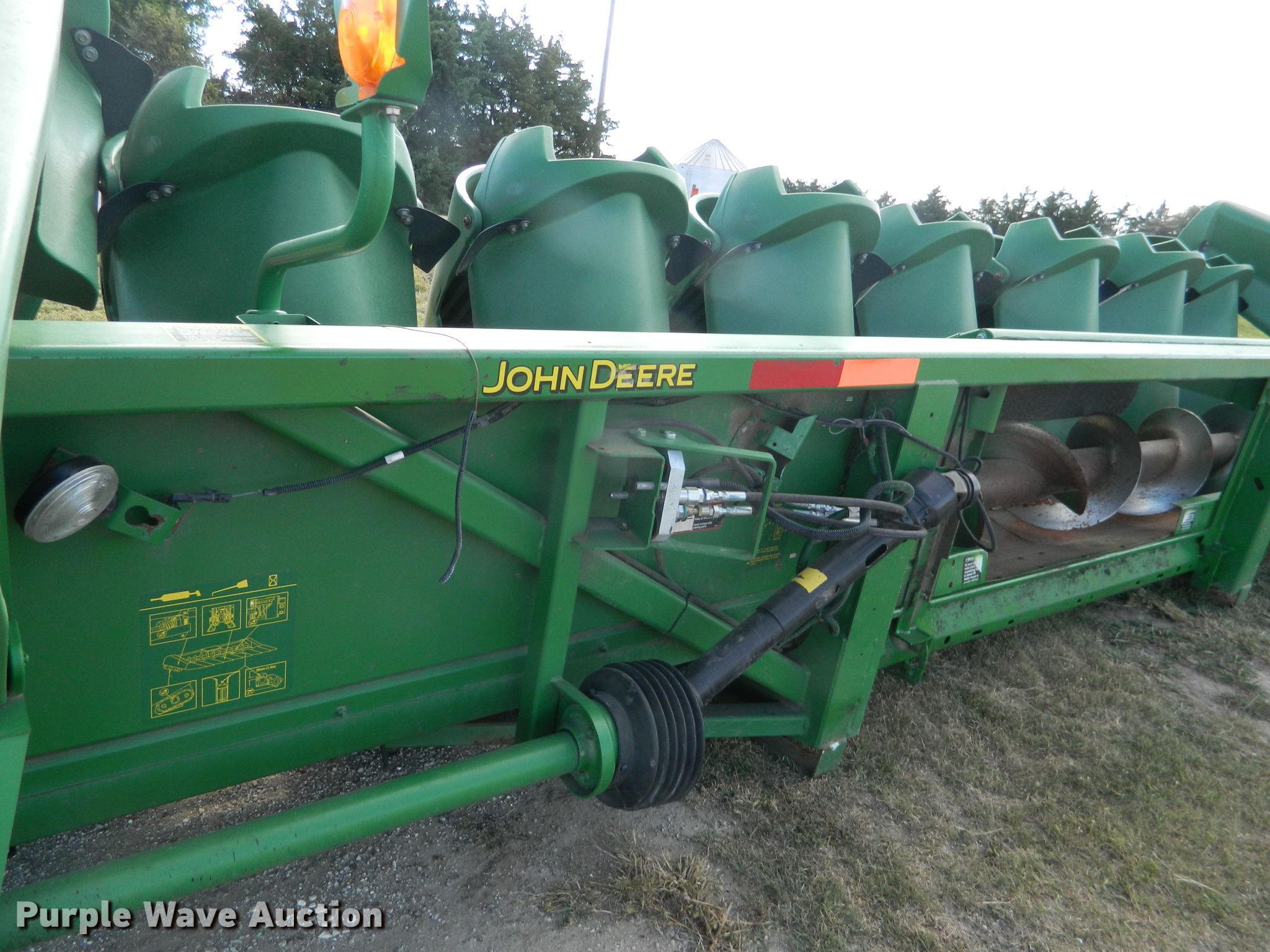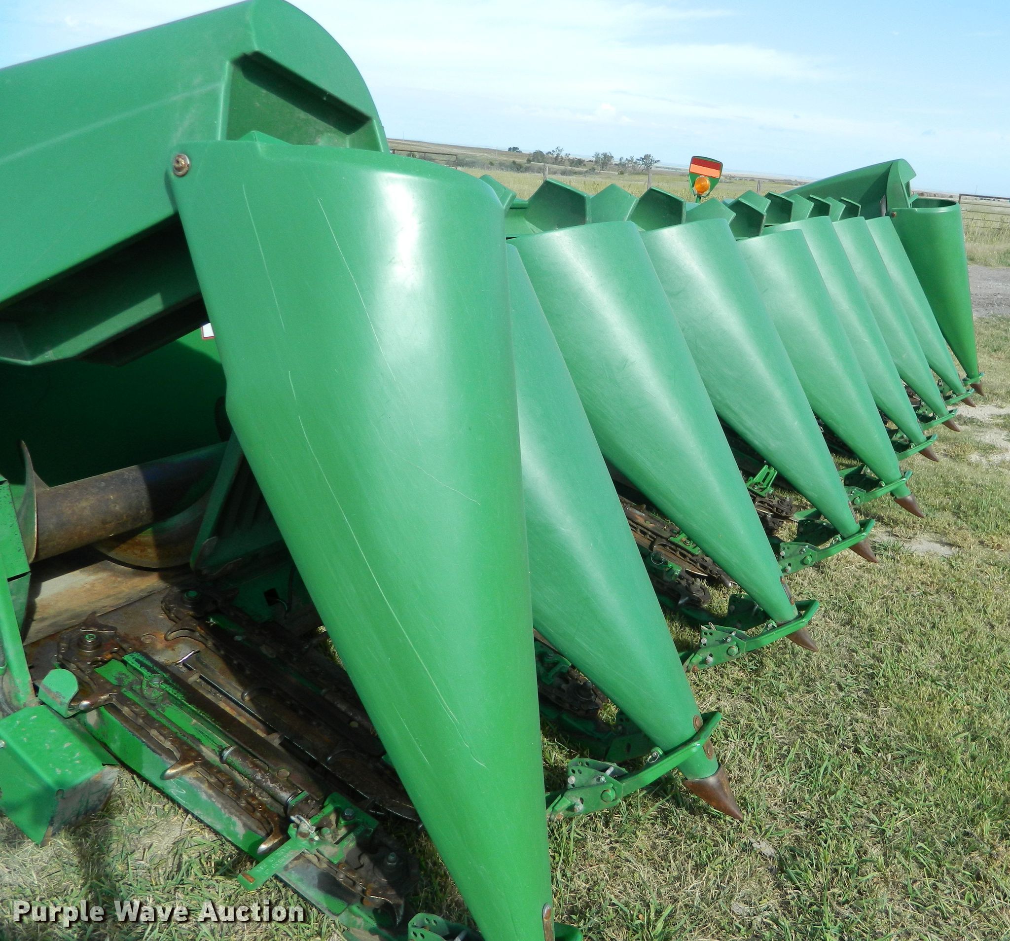 Purple Wave is selling a used Corn or Row Head in Kansas. This item is a 2007 John Deere 893 corn head with the following: Eight rows, 30" row spacing, Single point coupler, Dual drivelines, Serial H00893X721278