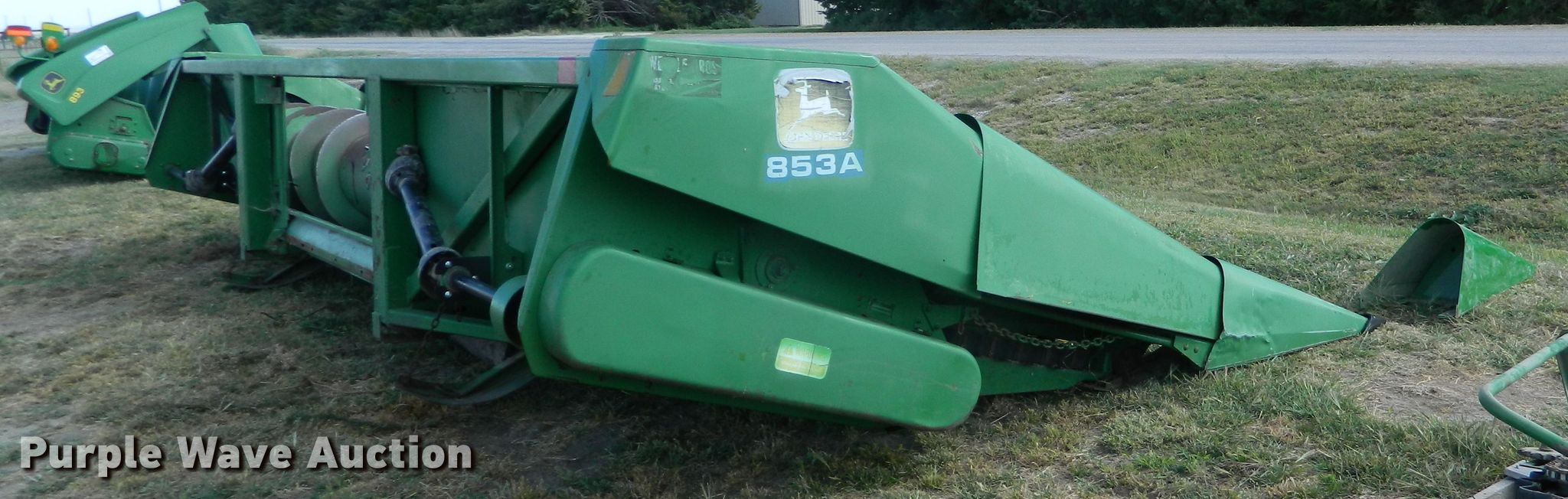 Purple Wave is selling a used Corn or Row Head in Kansas. This item is a 1983 John Deere 853A all-crop head with the following: Eight rows, 30" row spacing, Dual drivelines, Additional snouts and parts, Serial H00853A600025