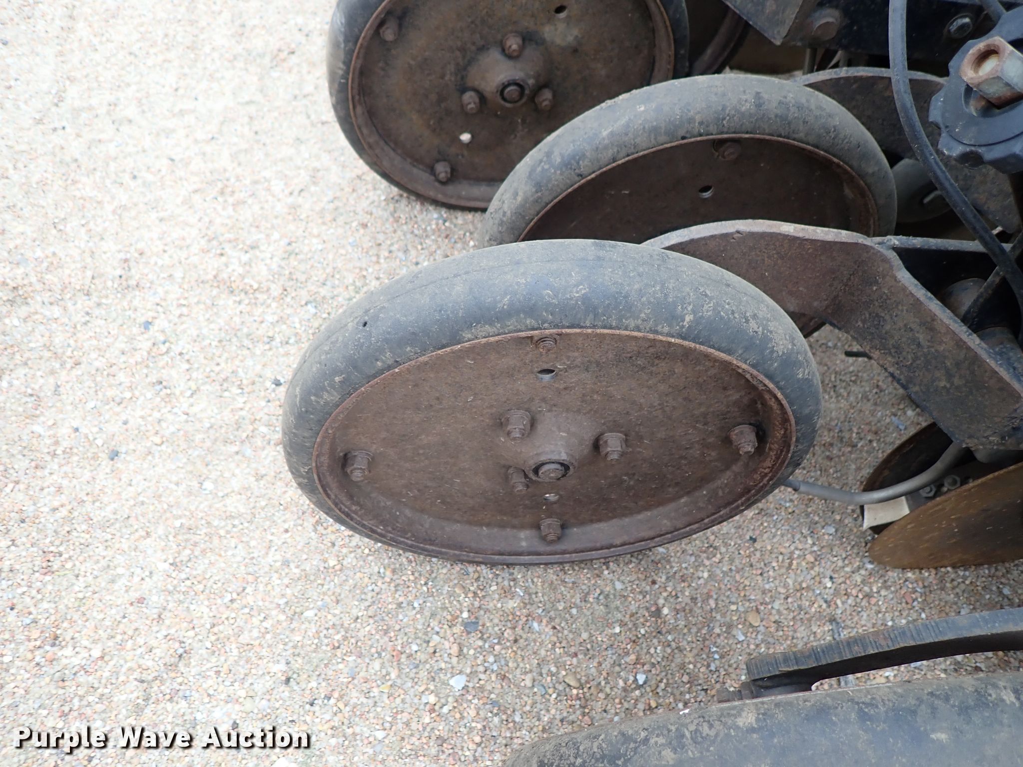 Purple Wave is selling a used Grain Drill or Seeder in Kansas. This item is a Great Plains Solid Stand 30 grain drill with the following: 30'W, 48 row units, 7.5" row spacing, Hydraulic lift and fold, Marker arms, Hydraulic fold, Bulk fill system, Spring down pressure, Double disk openers, Rubber press wheels, 9.5L-15 transport tires, Serial GP-2264G
