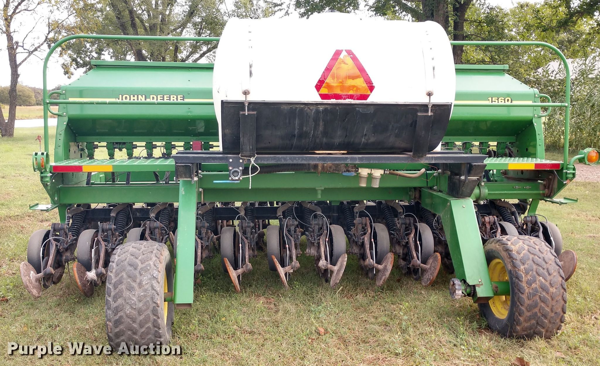 Purple Wave is selling a used Grain Drill or Seeder in Kansas. This item is a John Deere 1560 no-till grain drill with the following: 14.5'W, 7.5" row spacing, Ground meter drive, Cast closing wheels, 300 gallon poly fertilizer tank, Three point swivel quick attach, 31x13.50-15 tires, Serial N011560X695526
