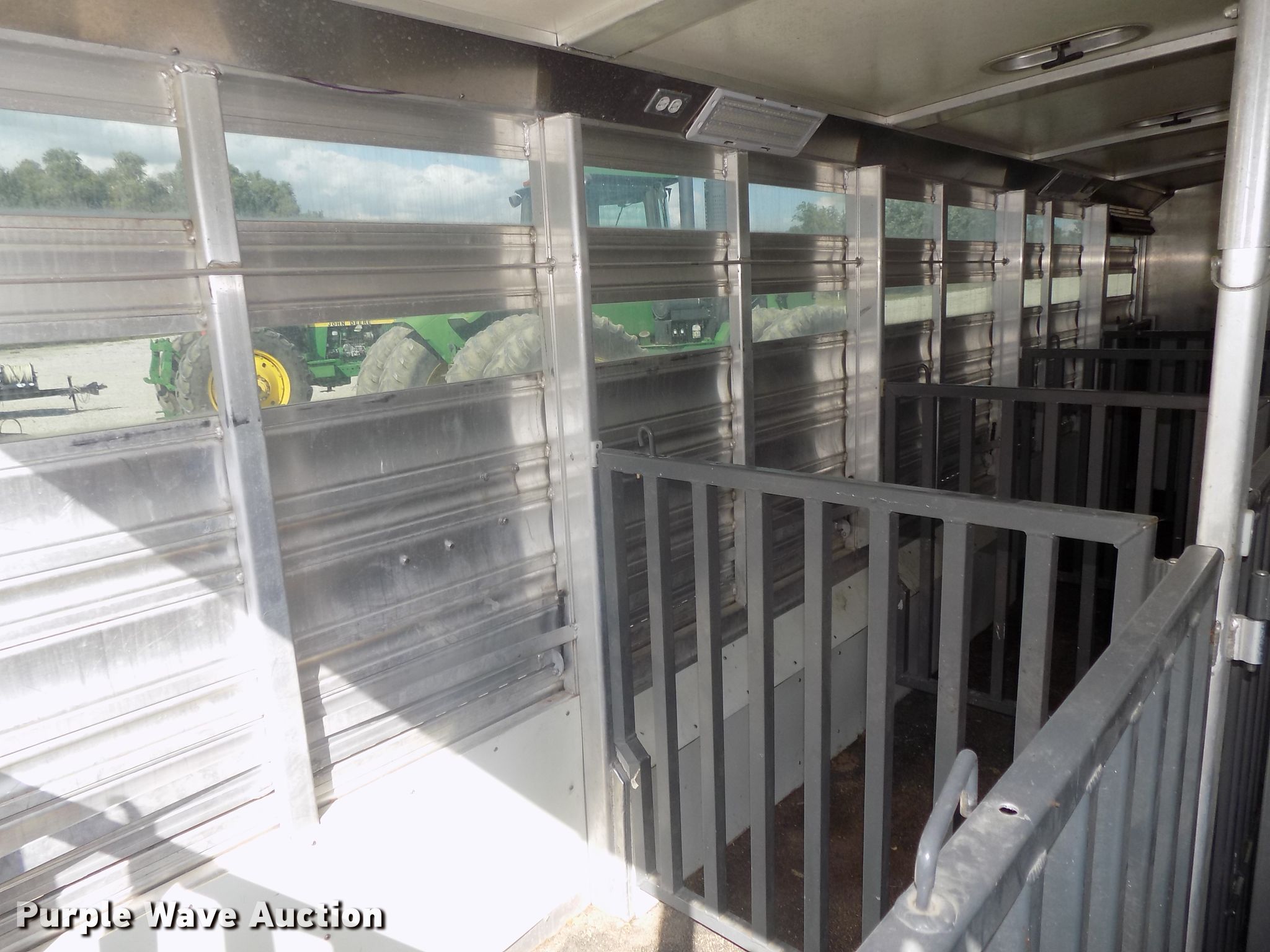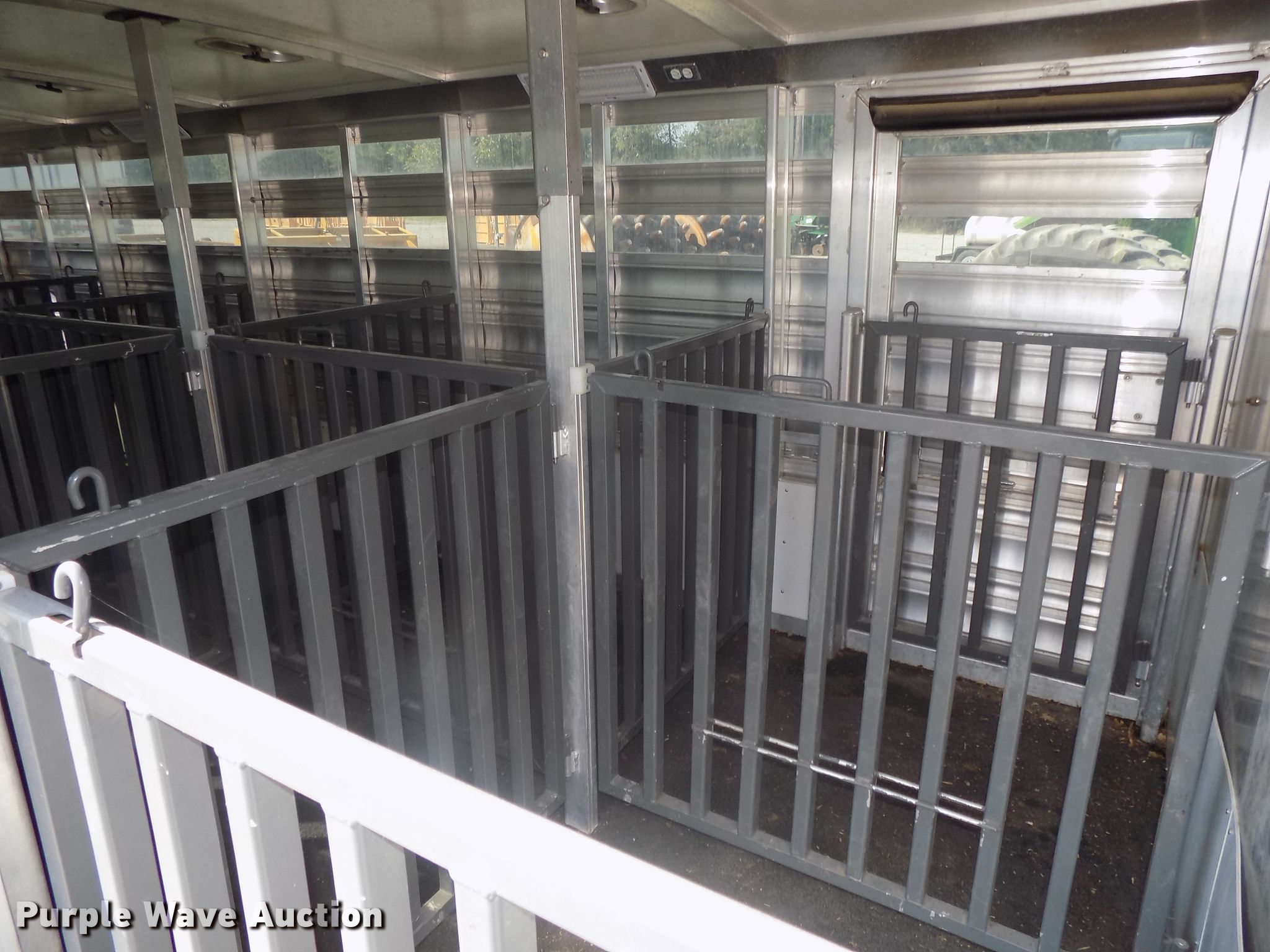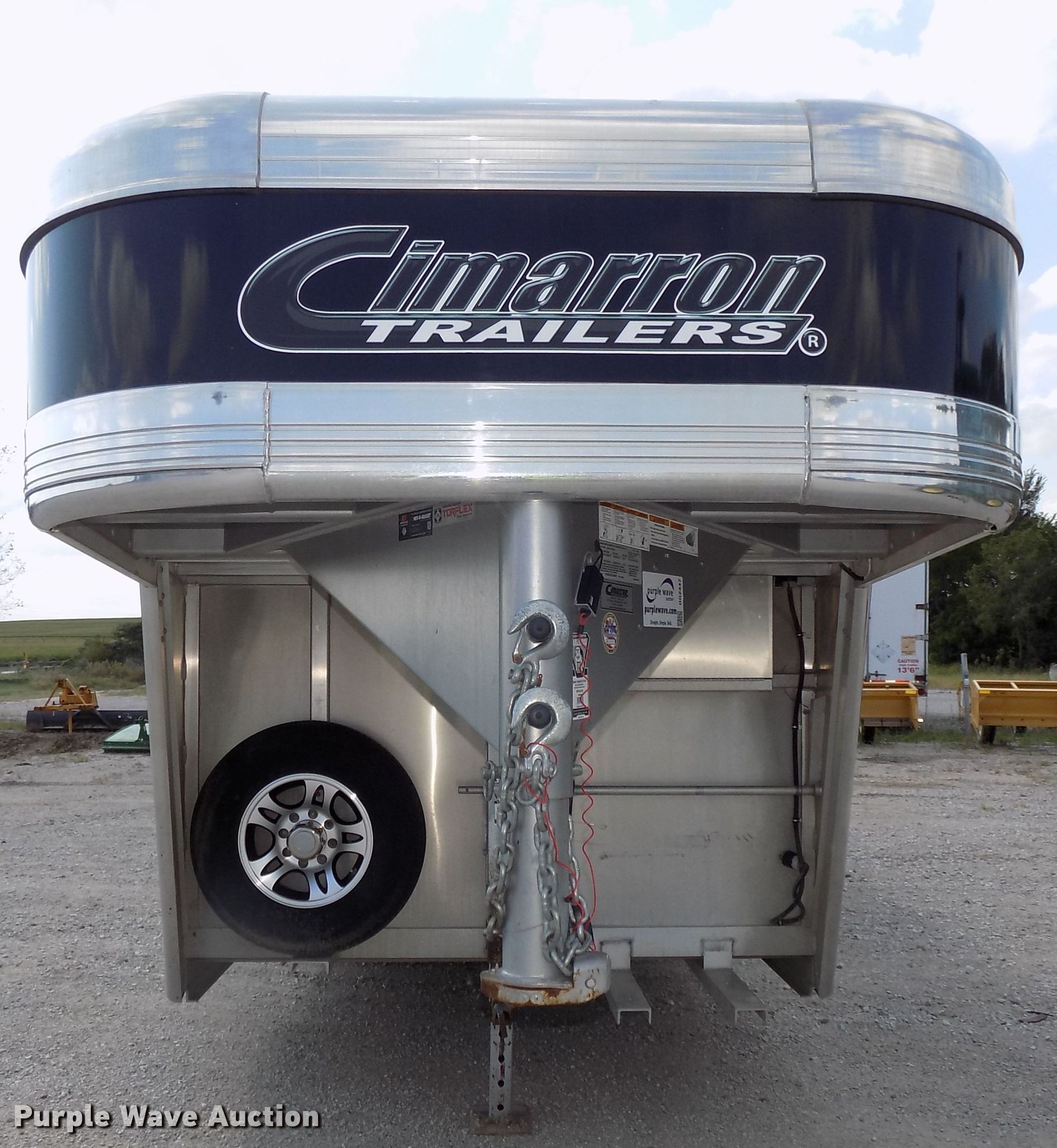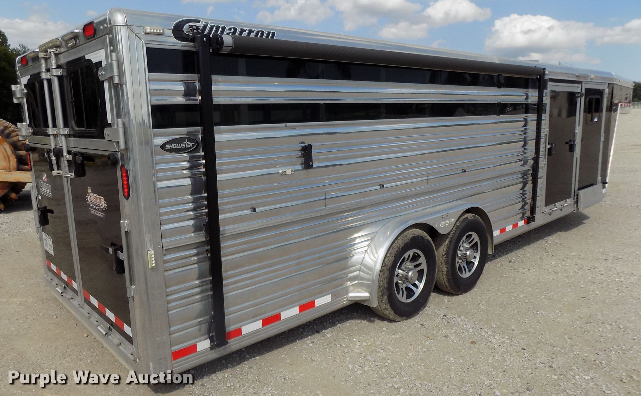 Purple Wave is selling a used Livestock Trailer in Nebraska. This item is a 2014 Cimarron Showstar livestock trailer with the following: 32'L x 102"W overall, 24'L x 88"W body, 81" to 88"W interior, 73"H I.D., (15) divider gates, (5) centered gates, 10 individual pen max setup, Adjustable gates, 47"L x 42"W individual pens, Tuthill Fill-Rite DC pump, Awning, Aluminum construction, Single leg landing gear, Electric brakes, Tandem torsion axles, Aluminum wheels, ST235/80R16 tires, GVWR 13,680 lbs, GAWR 6,840 lbs