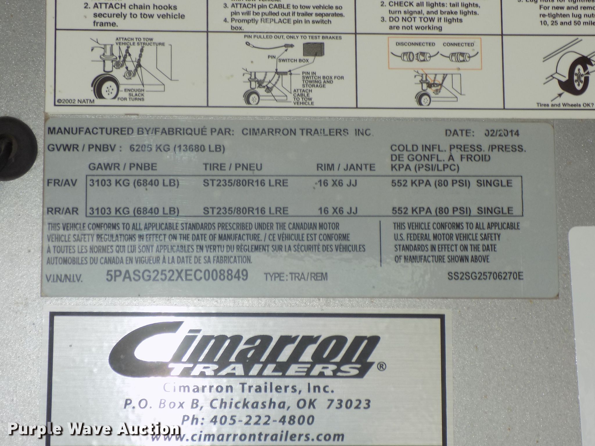 2014 Cimarron Showstar livestock trailer. 32'L x 102"W overall, 24'L x 88"W body 81" to 88"W interior, 73"H I.D., (15) divider gates (5) centered gates, 10 individual pen max setup Adjustable gates, 47"L x 42"W individual pens, Tuthill Fill-Rite DC pump, Awning, Aluminum construction, Single leg landing gear, Electric brakes, Tandem torsion axles, Aluminum wheels, ST235/80R16 tires, GVWR 13,680 lbs, GAWR 6,840 lbs. Nebraska title. 5PASG252XEC008849. Gana Trucking & Excavating, Inc.. 2200 W Panama Rd. Martell, NE 68404