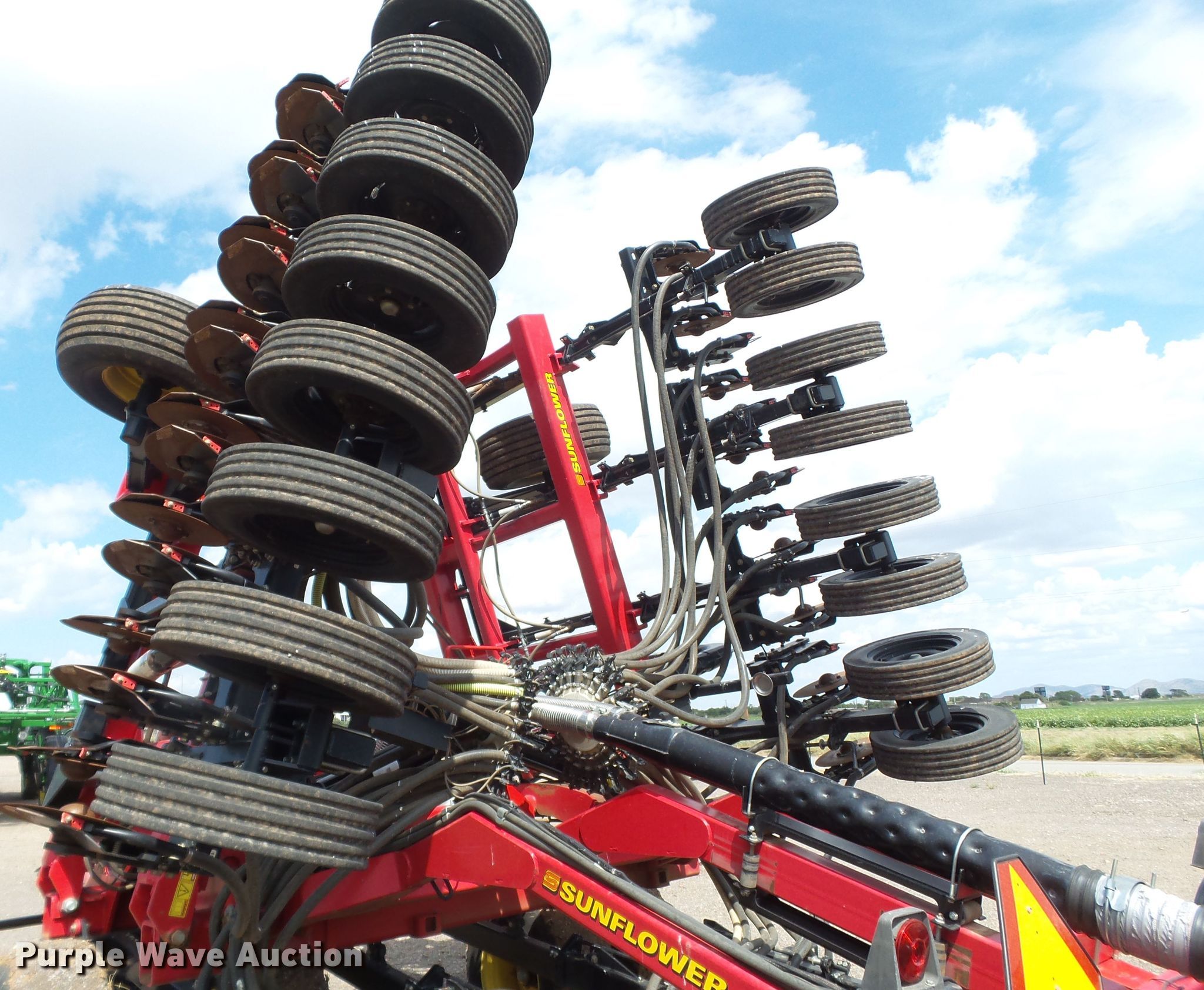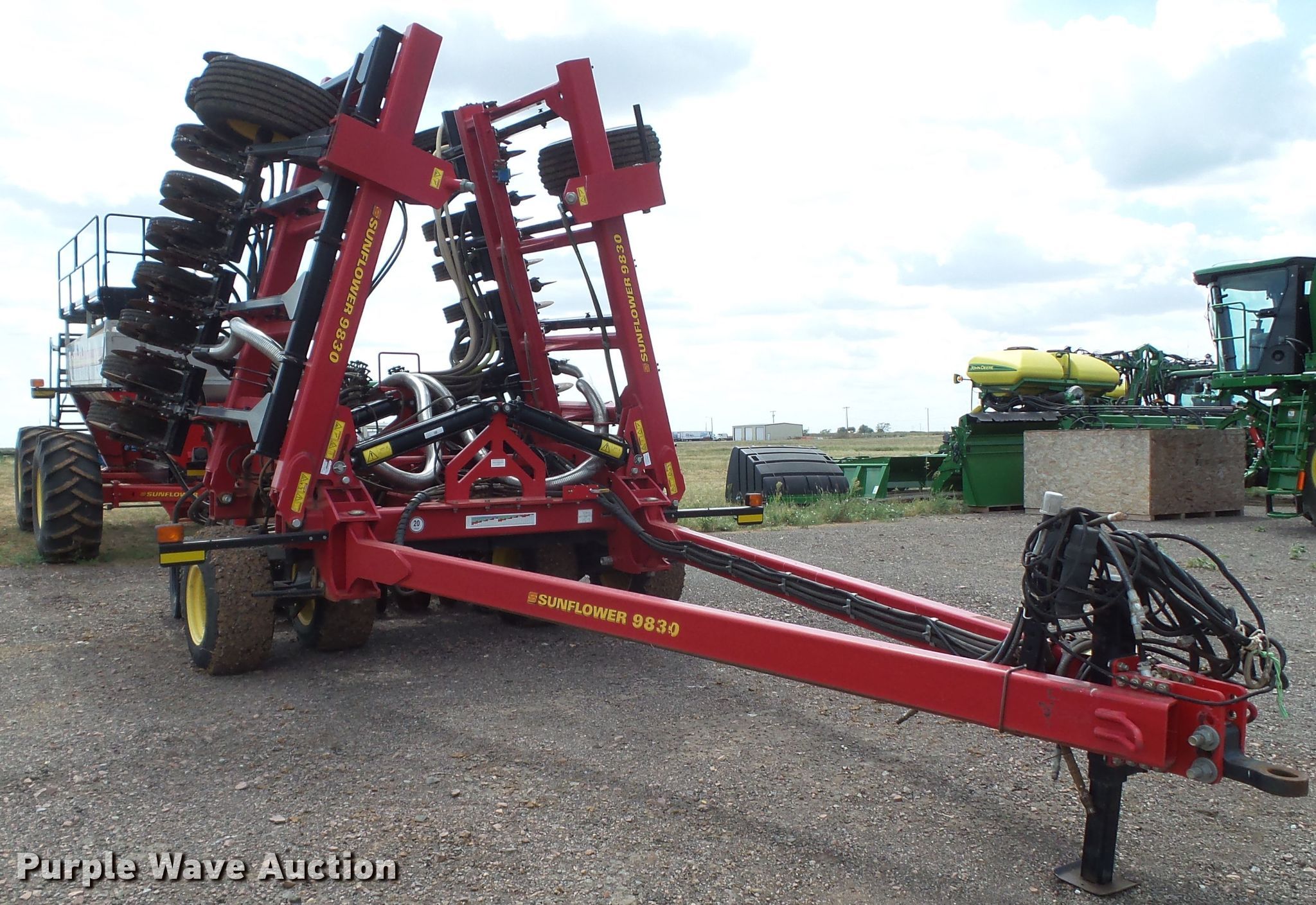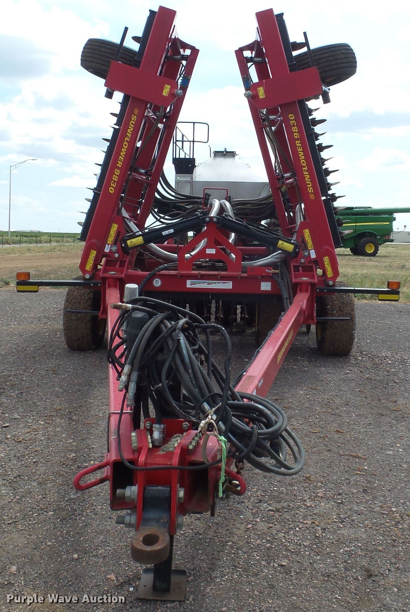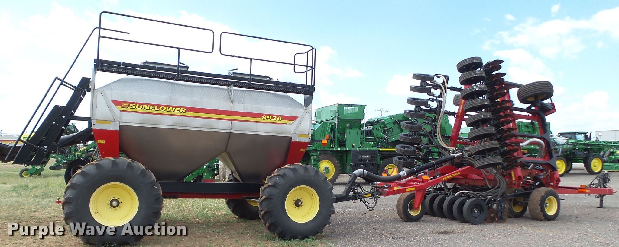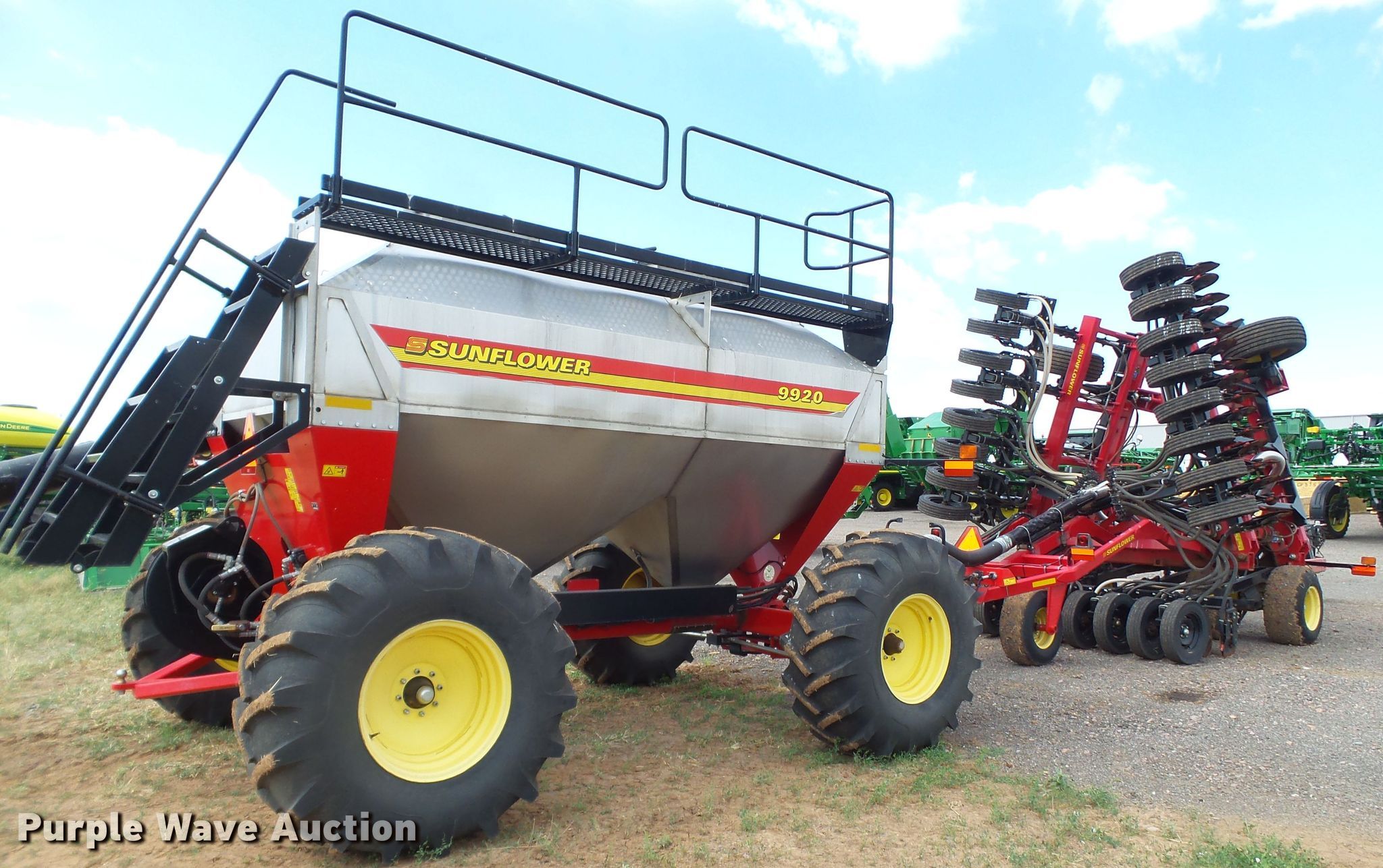 Purple Wave is selling a used Air Seeder in Oklahoma. This item is a 2013 Sunflower 9830 air seeder with the following: 30'W, 48 row units, 7.5" row spacing, Hydraulic wing fold, Bulk fill system, 335 bushel capacity, Sunflower 9920 air commodity cart, Hydraulic fill auger, Serial AGCS99335DX702186, No-till coulters, Single disk openers, Single gauge wheels, Seed firmers, Single rubber closing system, Sunflower monitor, (6) 440/55R18 transport tires, Serial AGCS98330DX461929