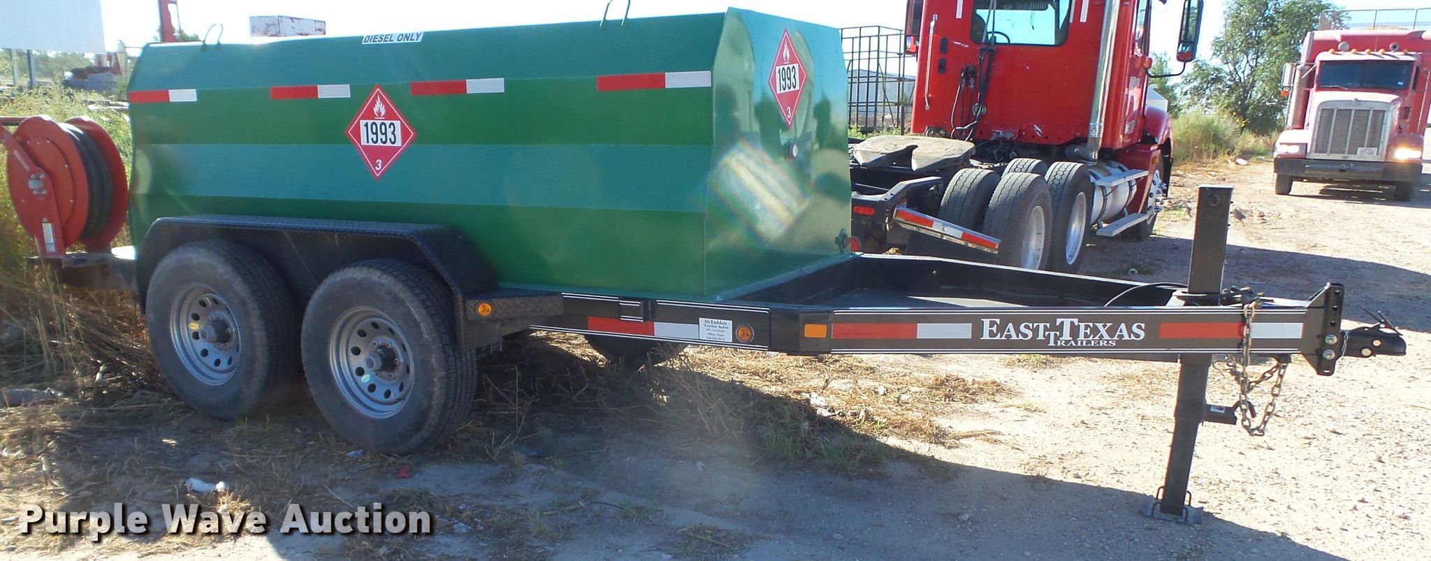 Purple Wave is selling a used Tank Trailer in Texas. This item is a 2018 East Texas fuel tank trailer with the following: 225'L x 8'W overall, 10' x 57" tank, Honda GX160 gas engine, MP pump, Hose reel, Meter, Nozzle, 2 5/16" ball hitch, Single leg landing gear, Spring suspension, Tandem axle, 235/80R16 tires, GVWR 10,400 lbs