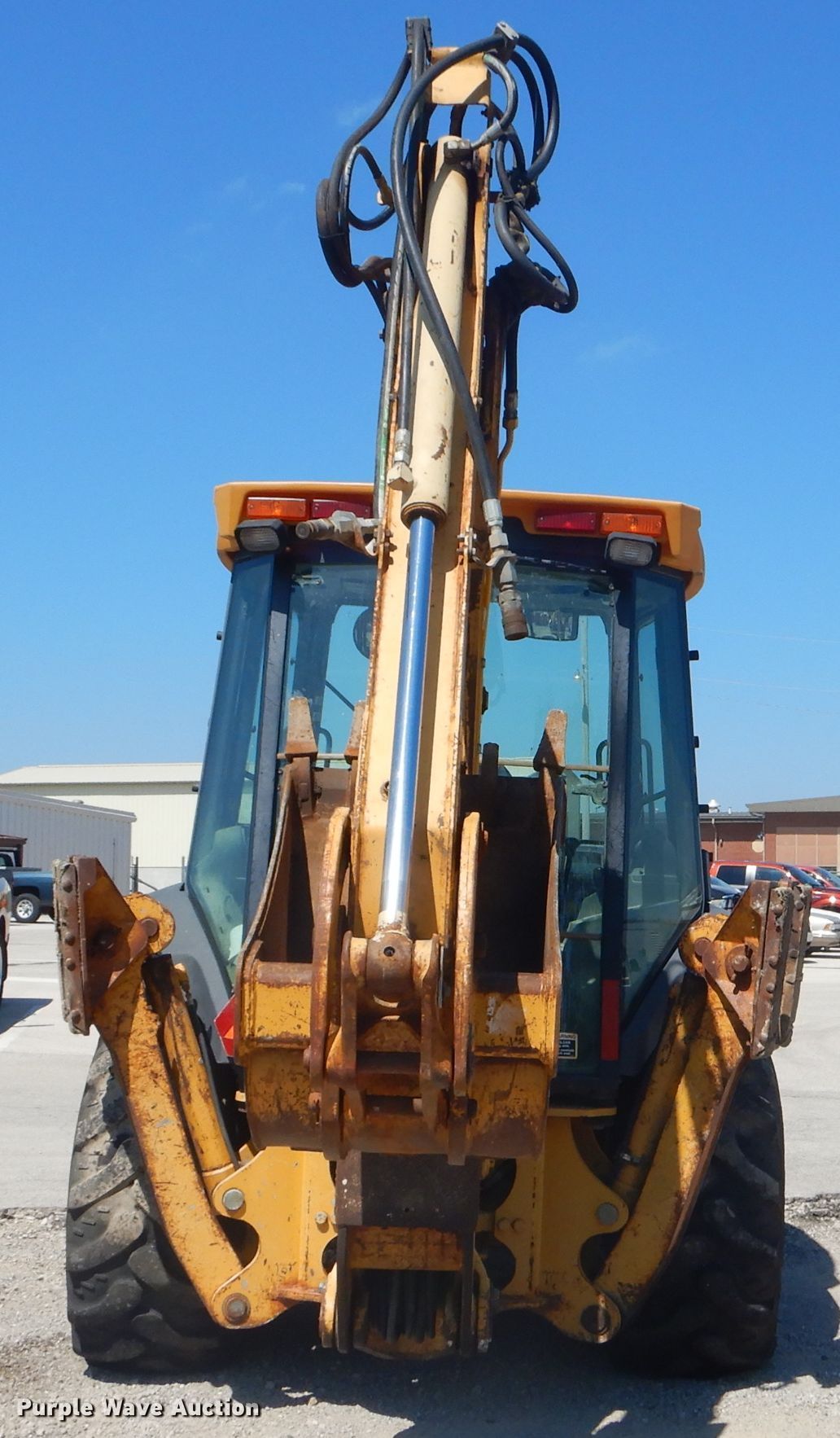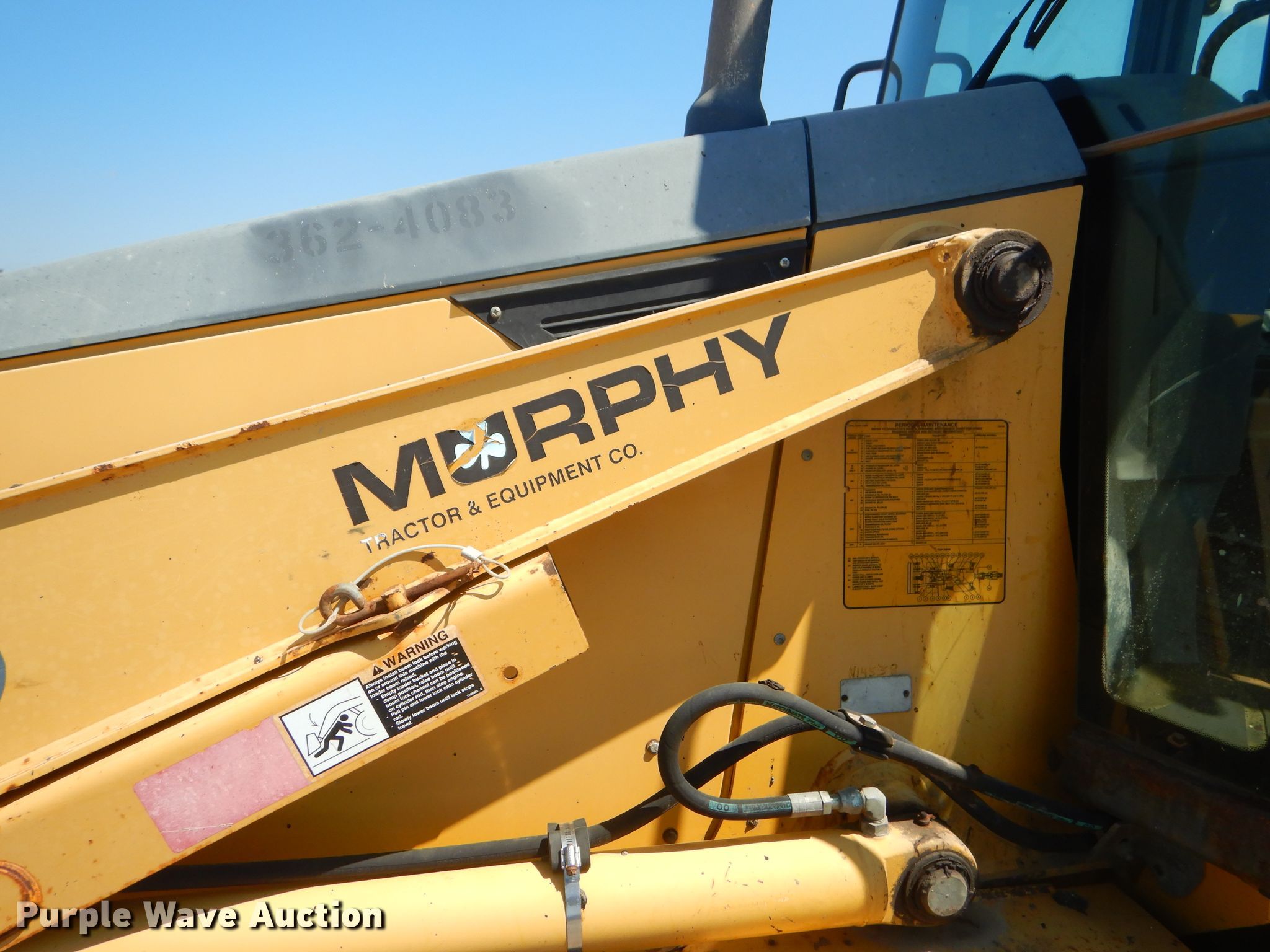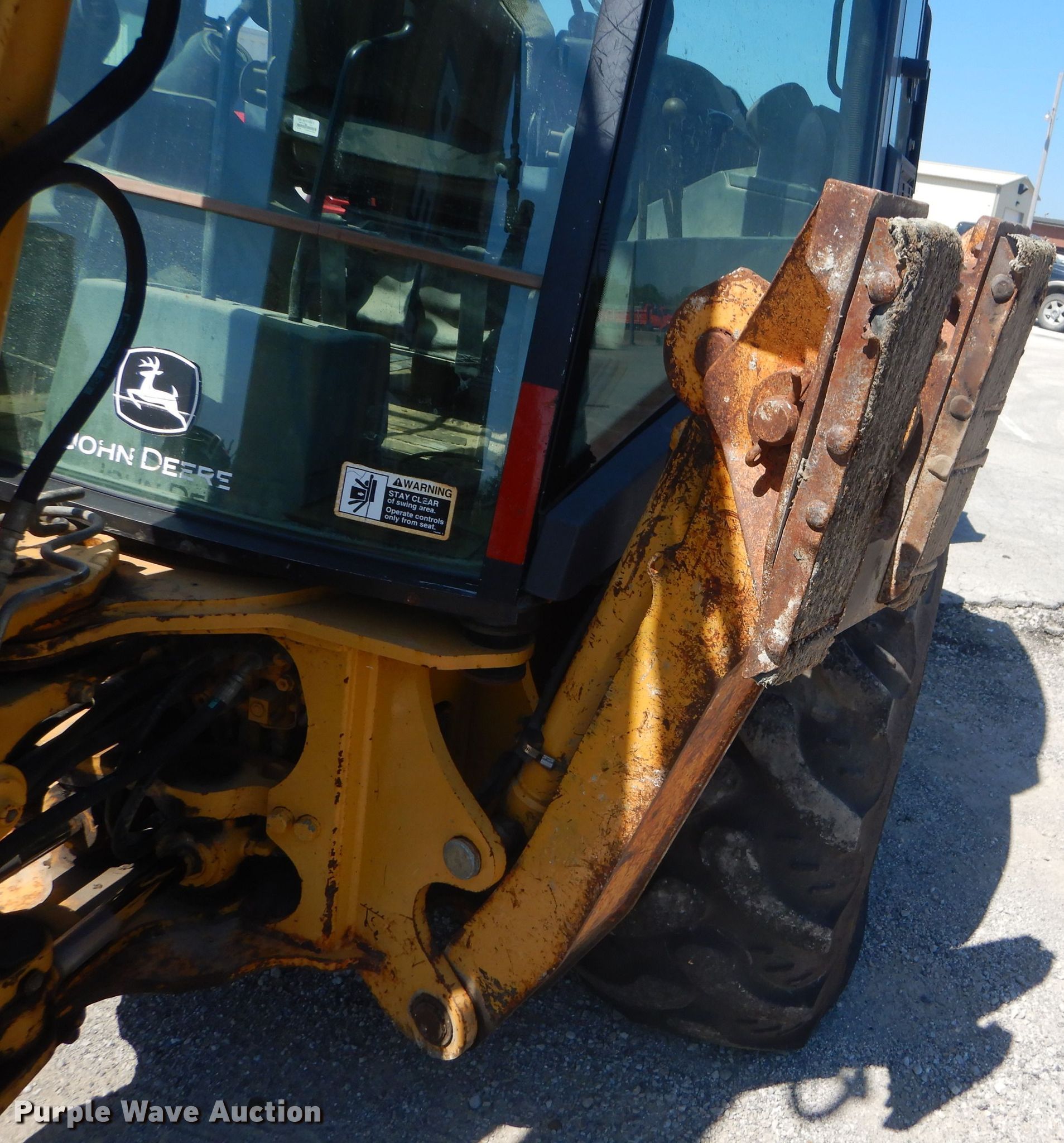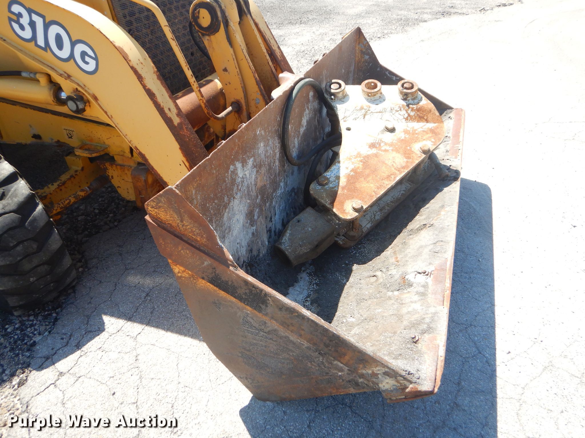 Purple Wave is selling a used Tractor Loader Backhoe in Kansas. This item is a 2003 John Deere 310G backhoe with the following: 5,585 hours on meter, John Deere 4945 4.5L four cylinder diesel engine, Shuttle shift transmission, 4F-4R gears, Four wheel drive, Enclosed cab, AC and heat, Wobble stick backhoe controls, 84"W loader bucket, Bolt-on cutting edge, Extendable stick backhoe, 24"W backhoe bucket, (5) teeth, Bolt-on cutting edge, Kent KF5 hammer, Serial 6416, 12-16.5 front tires, 19.5L-24 rear tires, Serial T0310GX923911, KDOT ID 362-4083