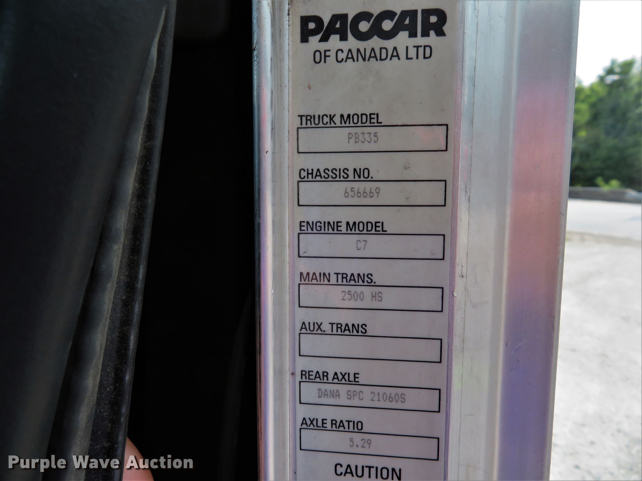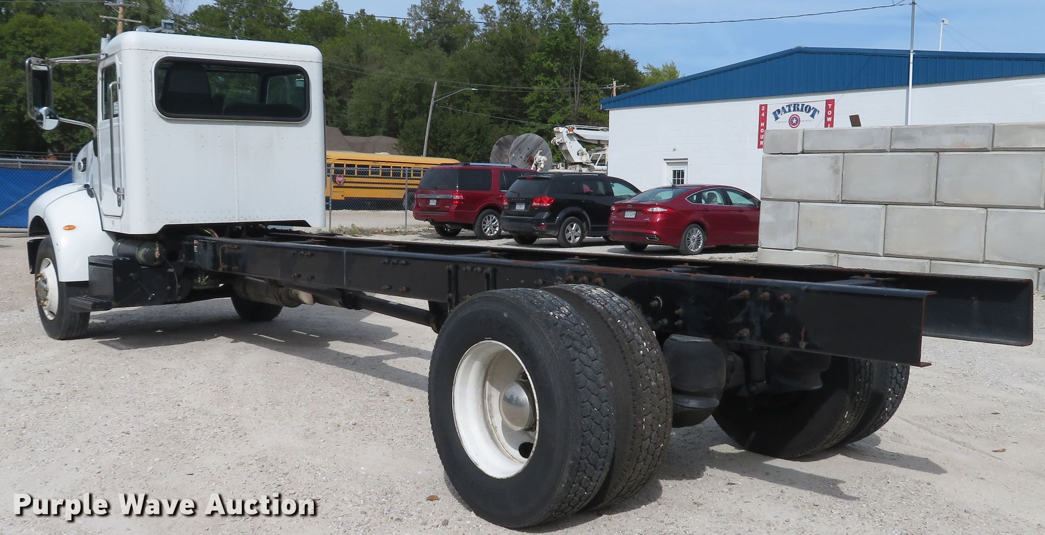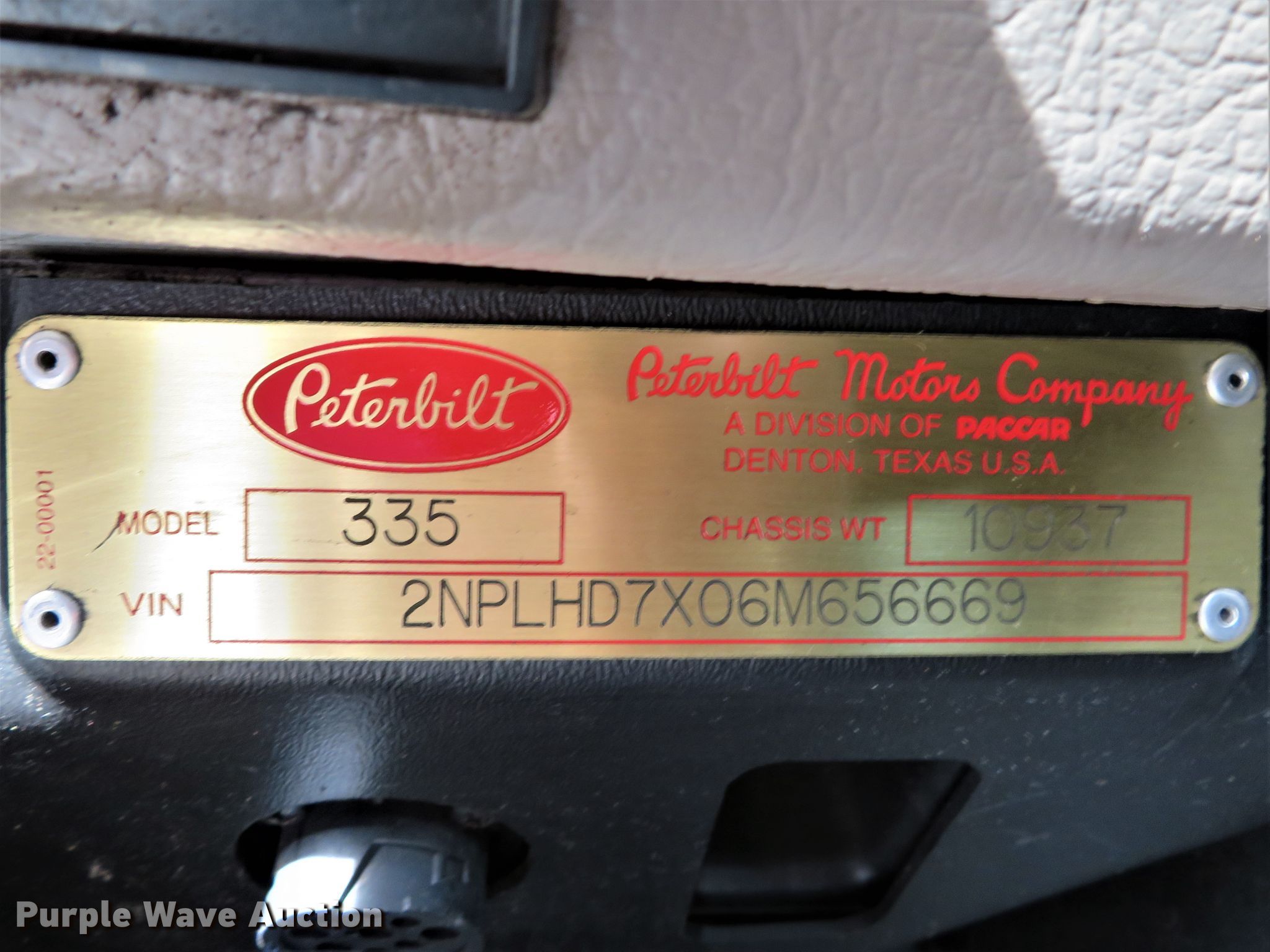 Purple Wave is selling a used Truck Chassis in Missouri. This item is a 2006 Peterbilt 335 truck cab and chassis with the following: 206,789 miles on odometer, 10,037 hours on meter, Caterpillar C7 7.2L L6 diesel engine, Automatic transmission, Single axle, AC and heat, Cruise, Power window, Single fuel tank, 263" from rear of cab to rear of frame, 204" from rear of cab to center of rear axle, Air suspension, Air brakes, 273" wheelbase, 295/75R22.5 tires, GVWR 33,000 lbs, FAWR 12,000 lbs, RAWR 21,000 lbs