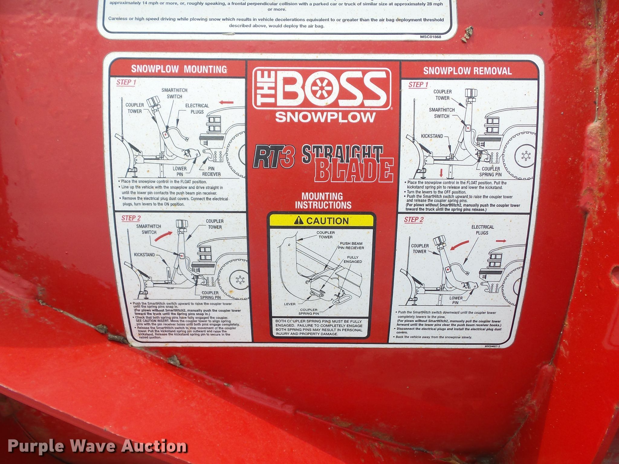 Purple Wave is selling a used Automotive Parts or Acces. in Iowa. This item is a Boss RT3 Straight Blade snow plow with the following: 8'W, In-cab controls, System controls, D7638, Mounting bracket, Serial STB03167