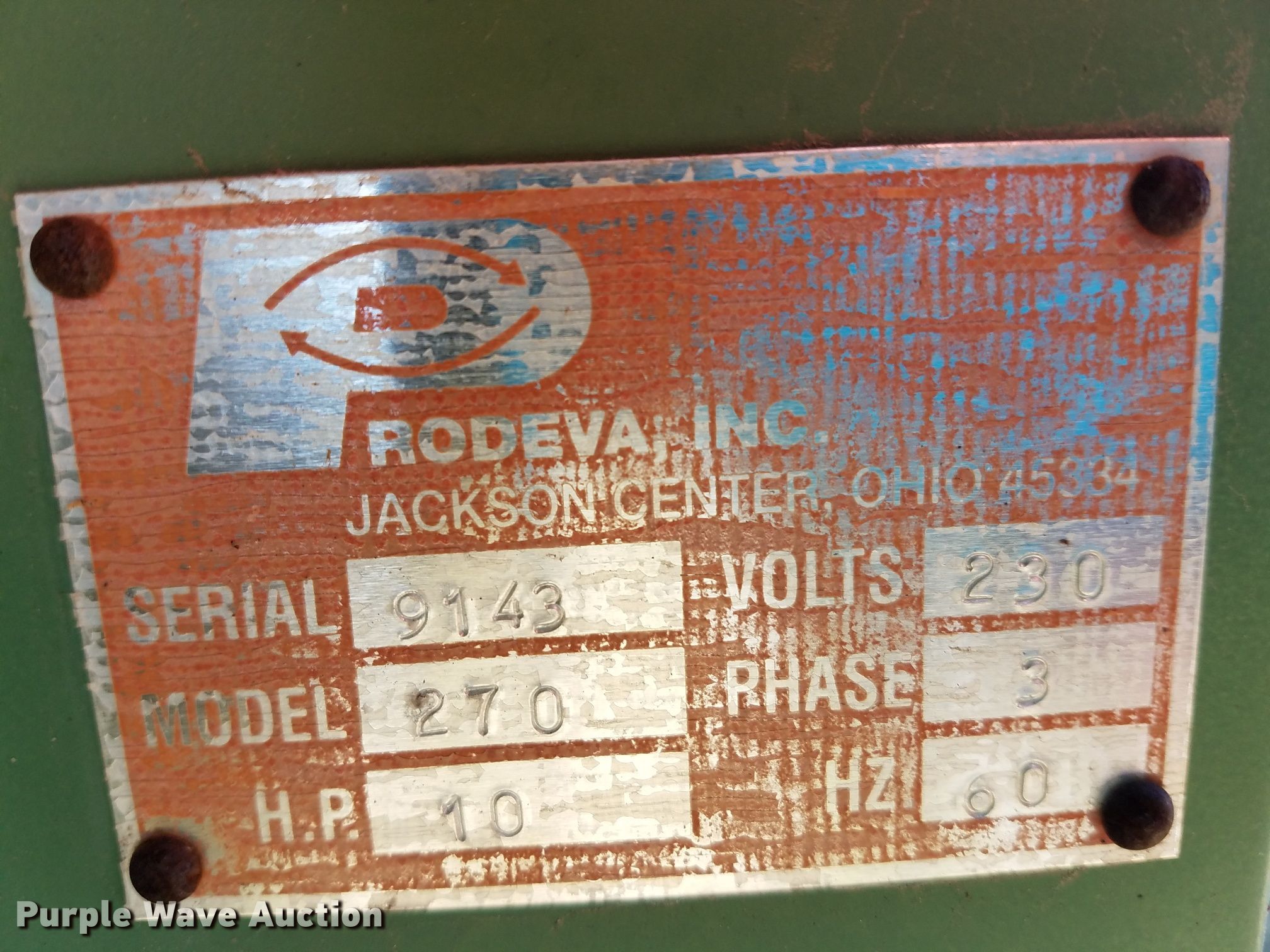 Purple Wave is selling a used Refuse or Compaction Equip. in Nebraska. This item is a Rodeva 270 glass recycler with the following: 240V electric motor, 10 HP, Three phase, Forward/reverse controls, Adjustable feed control, Unknown operating condition, Serial 9143