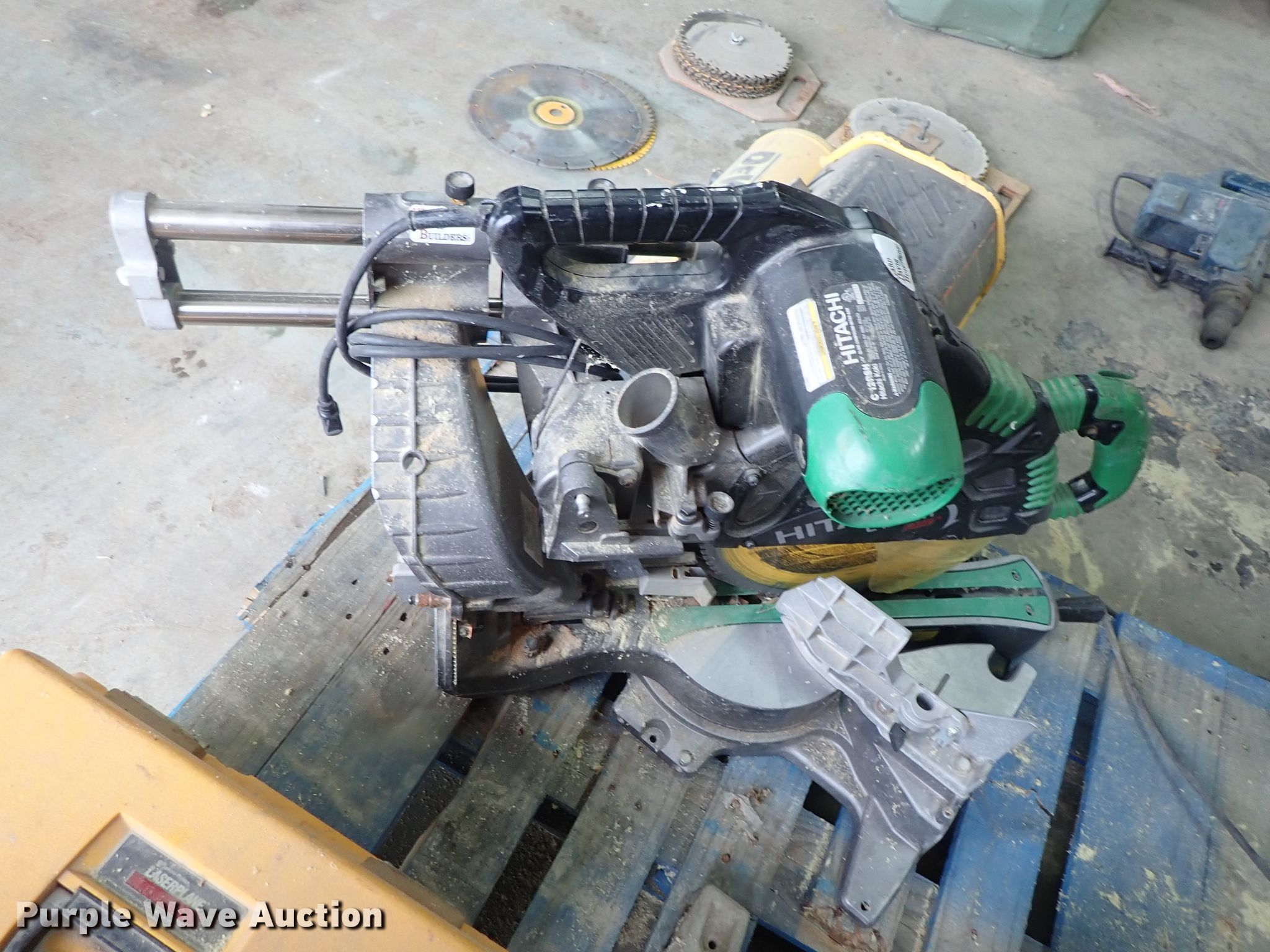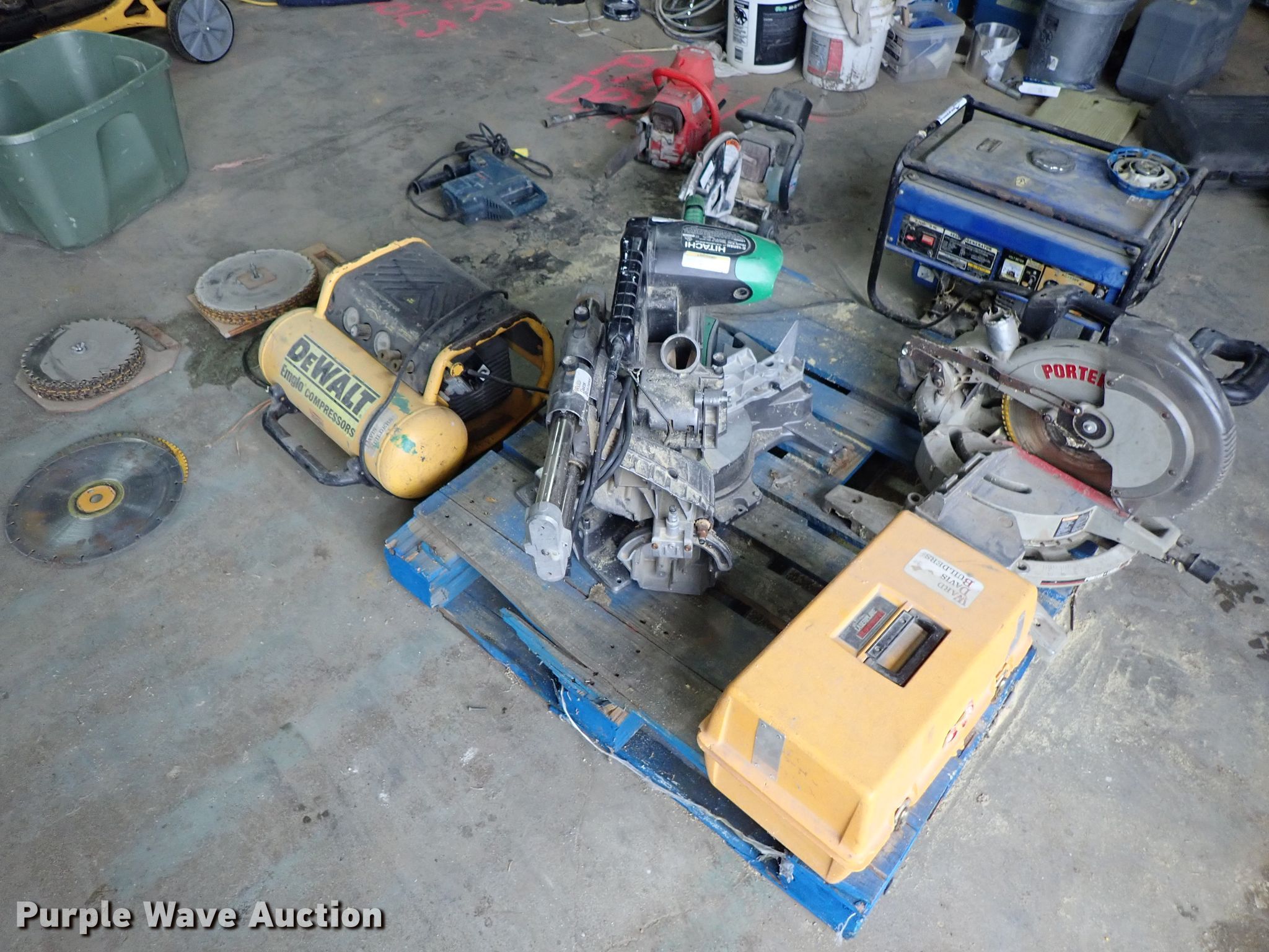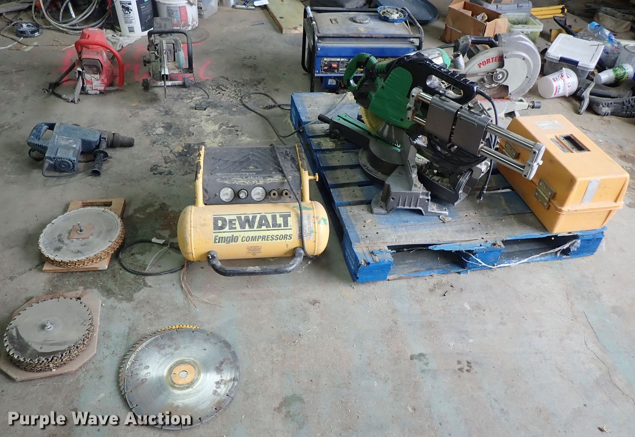 Purple Wave is selling a used Tools in Kansas. This item is a Tools with the following: Hitachi miter saw, 12", Porter miter saw, 12", Laser Plane 200 laser level, Unknown operating condition, Generator, Gas engine, Unknown operating condition, Cut-off saw, Unknown operating condition, Chainsaw, Unknown operating condition, Bosch 11227E hammer drill, Unknown operating condition, DeWalt compressor, Unknown operating condition, Saw blades