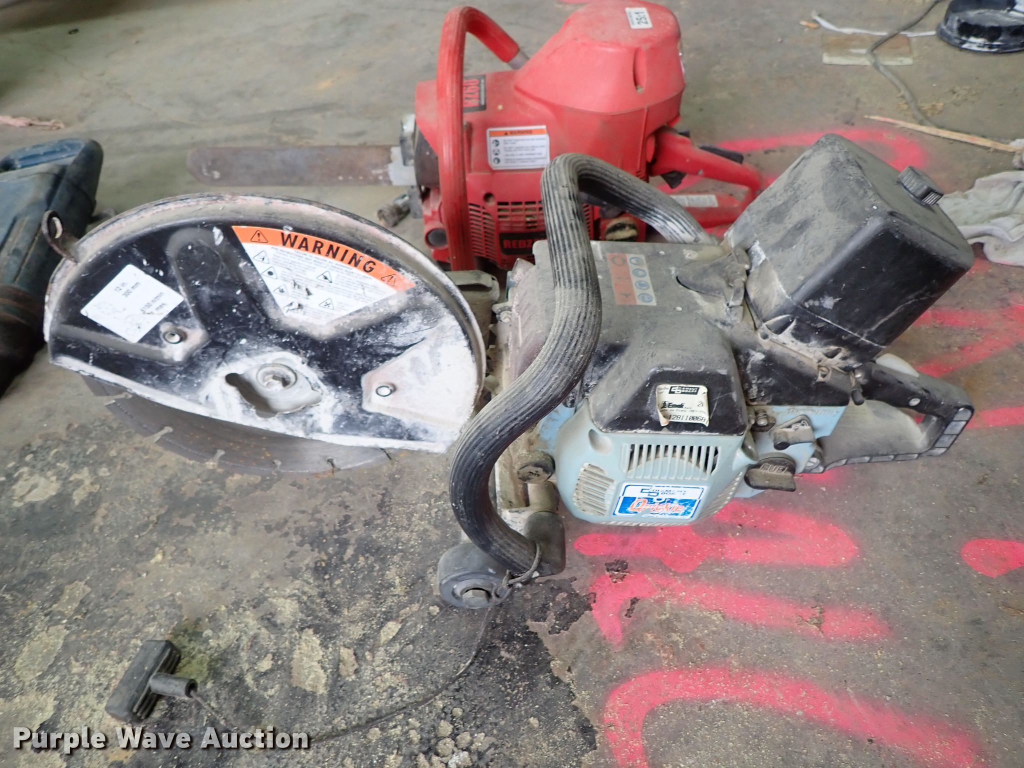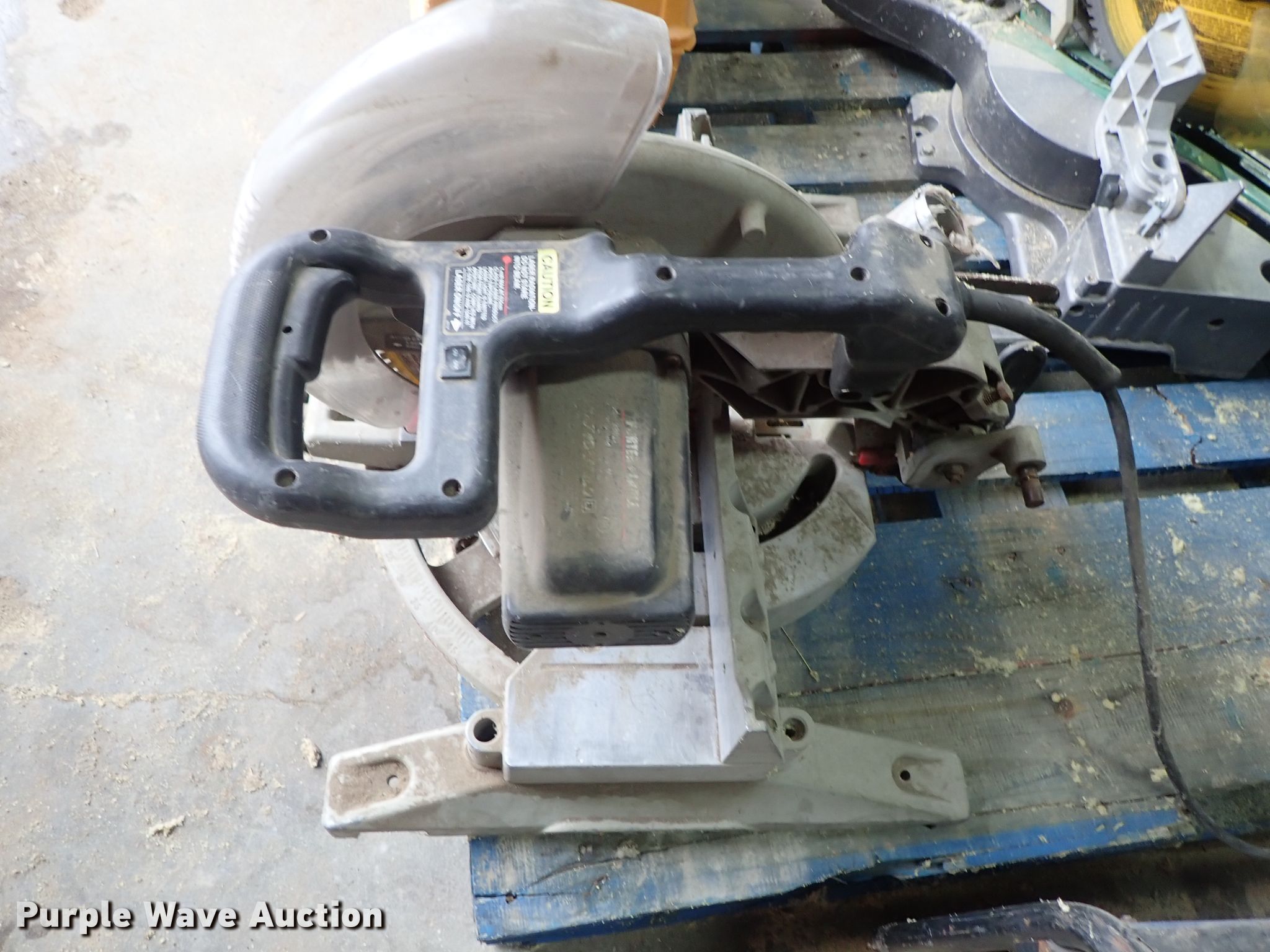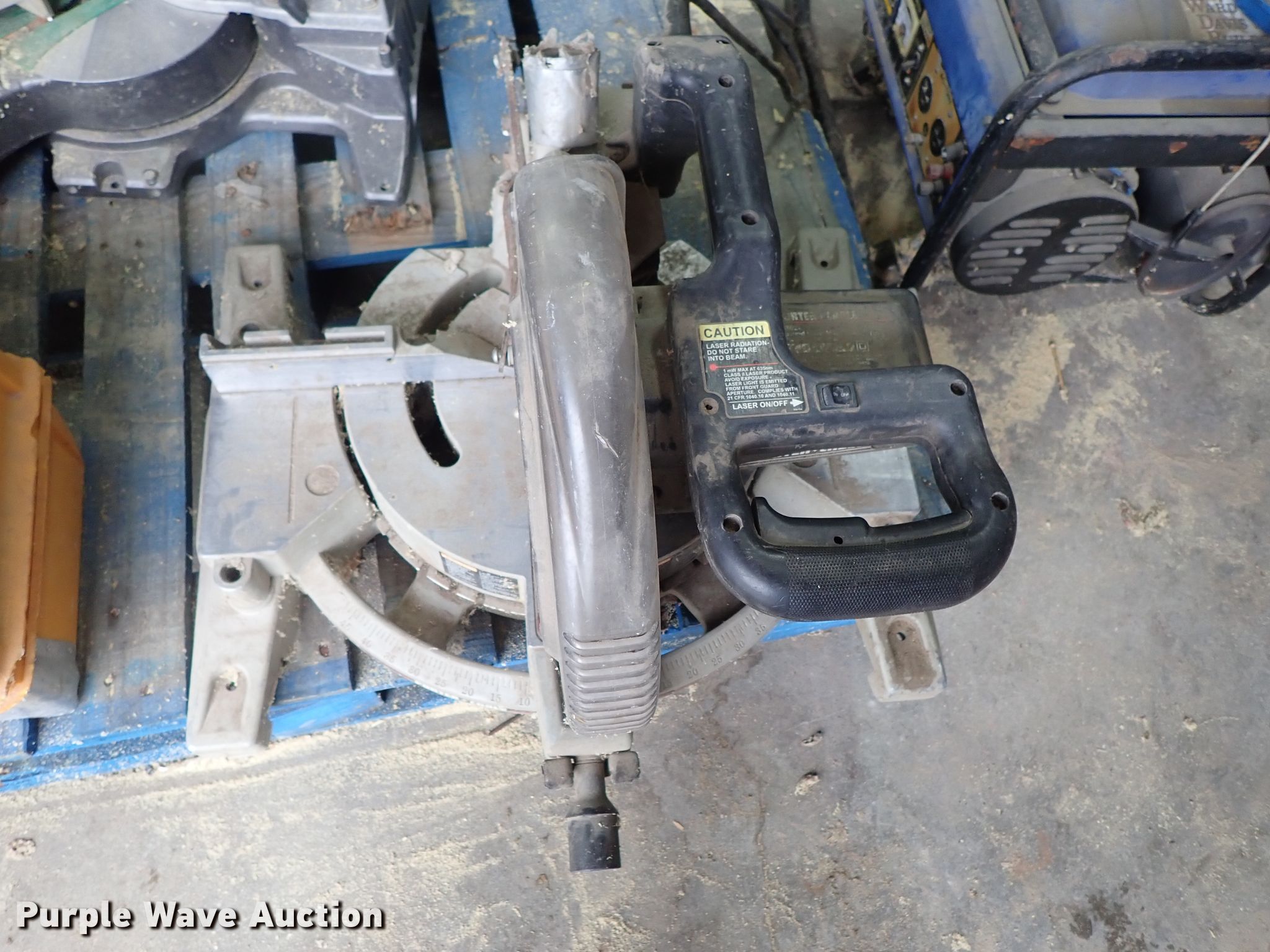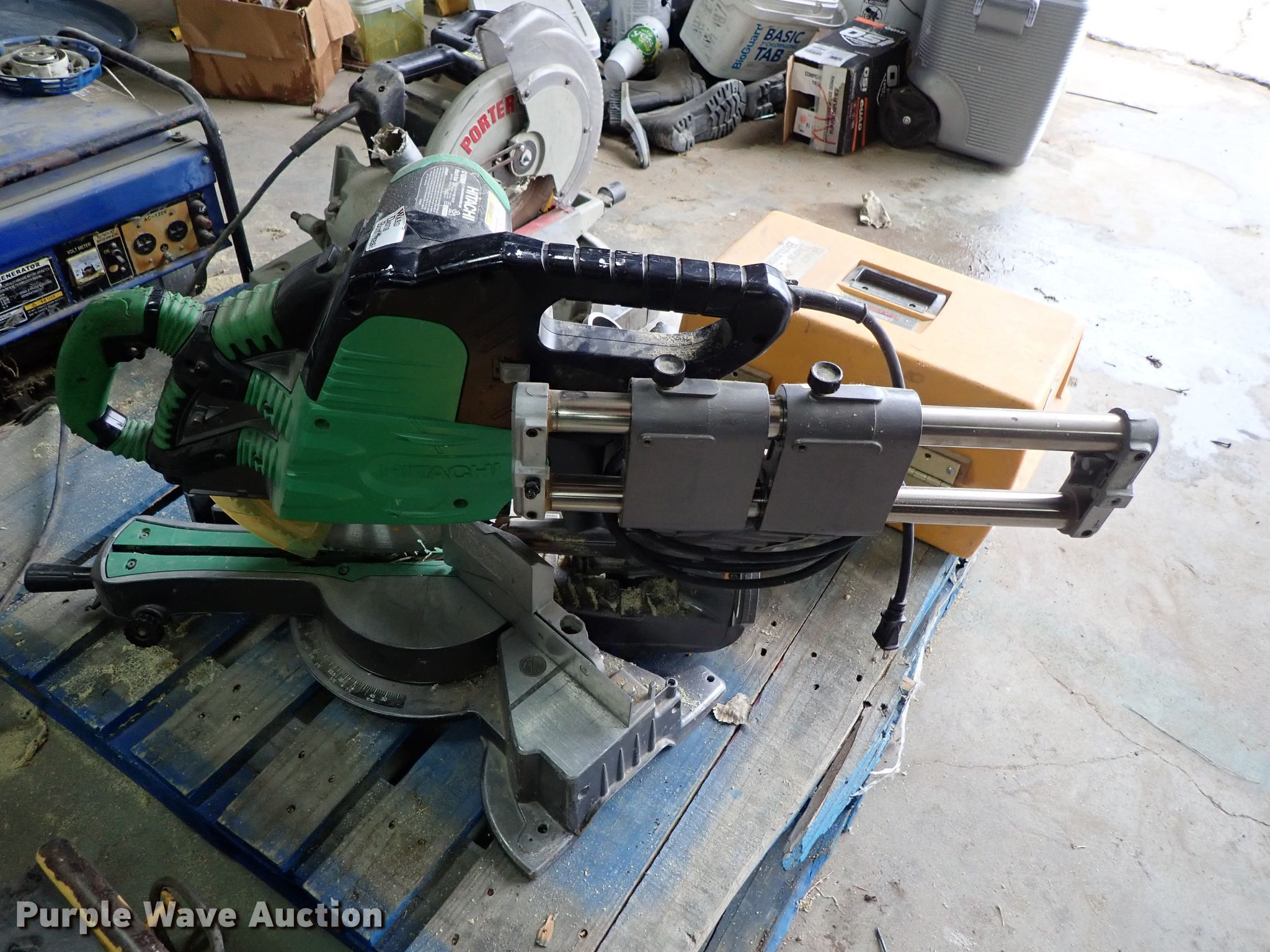Purple Wave is selling a used Tools in Kansas. This item is a Tools with the following: Hitachi miter saw, 12", Porter miter saw, 12", Laser Plane 200 laser level, Unknown operating condition, Generator, Gas engine, Unknown operating condition, Cut-off saw, Unknown operating condition, Chainsaw, Unknown operating condition, Bosch 11227E hammer drill, Unknown operating condition, DeWalt compressor, Unknown operating condition, Saw blades