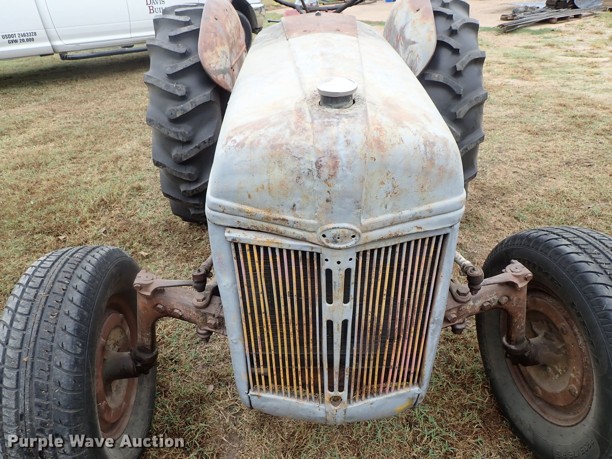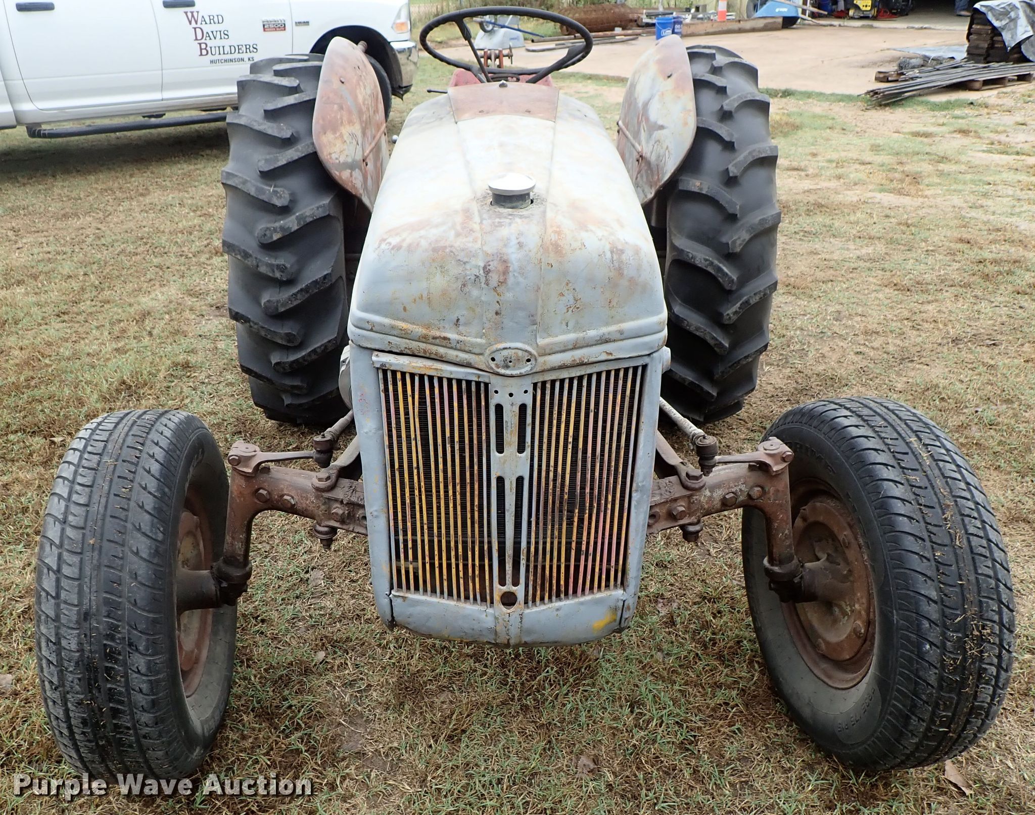 Ford 9N tractor. Four cylinder gas engine, Manual transmission 4F-1R gears, Three point, 540 PTO, Rotary mower 60"W, 540 PTO, 235/75R15 tires, 13.6-28 rear tires, Serial 23172. Ward Davis Builders Inc. Hutchinson, KS 67502