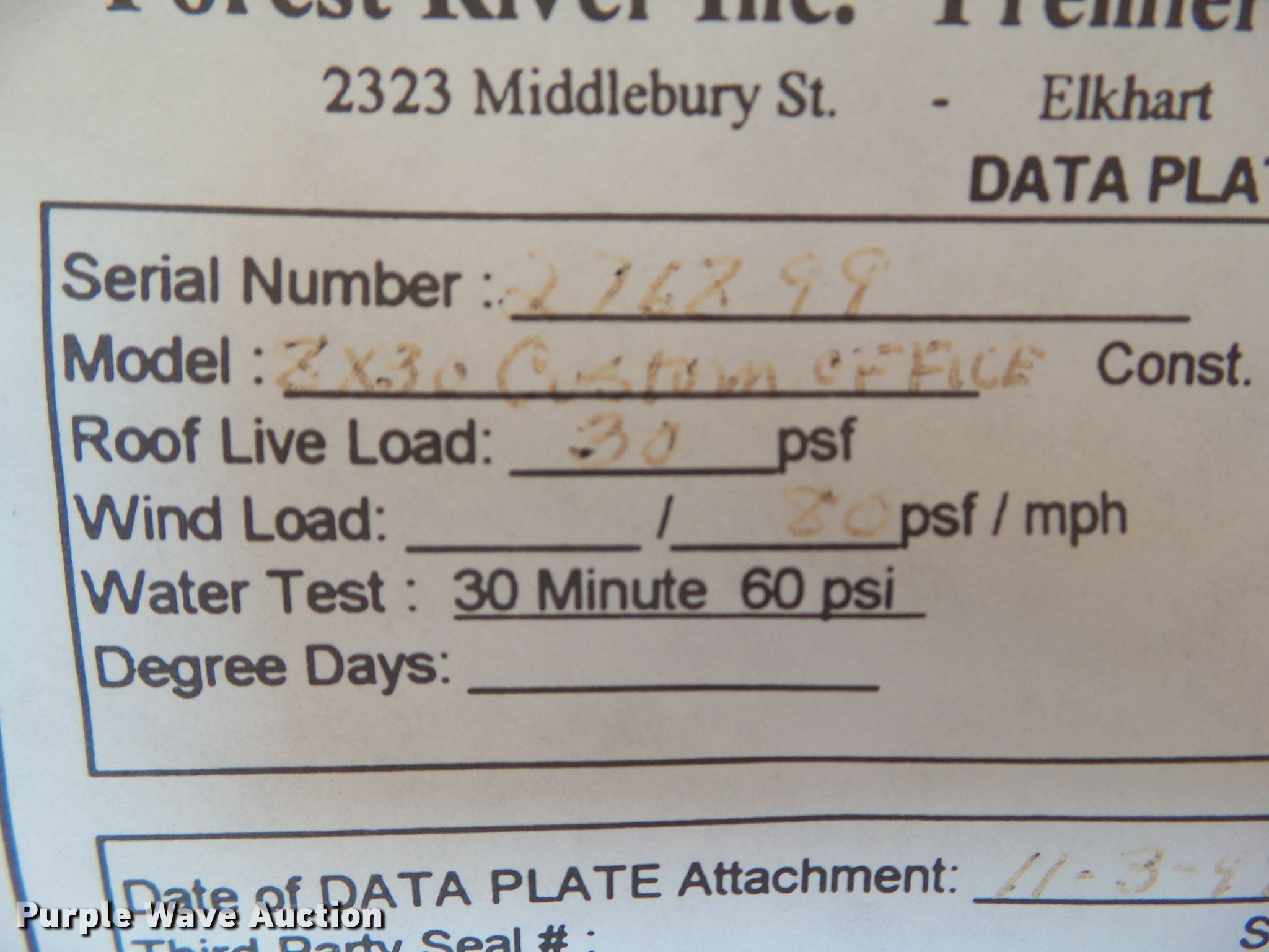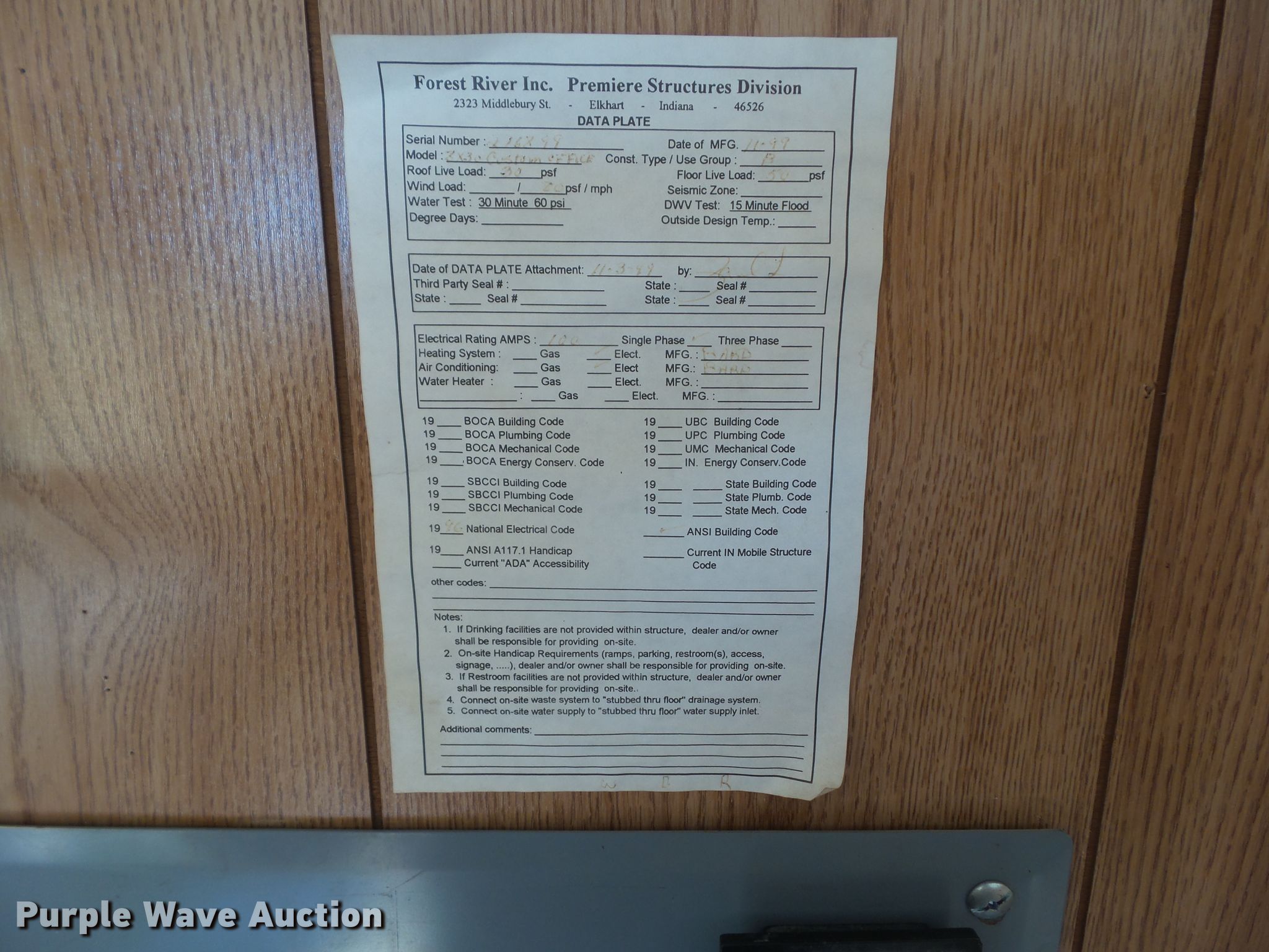 Purple Wave is selling a used Manufactured Home or Office in Iowa. This item is a 1999 Forest River Premiere job site trailer with the following: 29.5'L x 97"W overall dimensions, 7' interior height, 26'L x 89"W interior dimensions, AC and heat, Stairs, 2 5/16" ball hitch, Single leg landing gear, Electric brakes, 8-14.5 tires