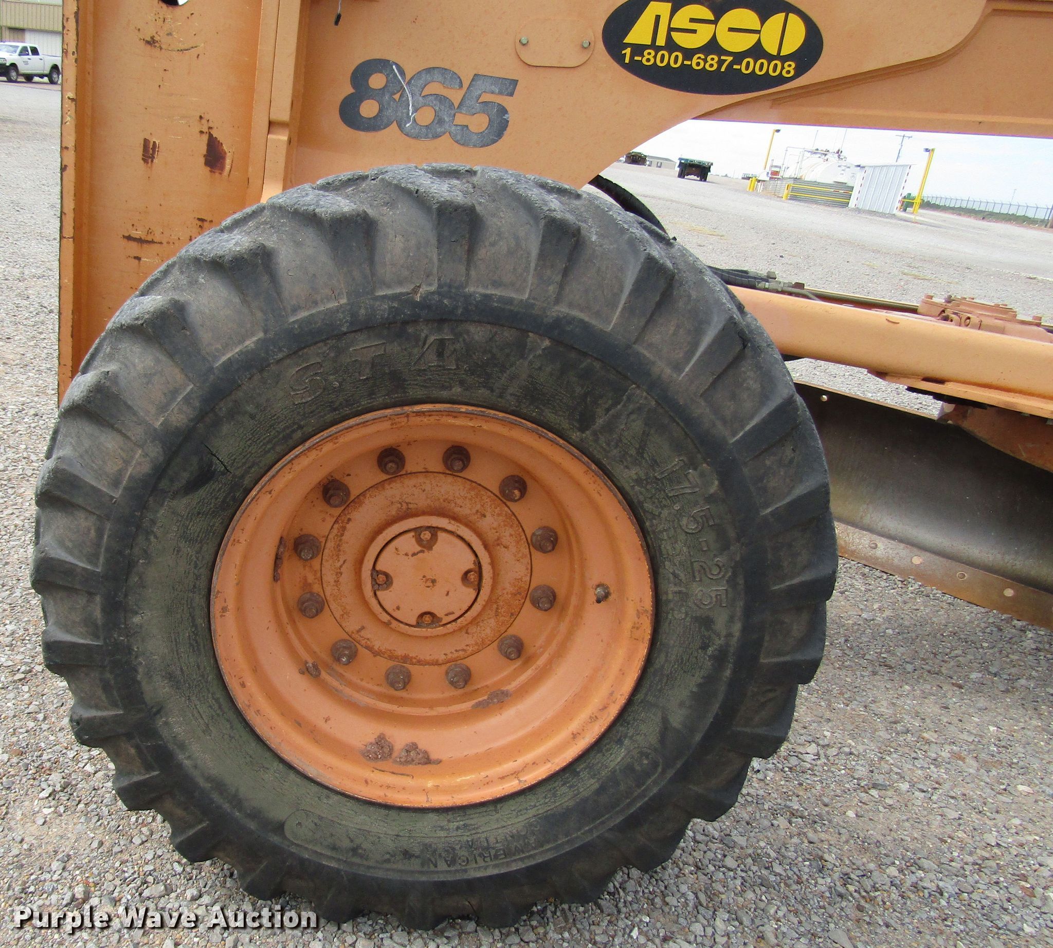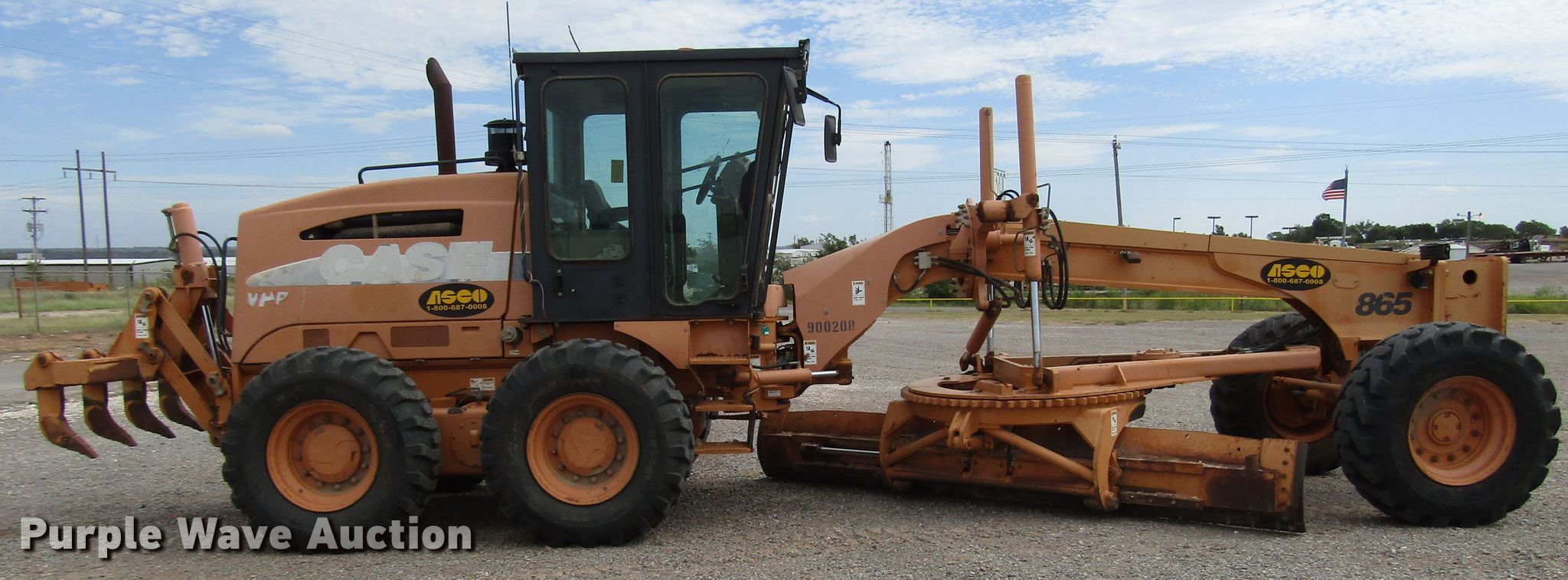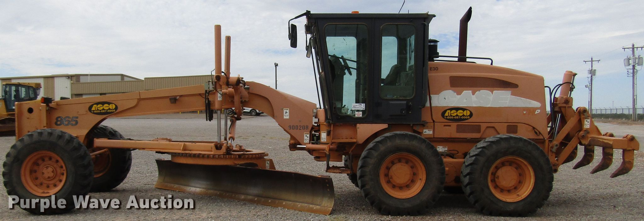 Purple Wave is selling a used Motor Grader in Oklahoma. This item is a 2007 Case 865 motor grader with the following: Cummins QSB6 six cylinder diesel engine, Serial 30918217, Powershift transmission, 8F-4R gears, Enclosed cab, AC and heat, Nine hydraulic control valves, 14'W mold board, Tip controls, Side shift, Circle slip clutch, Rear ripper, (5) shanks, 17.5-25 tires, Uses oil, Serial N7AF04355, Unit# E30