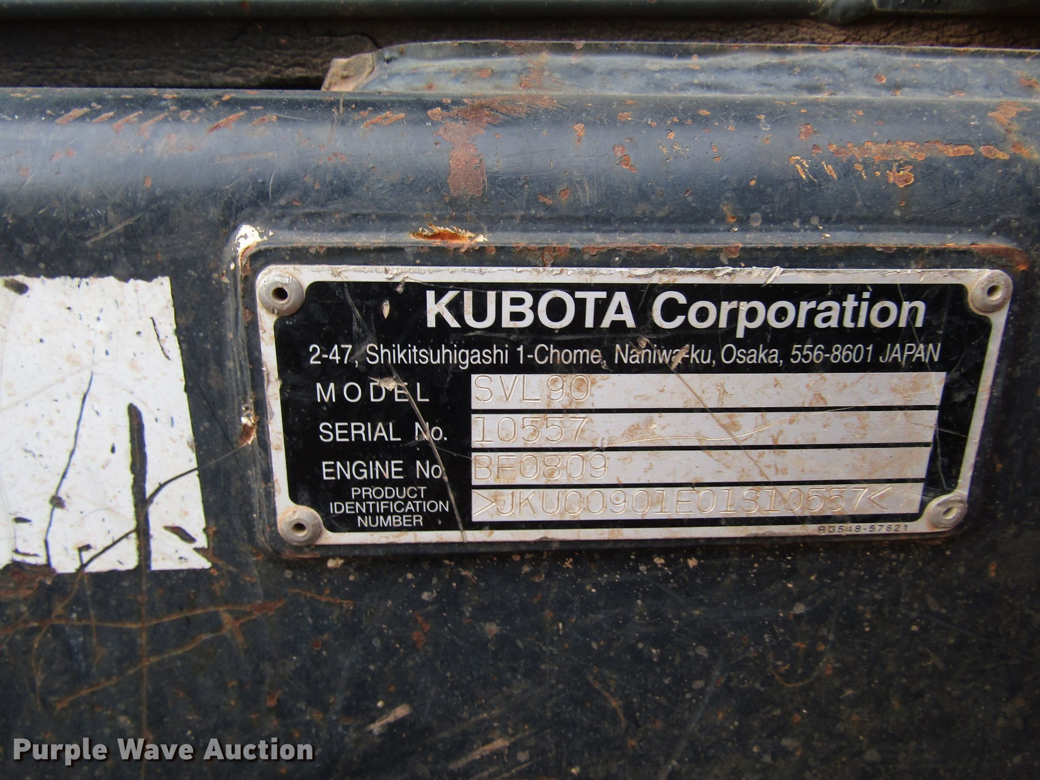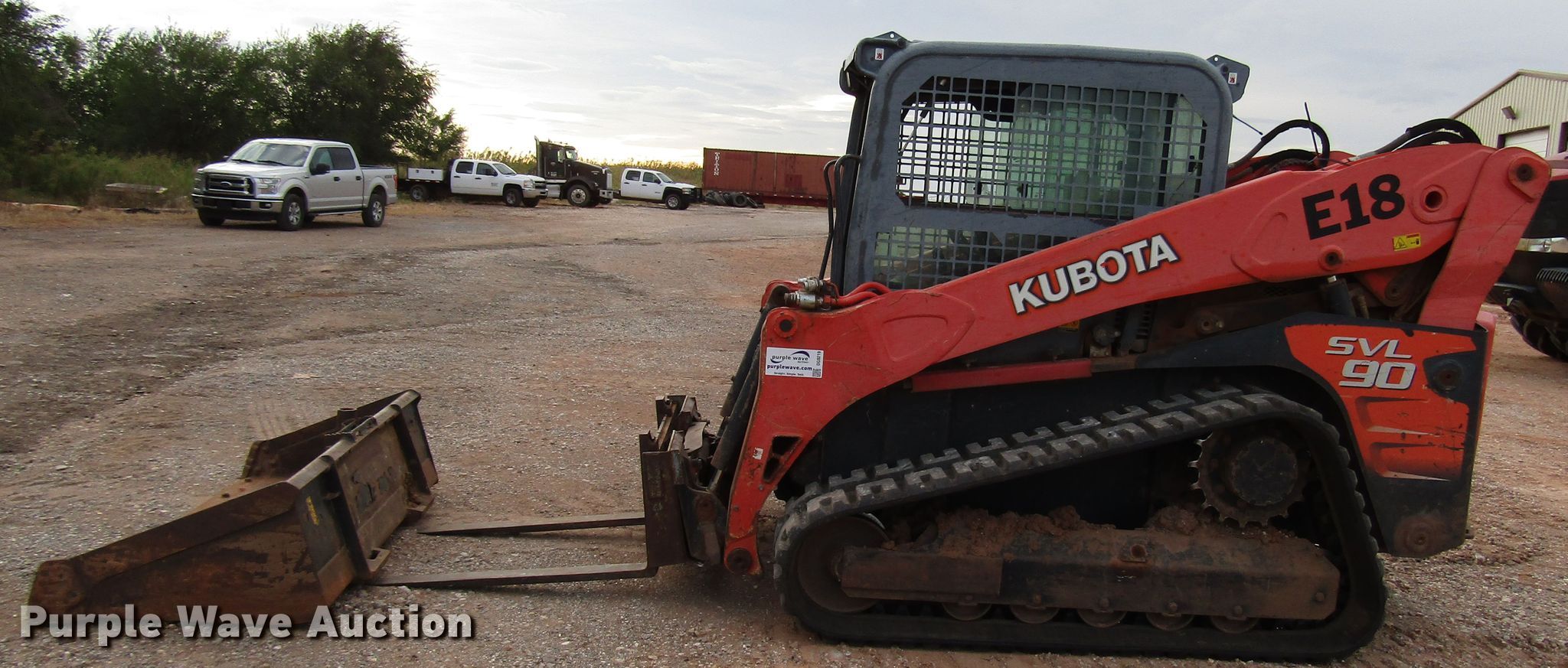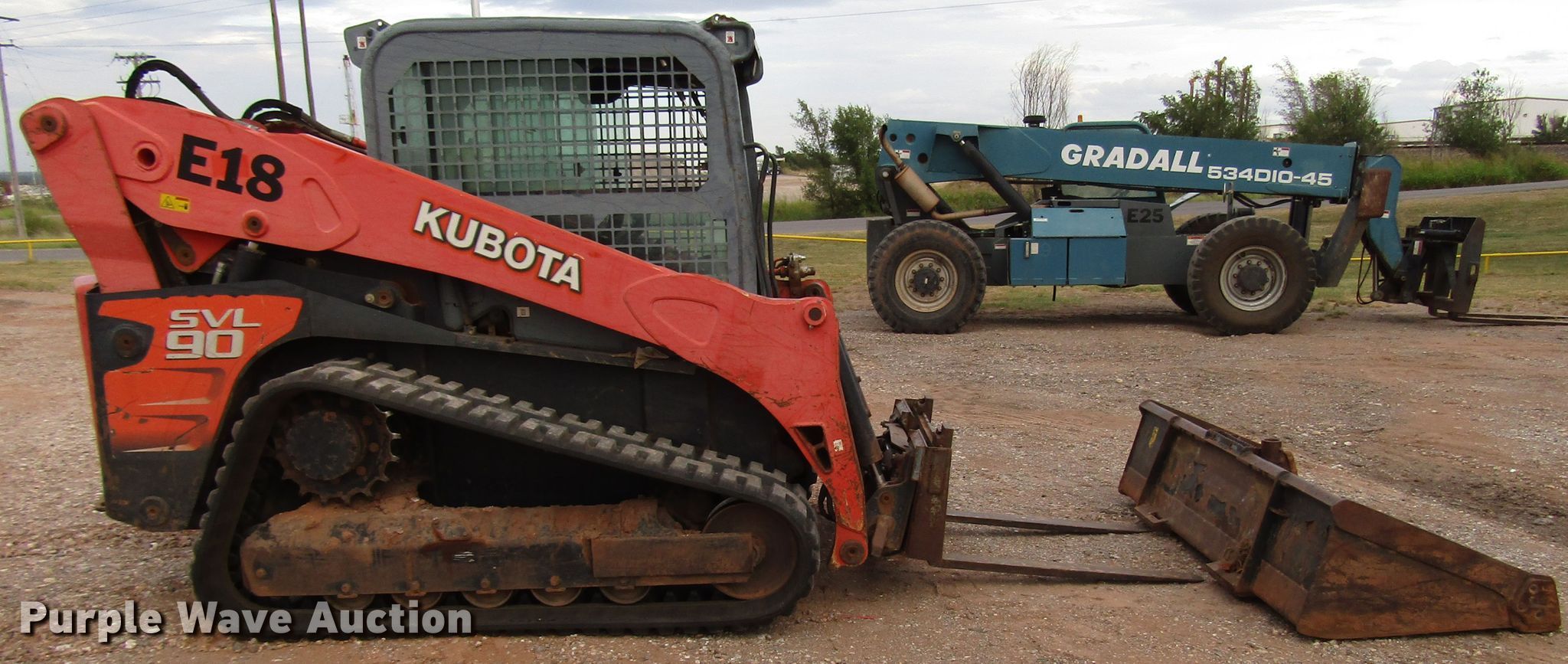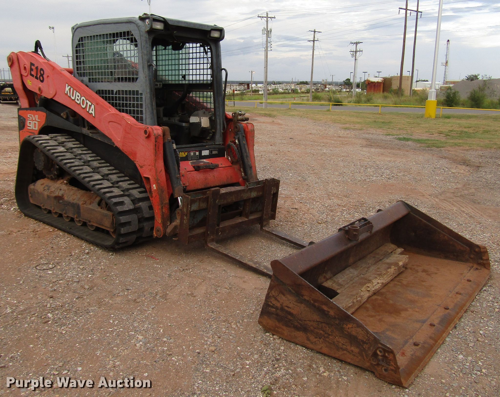 Purple Wave is selling a used Tracked Skid Steer Loader in Oklahoma. This item is a 2011 Kubota SVL90 skid steer with the following: 3,575 hours on meter, Kubota V3800 3.8L four cylinder diesel engine, Hydrostatic transmission, Enclosed cab, Hand bucket controls, 81"W bucket, Bolt-on cutting edge, 42"L pallet forks, Hydraulic quick coupler, Auxiliary hydraulics, 18"W tracks, Front glass missing, Serial 10557, Unit# E18