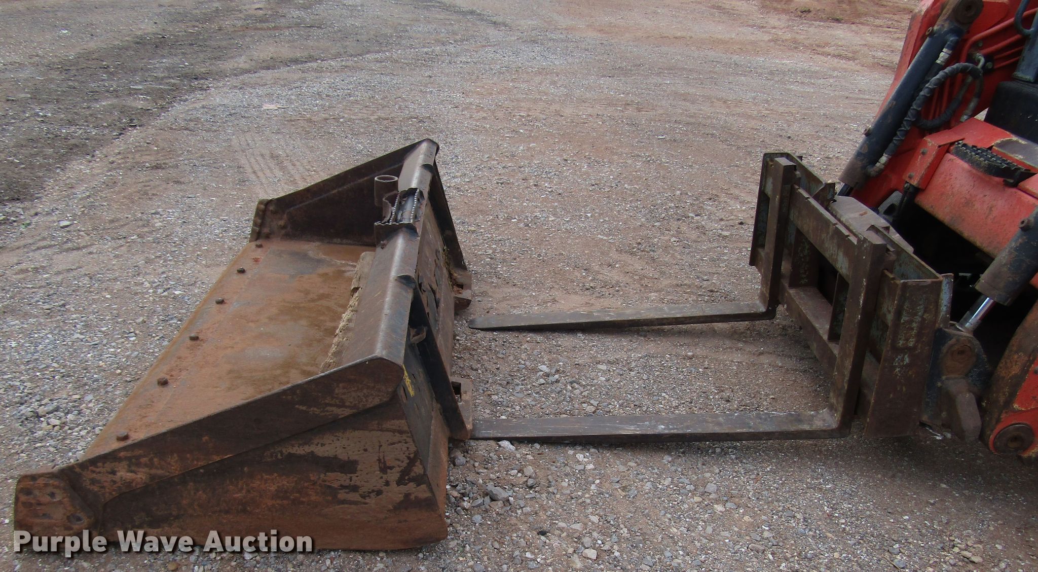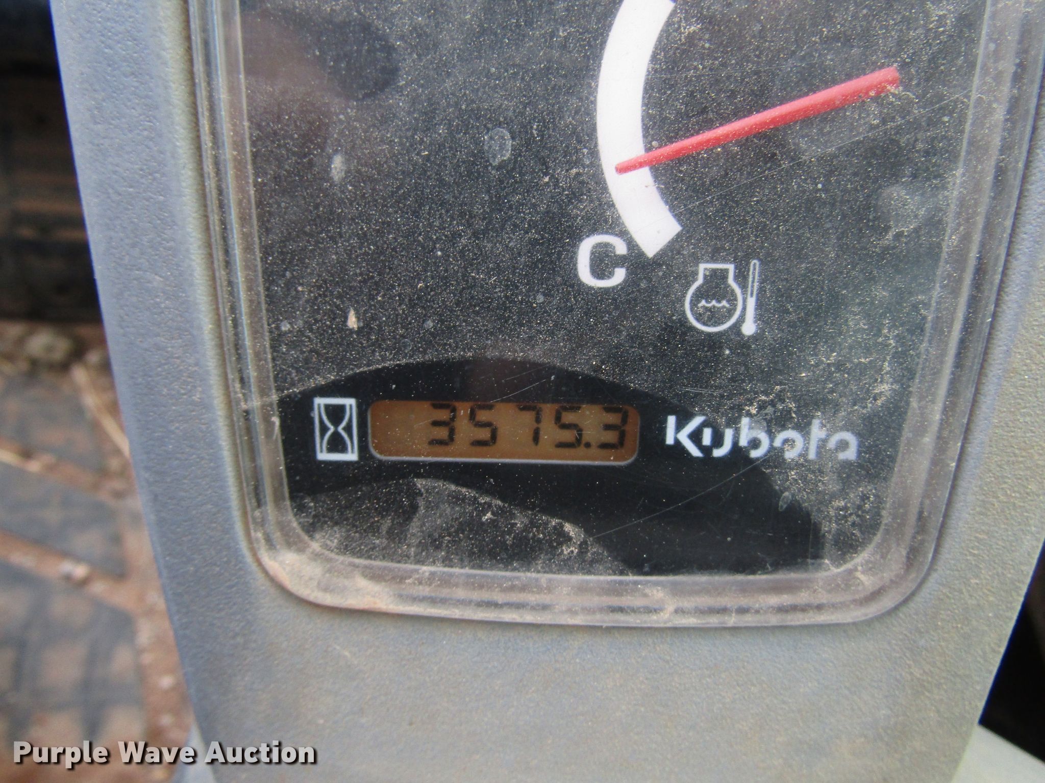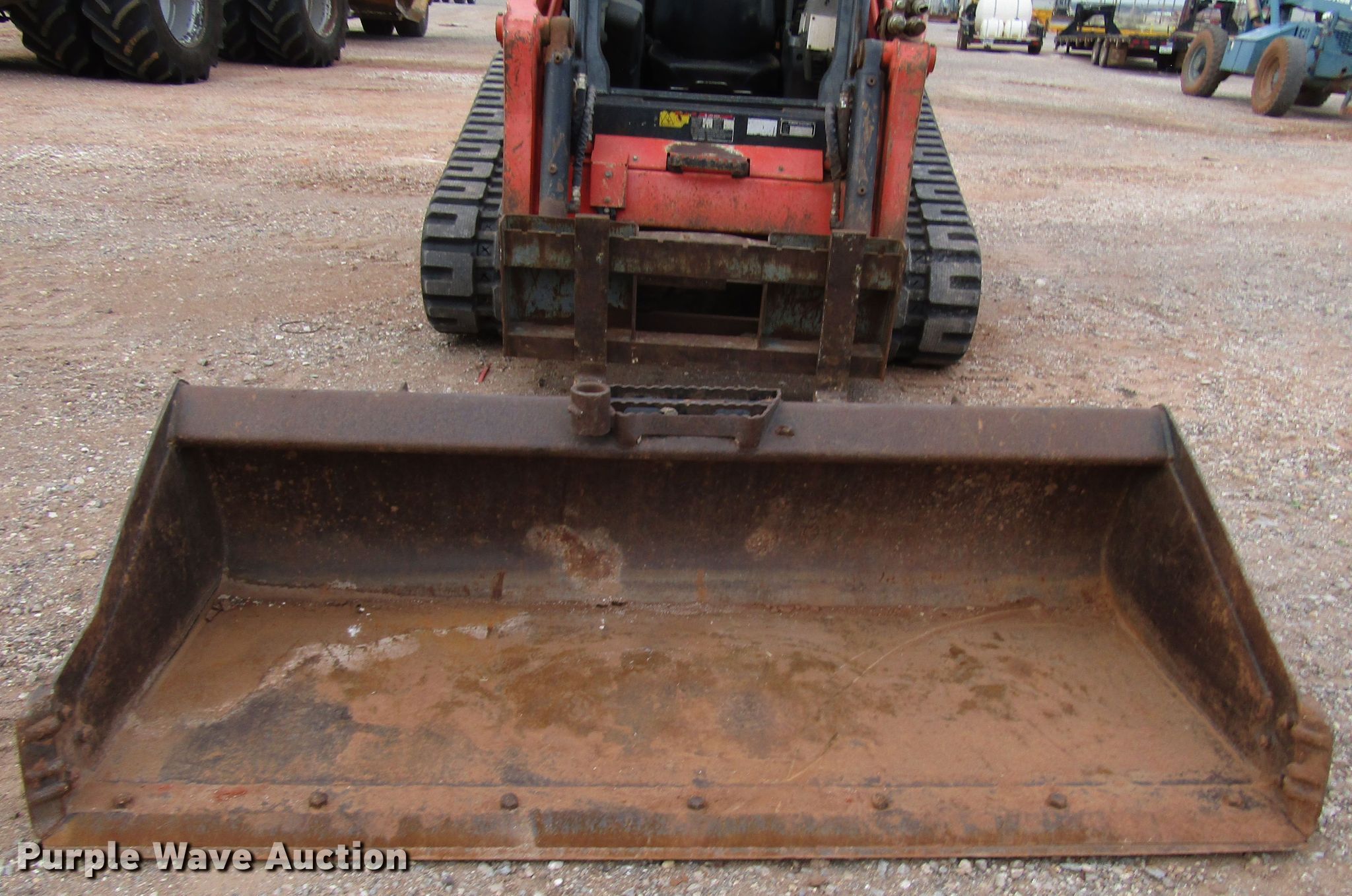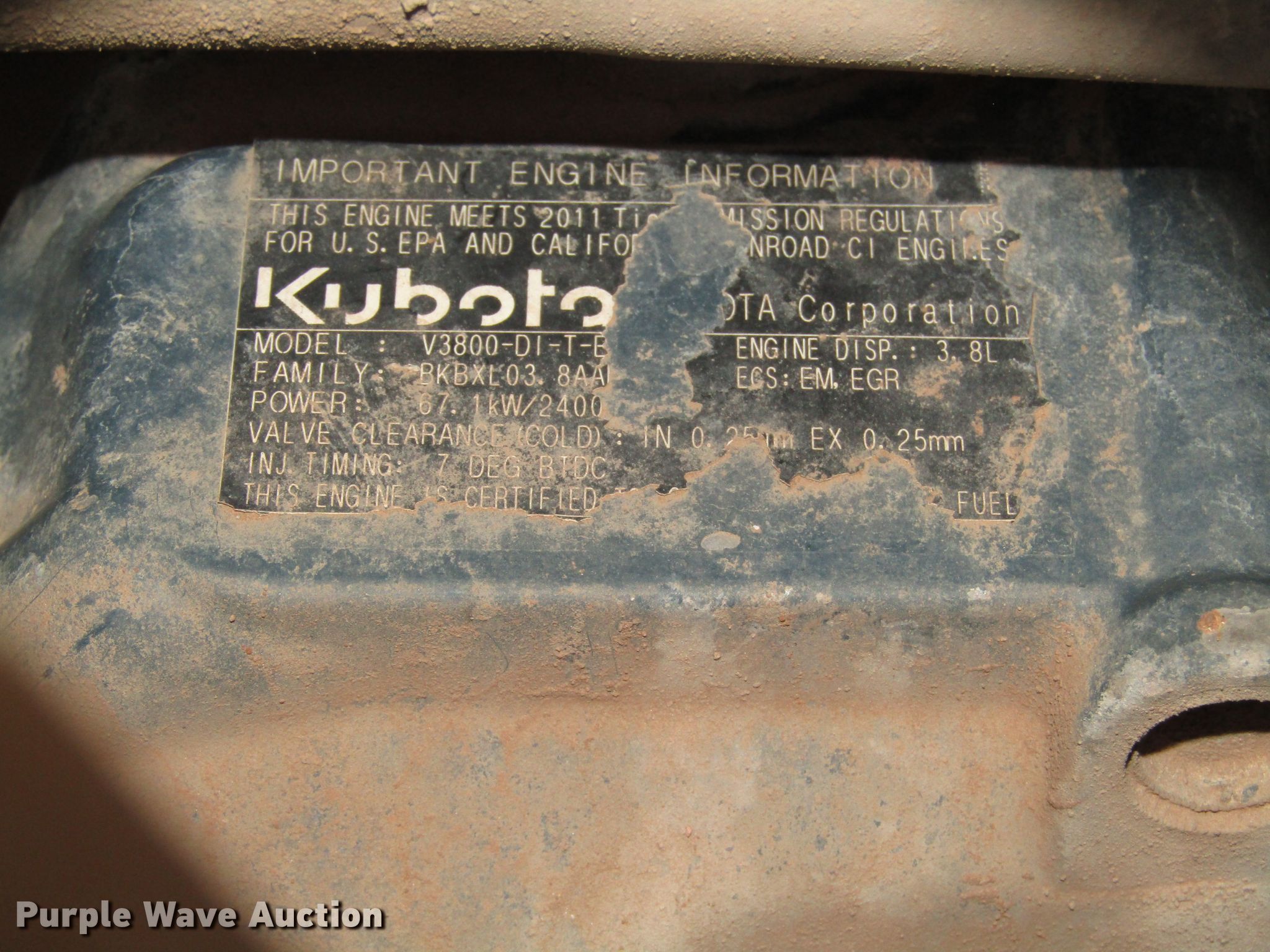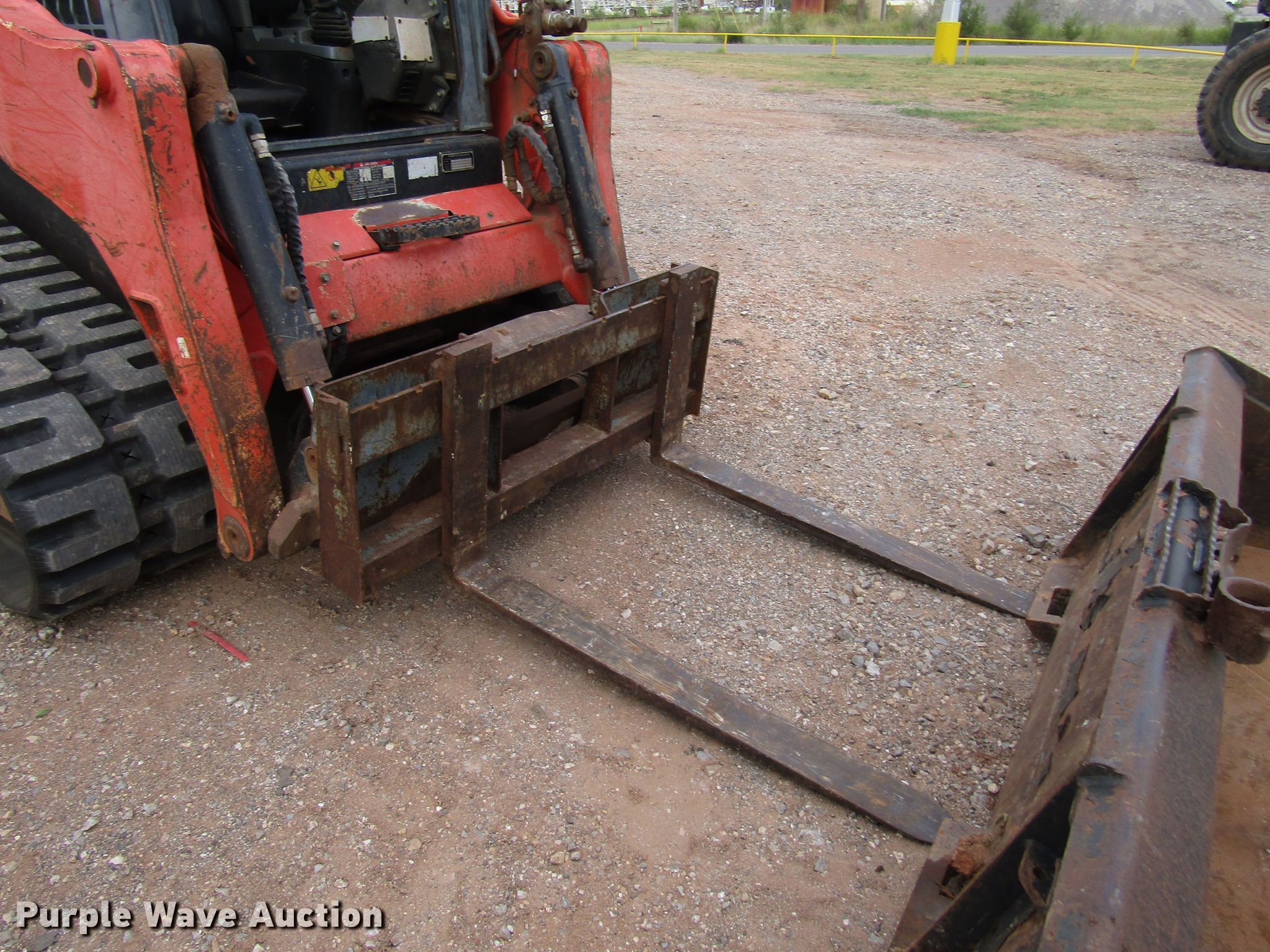 Purple Wave is selling a used Tracked Skid Steer Loader in Oklahoma. This item is a 2011 Kubota SVL90 skid steer with the following: 3,575 hours on meter, Kubota V3800 3.8L four cylinder diesel engine, Hydrostatic transmission, Enclosed cab, Hand bucket controls, 81"W bucket, Bolt-on cutting edge, 42"L pallet forks, Hydraulic quick coupler, Auxiliary hydraulics, 18"W tracks, Front glass missing, Serial 10557, Unit# E18