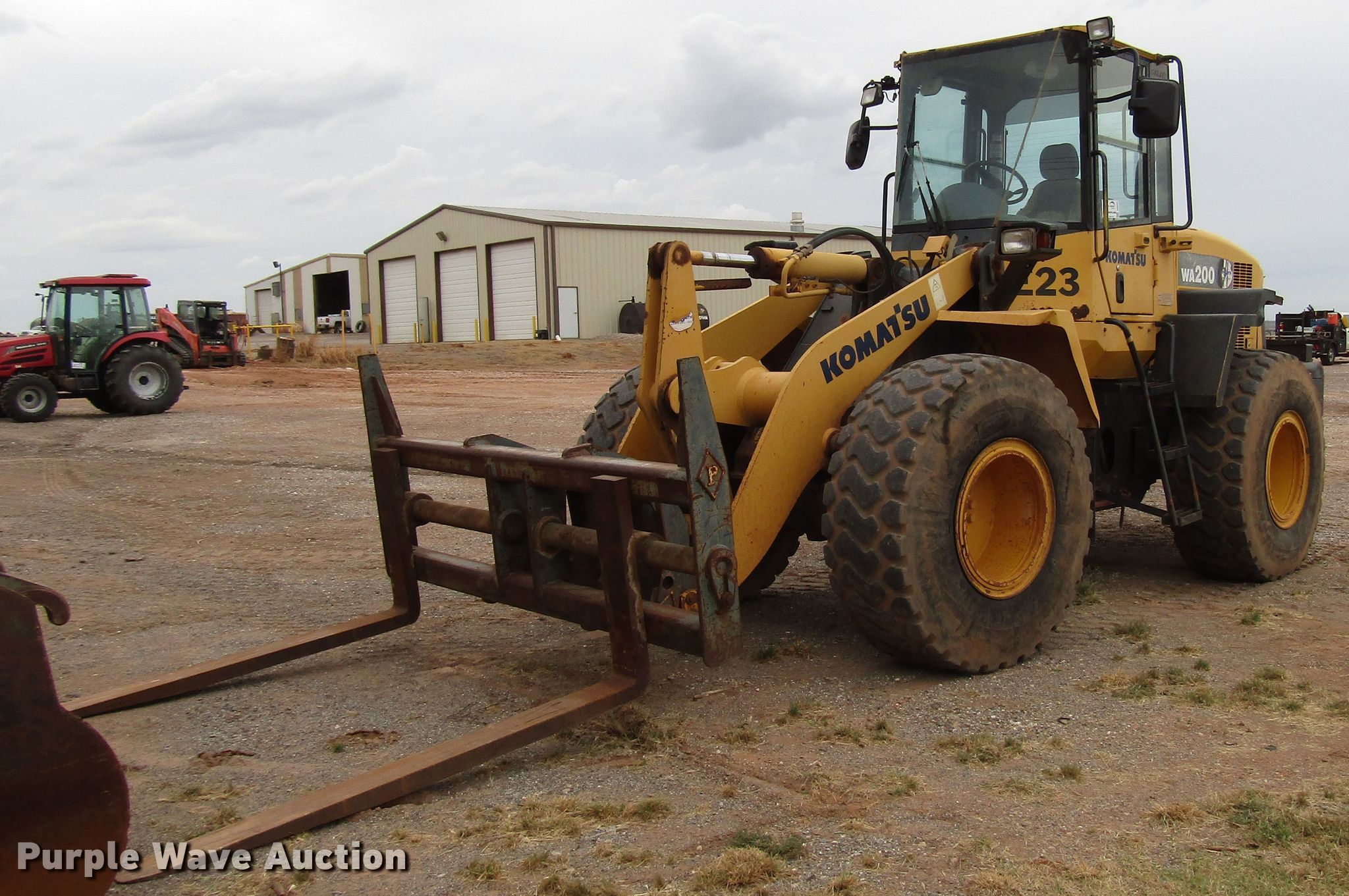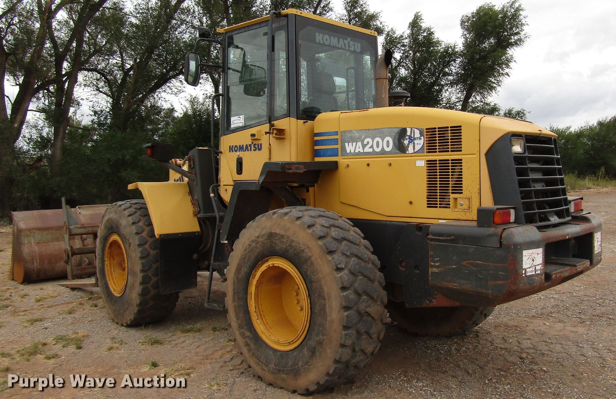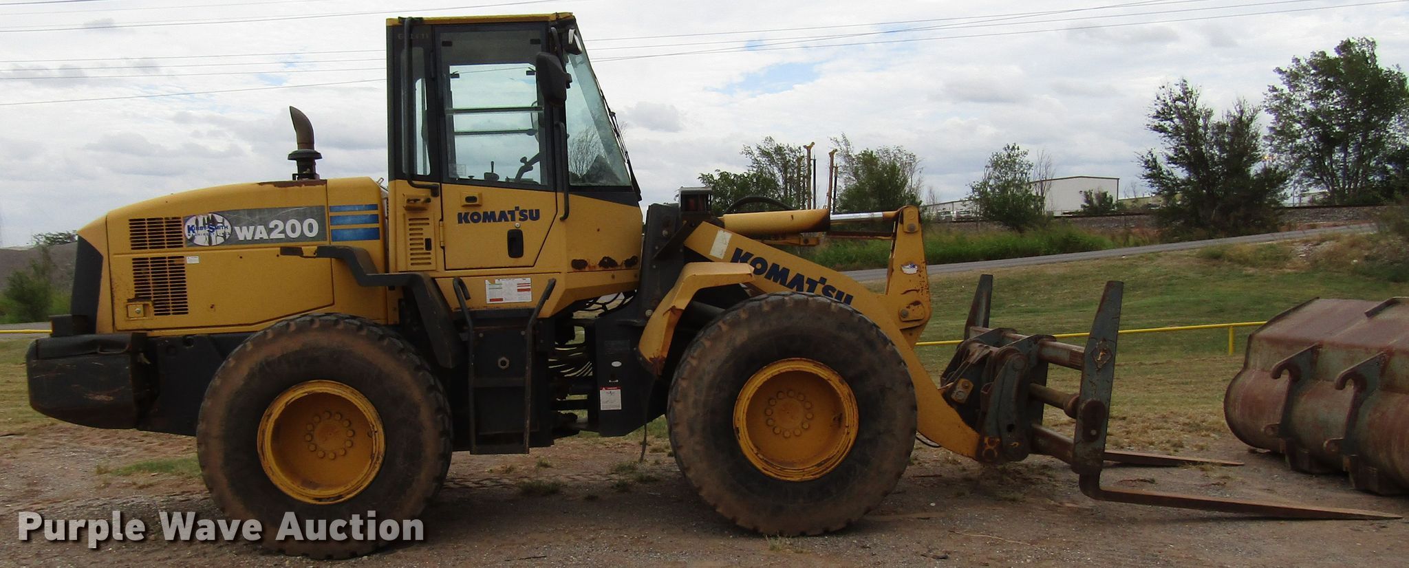 Purple Wave is selling a used Wheel Loader in Oklahoma. This item is a 2007 Komatsu WA200 wheel loader with the following: 7,387 hours on meter, Six cylinder diesel engine, Powershift transmission, 4F-4R gears, Enclosed cab, AC And heat, Joystick bucket controls, 105"W bucket, Weld-on cutting edge, 72"L pallet forks, Hydraulic quick coupler, 20.5R25 tires, Serial KMTWA052K01068485, Unit# E23