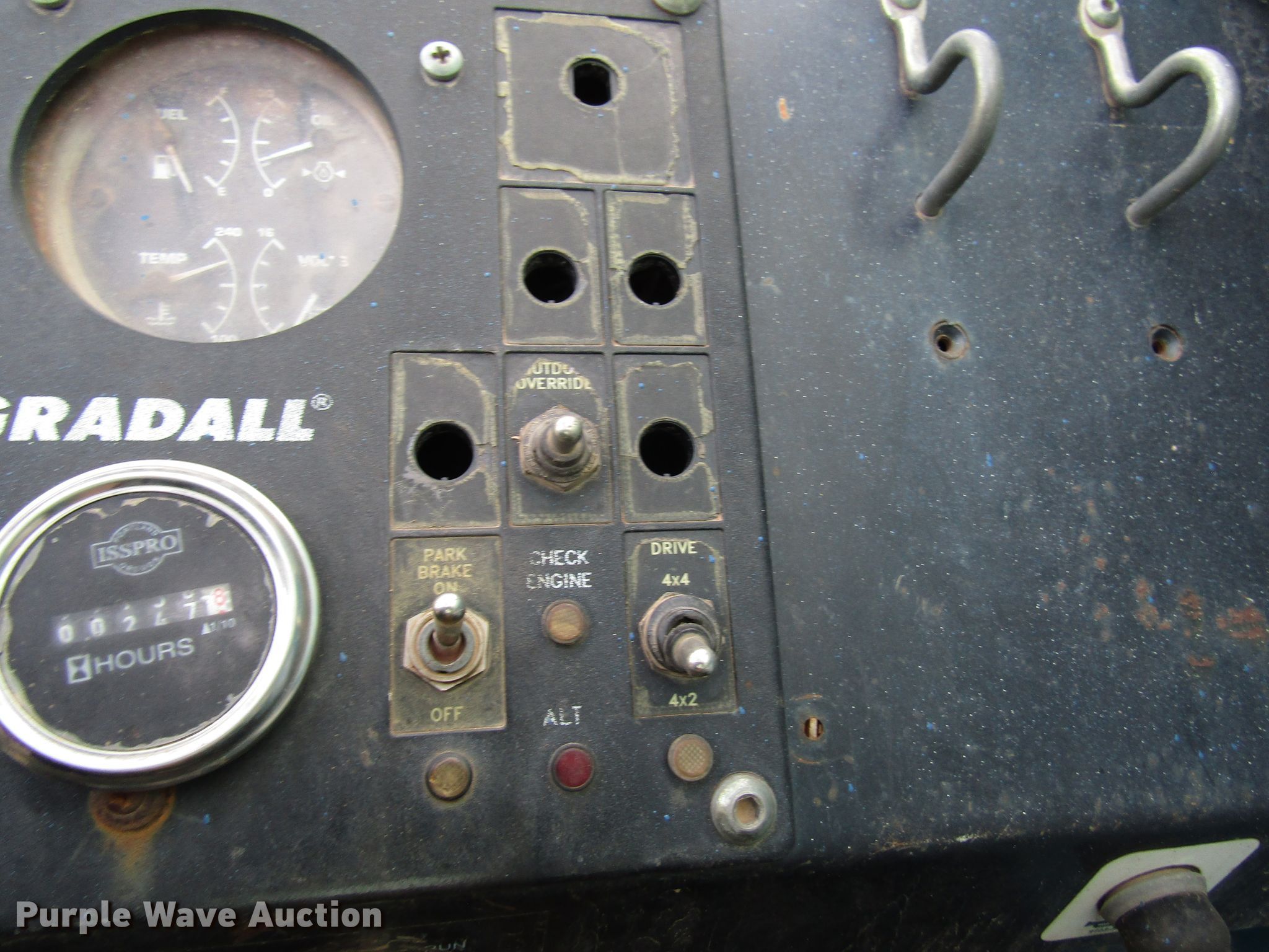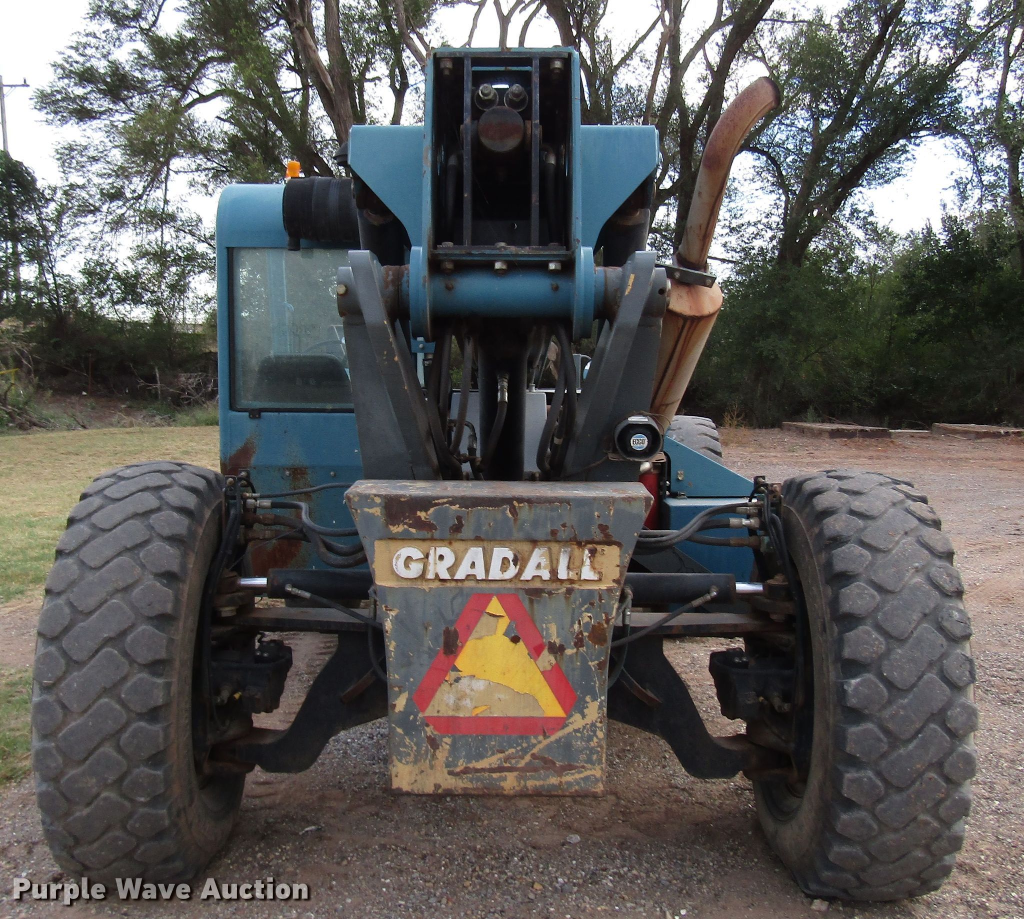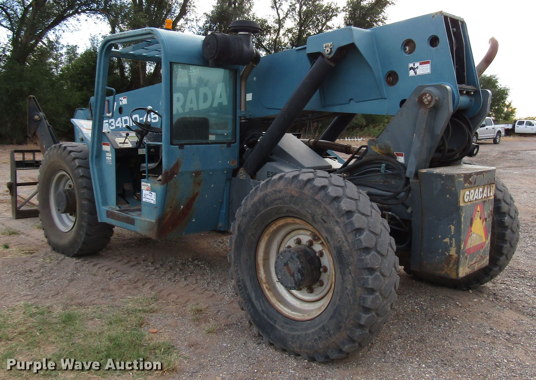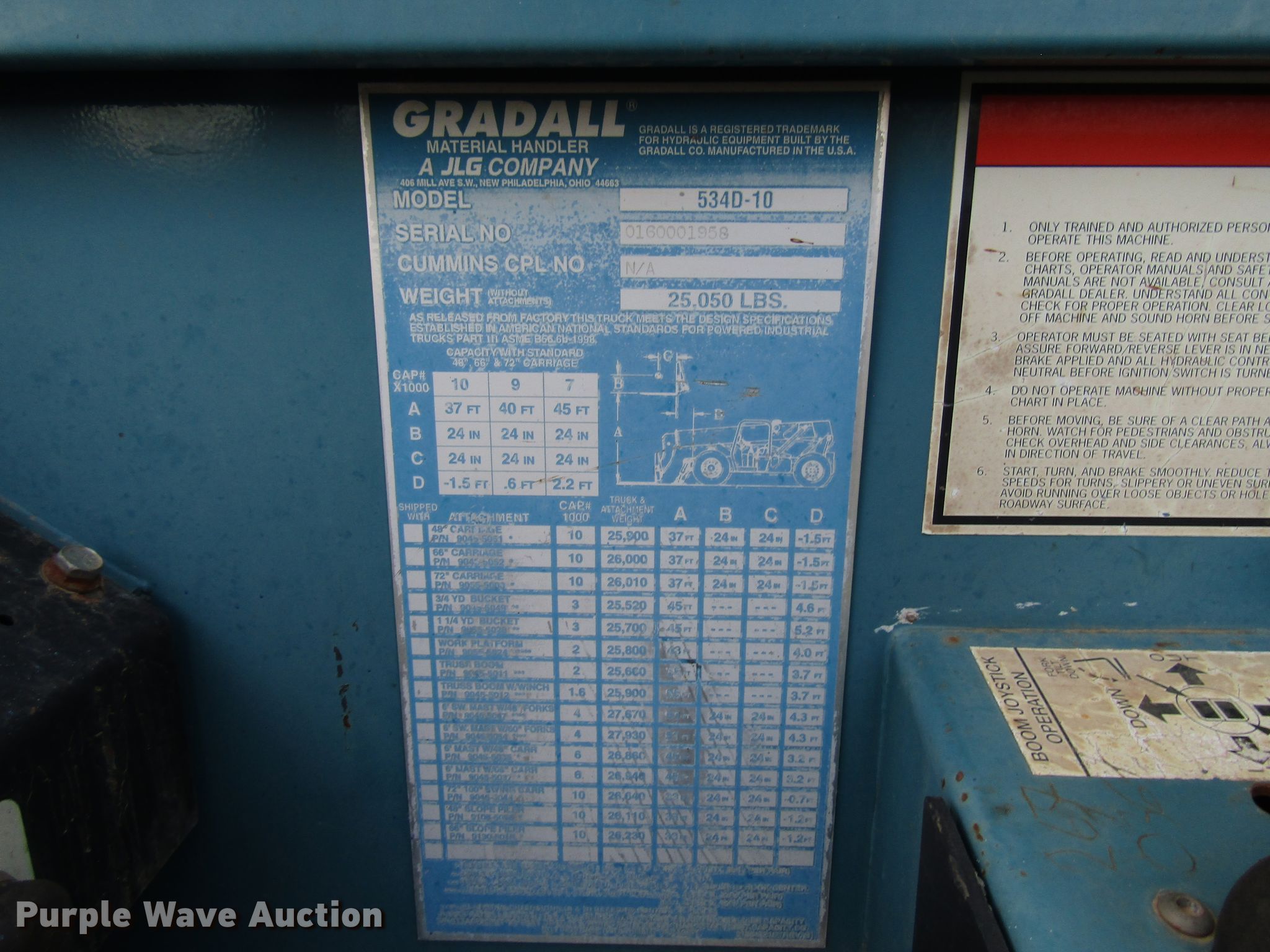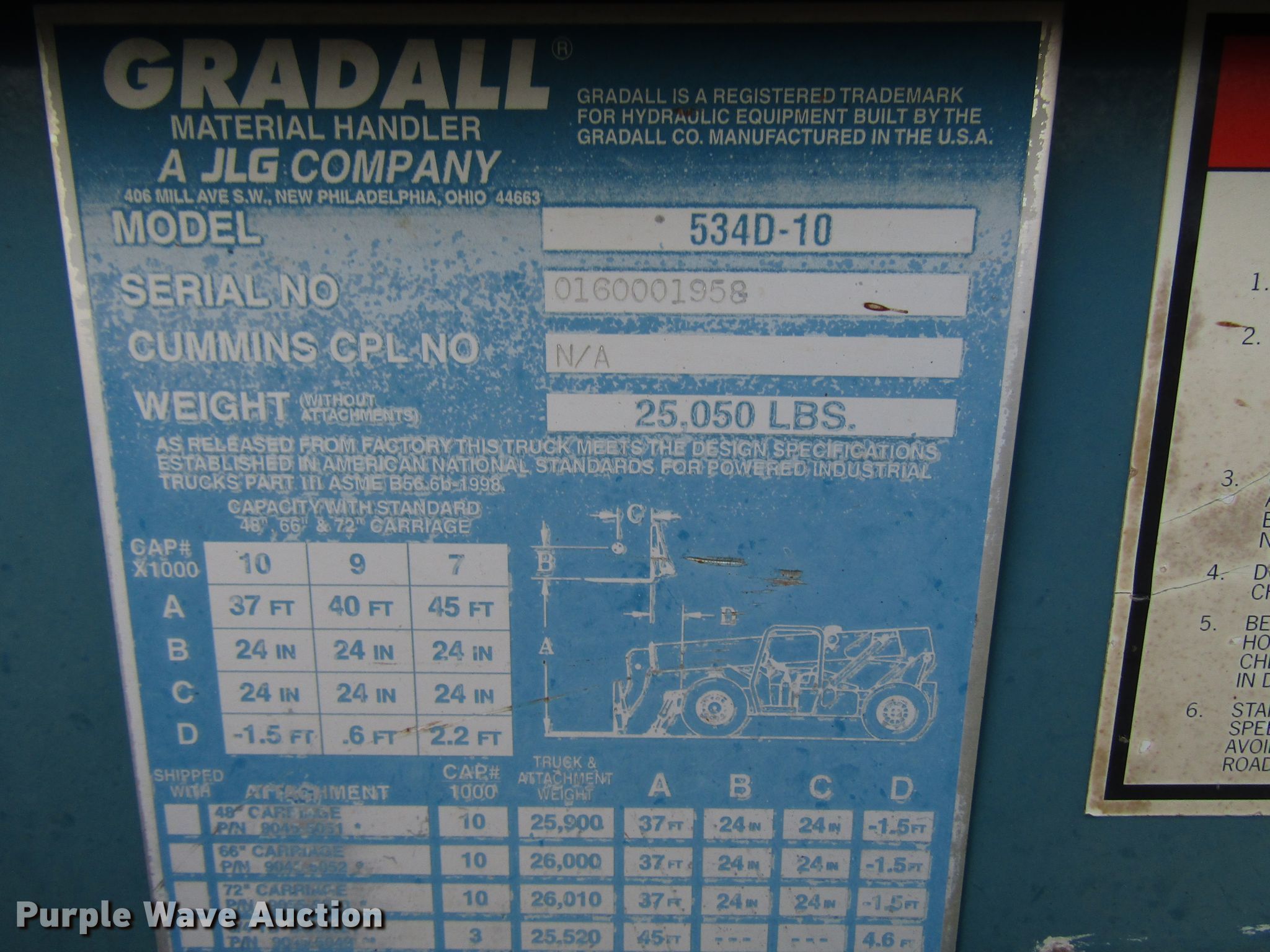 Purple Wave is selling a used Telehandler in Oklahoma. This item is a 2003 Gradall 534D-10 telehandler with the following: 247 hours on meter, John Deere four cylinder diesel engine, Hydrostatic transmission, Four wheel drive, OROPS, 7,000 lbs maximum lift capacity, 45' maximum lift height, Three stage mast, 60"L forks, Tilt carriage, Hydraulic outriggers, 14.00-24 tires, Serial 0160001958, Unit# E25