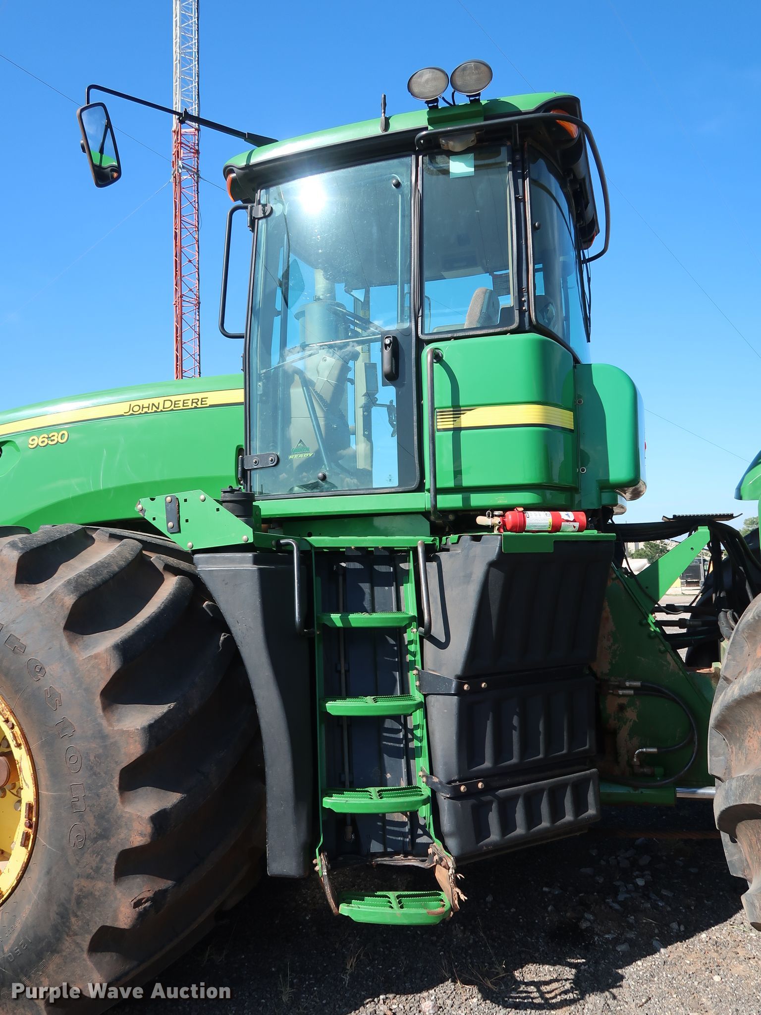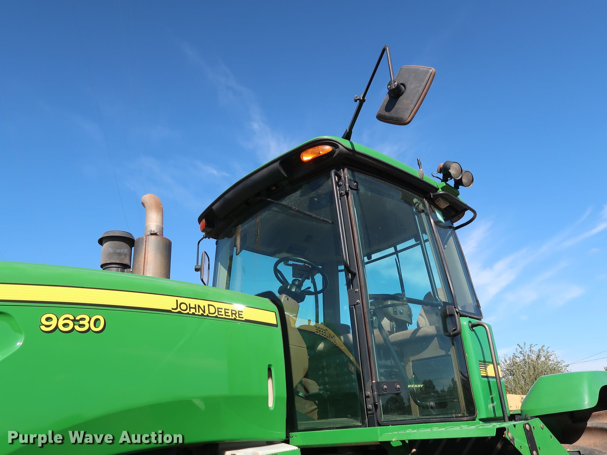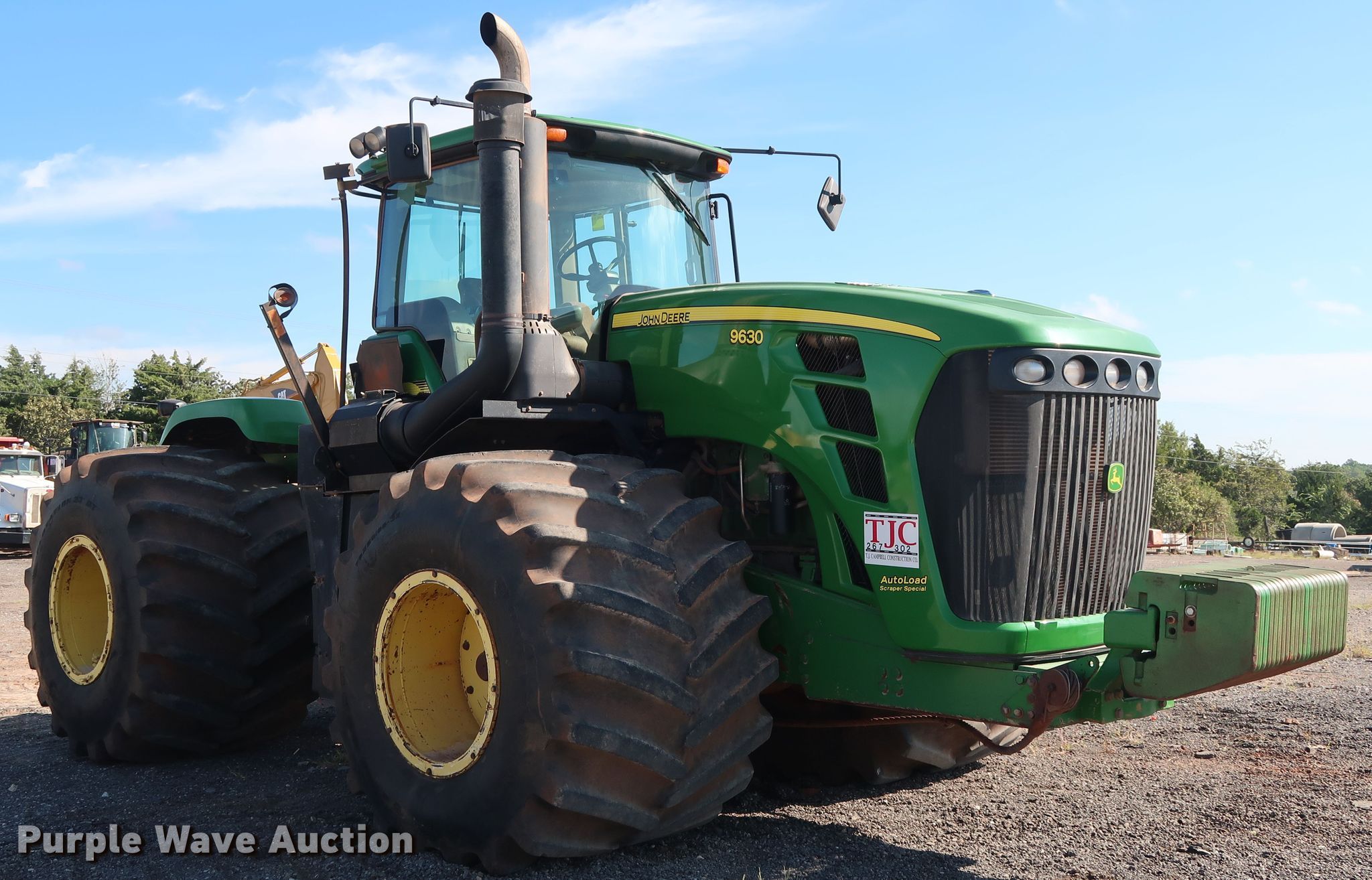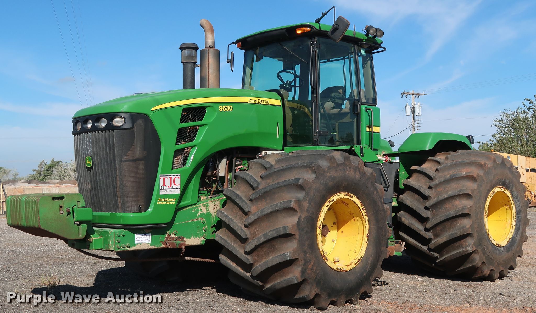 Purple Wave is selling a used Articulated 4-Wheel Drive Tractor in Oklahoma. This item is a 2008 John Deere 9630 Scraper Special 4WD tractor with the following: 9,102 hours on meter, John Deere 6135HRW01 13.5L six cylinder diesel engine, 18F-6R gears, AC and heat, Seven pin outlet, ISO electrical outlet, (4) rear hydraulic remote sets, (22) suitcase weights, 76 x 50.00-32 flotation tires, 1250/45-32 flotation tires, 138" wheelbase, Serial RW9630E003827, Unit# 267.302