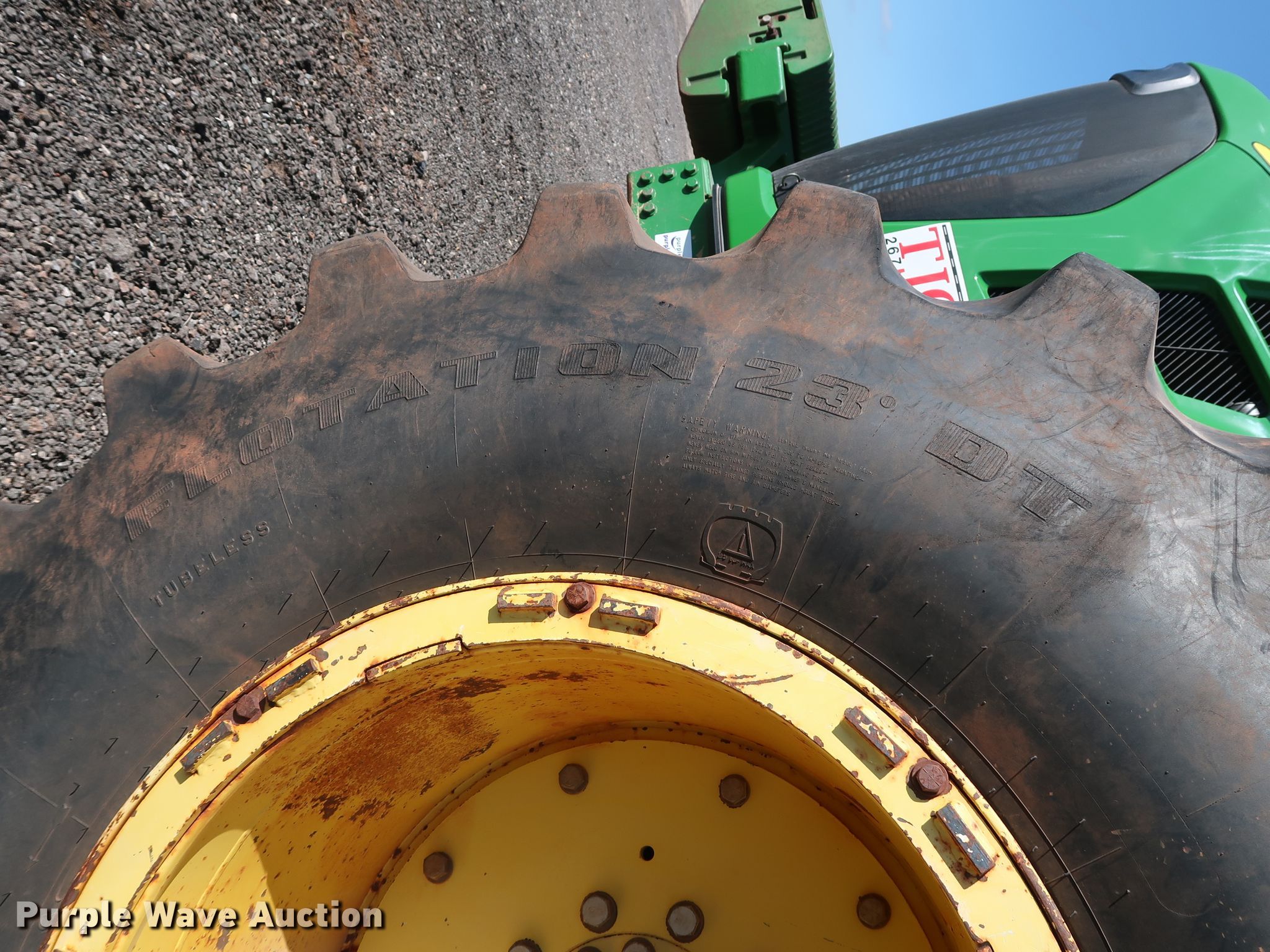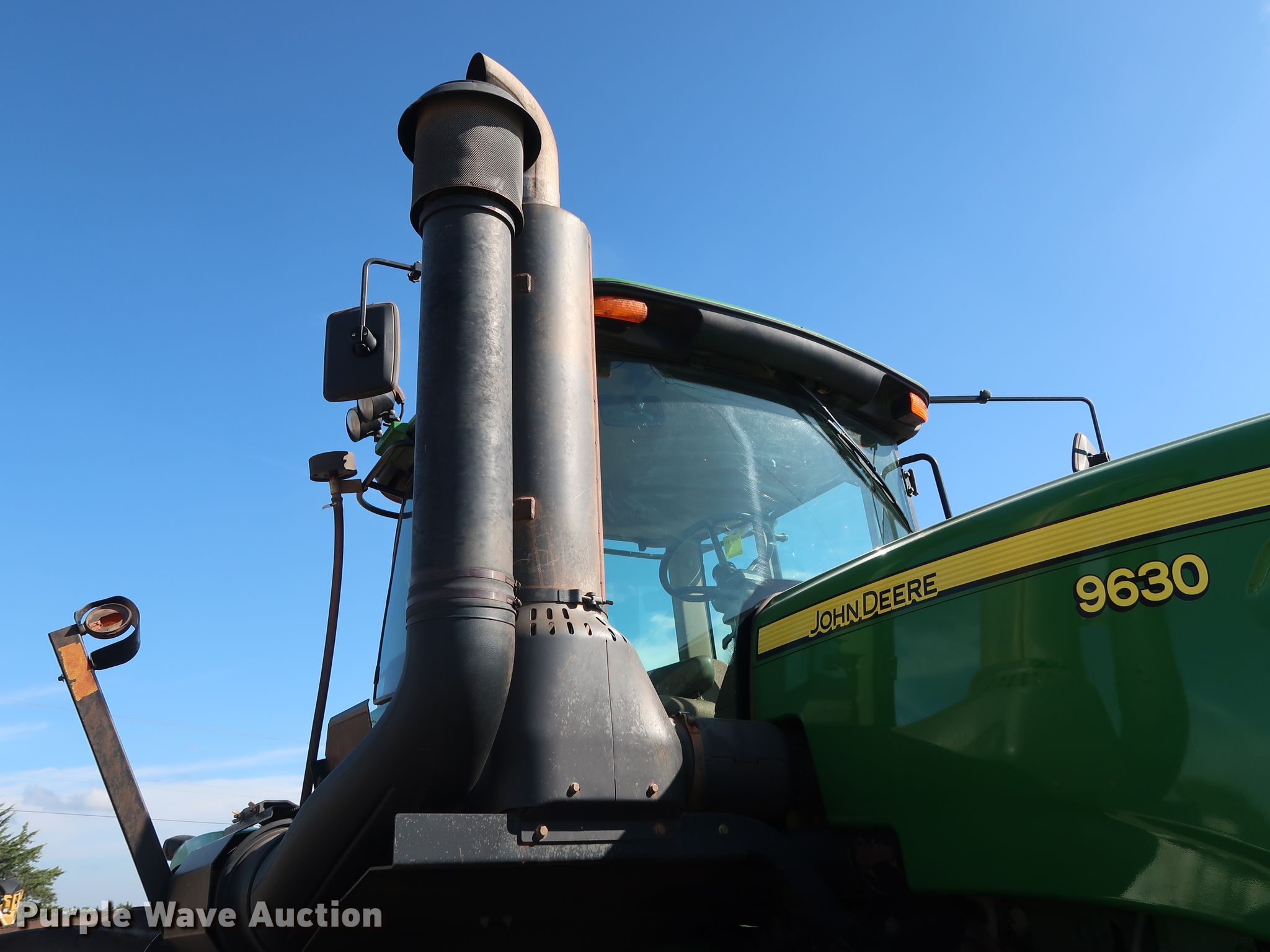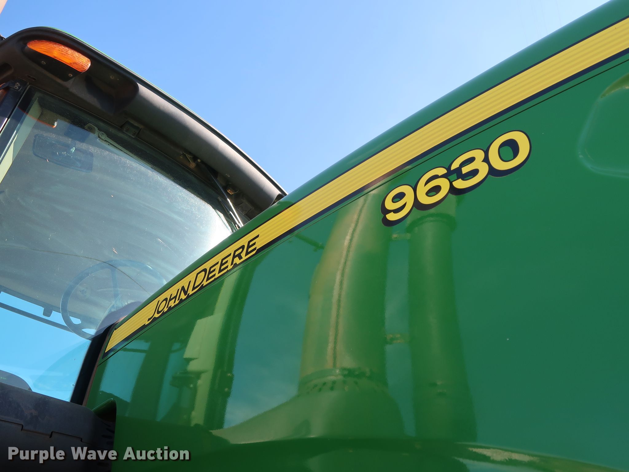 2008 John Deere 9630 Scraper Special 4WD tractor. 9,102 hours on meter, John Deere 6135HRW01 13.5L six cylinder diesel engine 18F-6R gears, AC and heat, Seven pin outlet, ISO electrical outlet, (4) rear hydraulic remote sets, (22) suitcase weights, 76 x 50.00-32 flotation tires, 1250/45-32 flotation tires, 138" wheelbase, Serial RW9630E003827, Unit# 267.302. Duit Holdings Inc.. 7183 E Waterloo Industrial Rd. Edmond, OK 73034