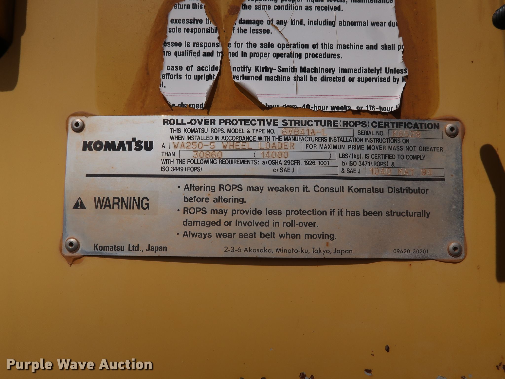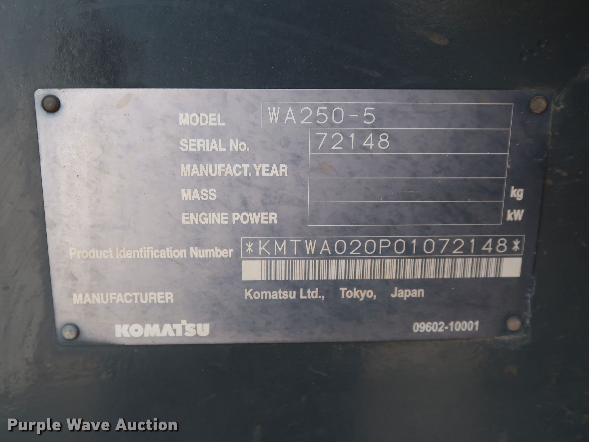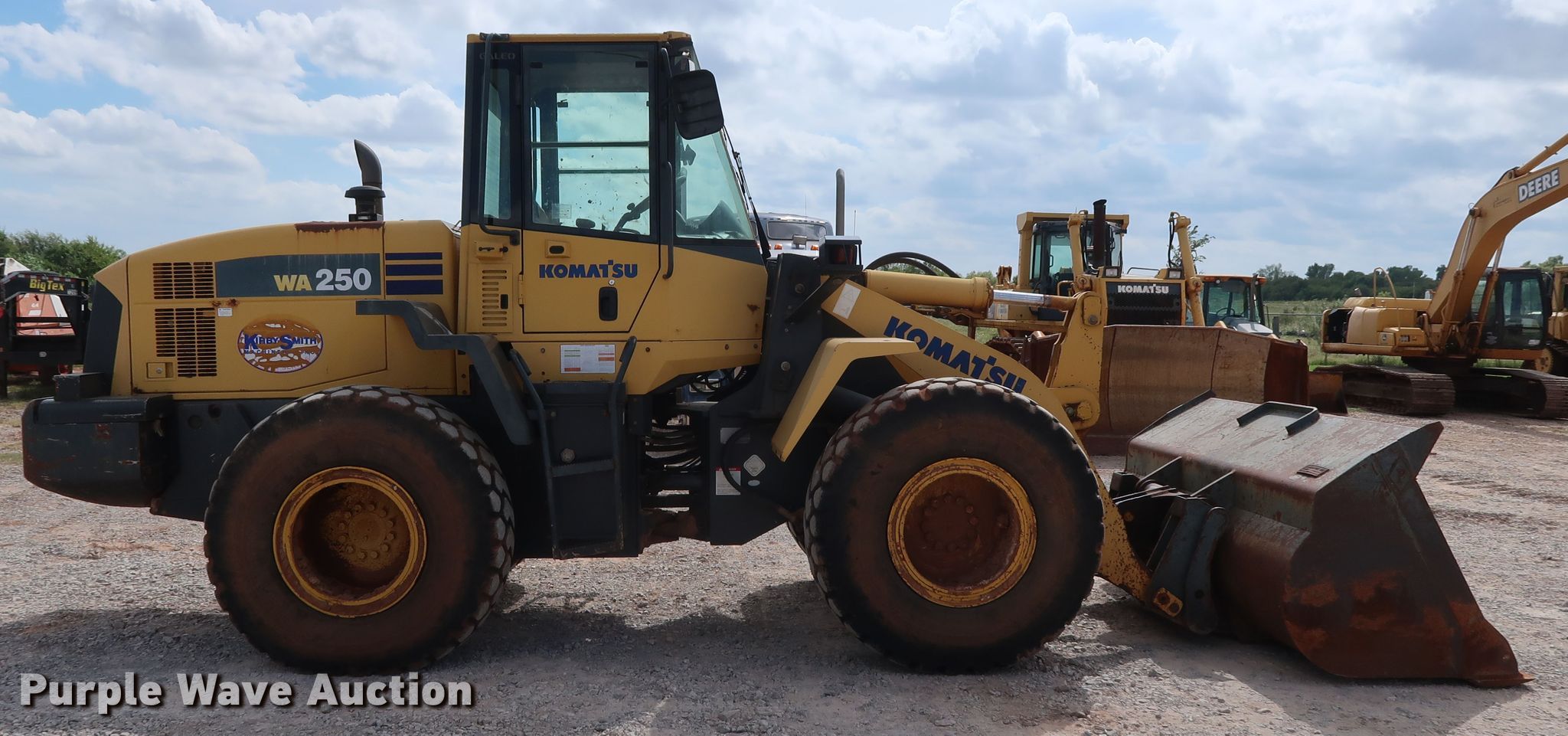 Purple Wave is selling a used Wheel Loader in Oklahoma. This item is a 2006 Komatsu WA250-5 wheel loader with the following: 7,394 hours on meter, Komatsu SAA6D102E-2 5.9L six cylinder diesel engine, 140 HP, Serial 26386510, Autoshift transmission, 4F-4R gears, EROPS, AC and heat, Joystick bucket controls, Pemberton 108"W bucket, Bolt-on cutting edge, Hydraulic quick coupler, Auxiliary hydraulics, Counter weights, 20.5R25 tires, Serial KMTWA020P01072148, Unit# LE22