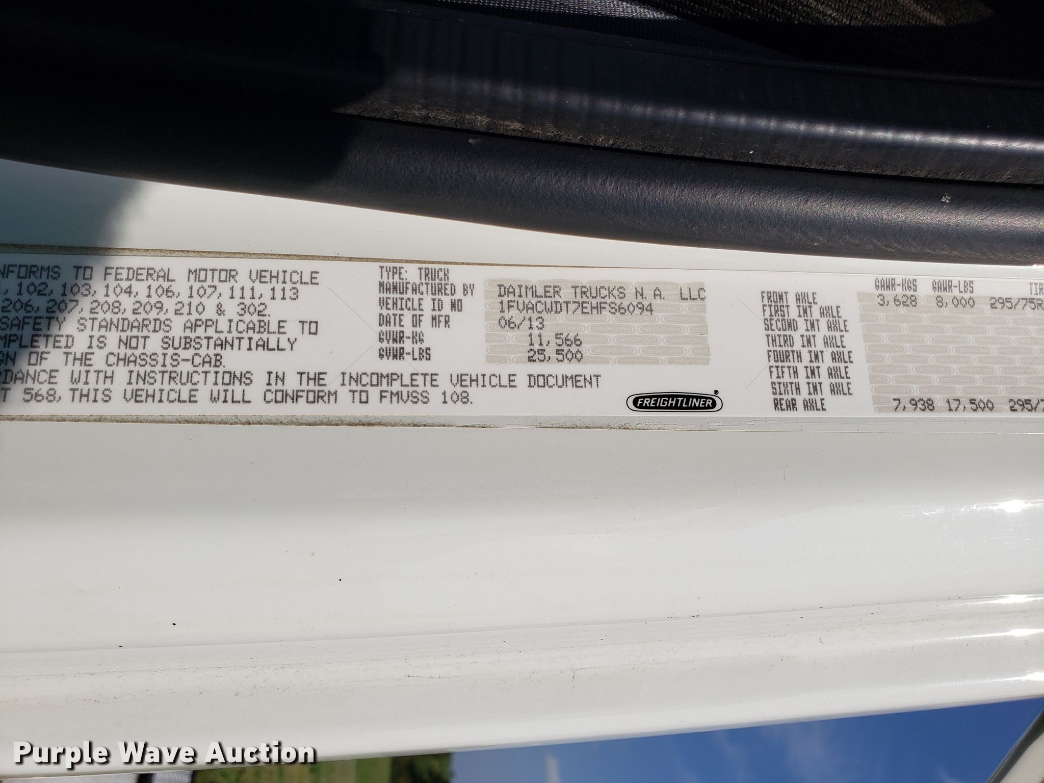 2014 Freightliner Business Class M2 hooklift truck. 163,723 miles on odometer, Cummins ISB 6.7L L6 diesel engine, Automatic transmission, Single axle, AC and heat, Power windows and locks, Heated mirrors, PTO, Palfinger HA-204-120-36 hooklift 13'L, Serial V-12-7979, Spring suspension, Air brakes, 295/75R22.5 tires, GVWR 25,500 lbs. Missouri title. Title distribution may be delayed up to 30 days from verification of funds. 1FVACWDT7EHFS6094. Project connection. 4849 saw 169 hwy. Trimble, MO 64492