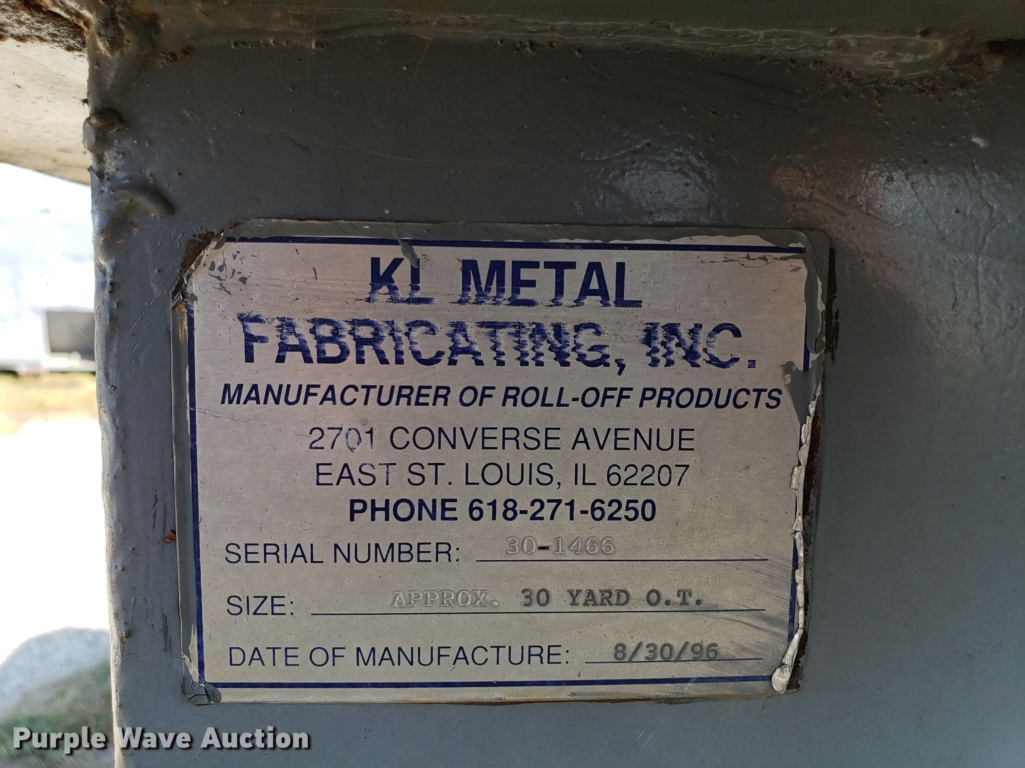 KL Metal Fabricating Inc roll-off container. 22.5'L x 90"W x 60"H, 30 cu.yd. capacity. Project connection. 4849 saw 169 hwy. Trimble, MO 64492