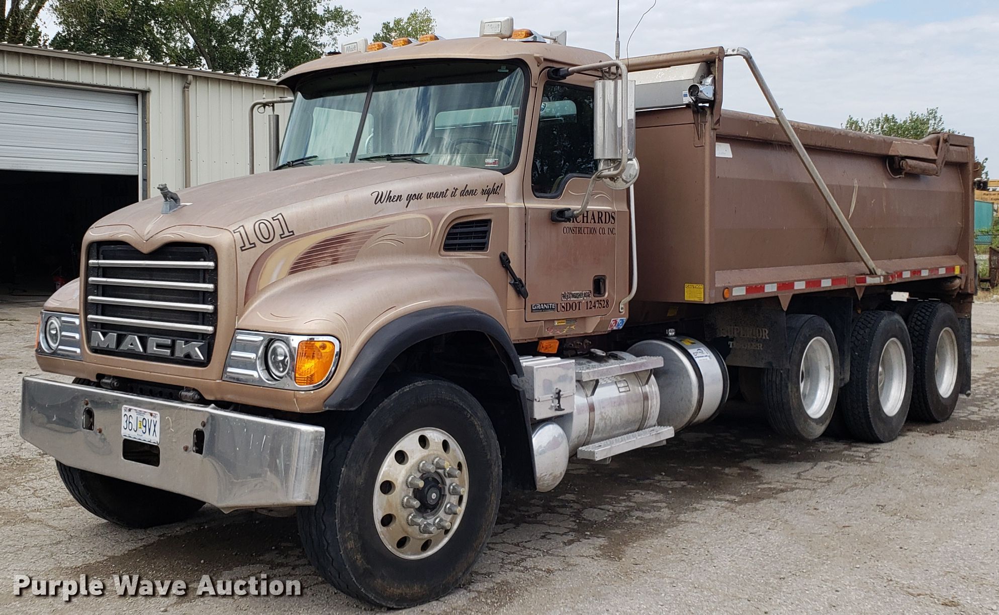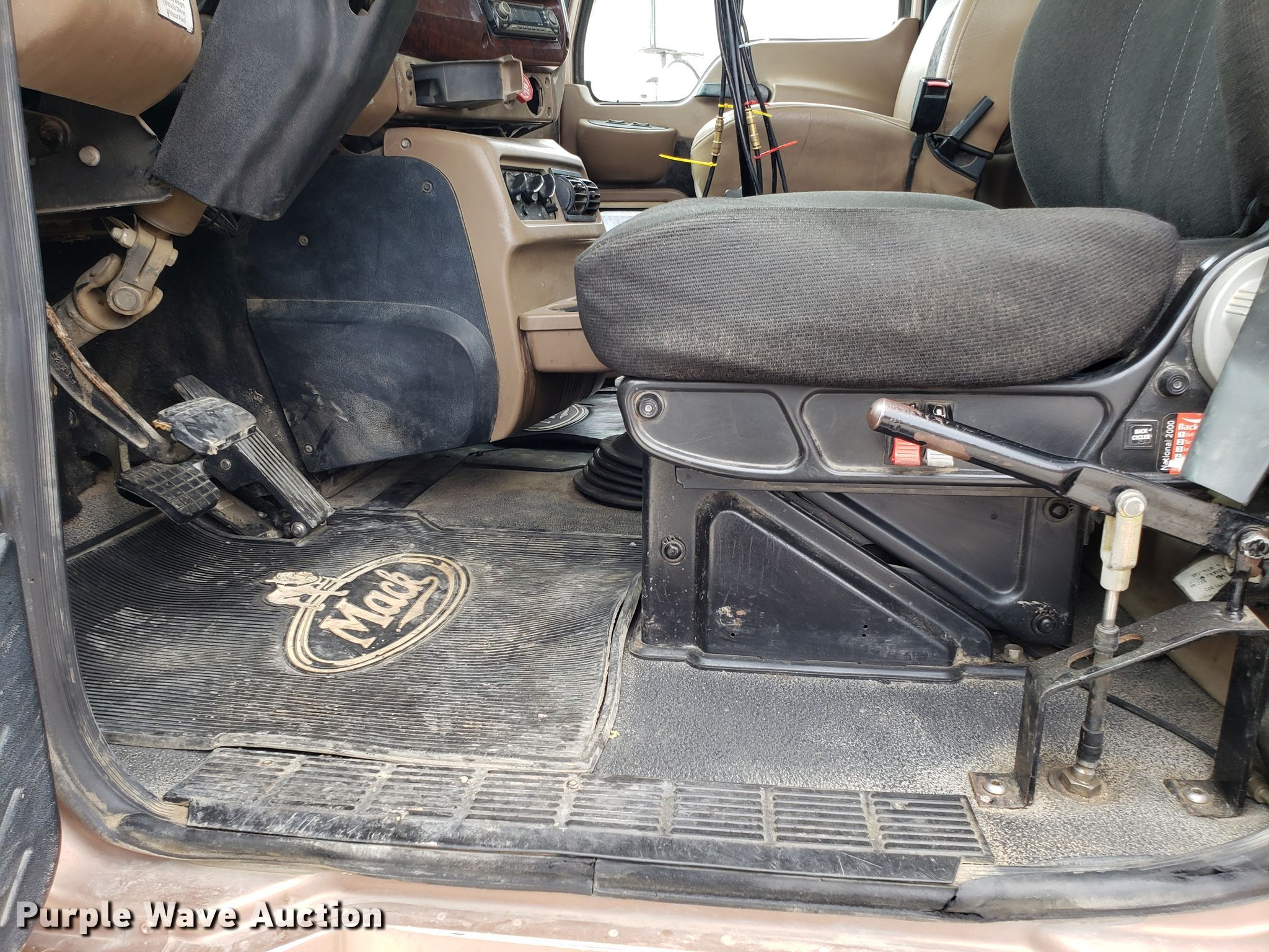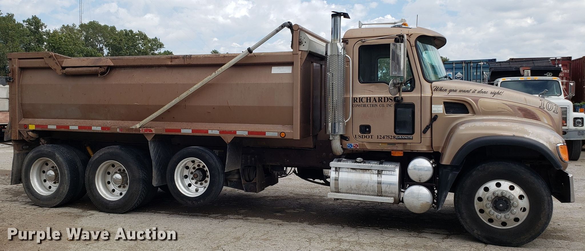 Purple Wave is selling a used Construction Dump Truck in Missouri. This item is a 2001 Mack CV513 dump truck with the following: 341,137 miles on odometer, 18,008 hours on meter, Mack 12.0L L6 diesel engine, Maxitorque 10 speed manual transmission, Triple axle, Pusher axle, AC and heat, Cruise control, Power windows, Heated mirrors, PTO, 17'L x 8'W steel dump bed, 52" side height, Single ram hoist, Air operated end gate, Roll tarp, Walking beam suspension, Air brakes, 315/80R22.5 front tires, 255/70R22.5 lift axle tires, 11R22.5 rear tires, GVWR 69,620 lbs