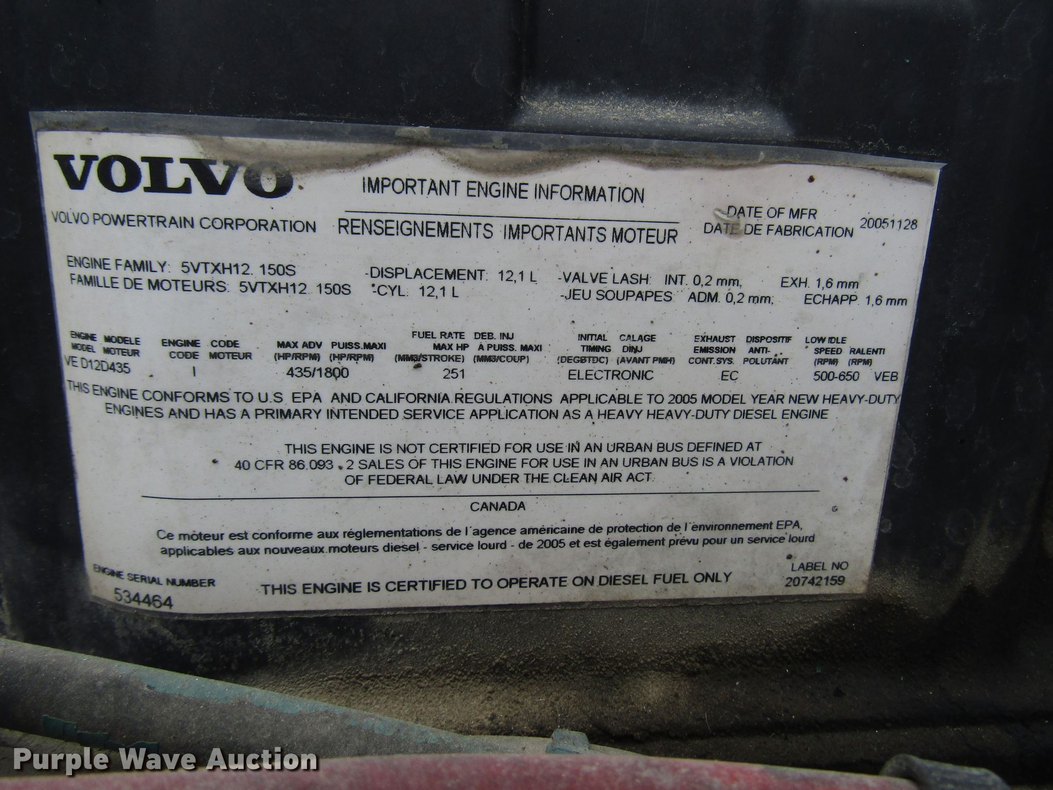 Purple Wave is selling a used Truck Tractor in Iowa. This item is a 2006 Volvo VN semi truck with the following: 489,628 miles on odometer, Volvo VED12D435 12.1L L6 diesel engine, 10 speed manual transmission, Tandem axle, Inter-axle differential lock, AC and heat, Cruise, Power windows and locks, Heated mirrors, Dump valves, Air ride cab, Sleeper, 40"L, Single bed, Aluminum deck plate, Air operated sliding fifth wheel plate, Dual fuel tanks, Air suspension, Air brakes, Engine brakes, 198" wheelbase, 11R22.5 tires, GVWR 50,350 lbs, FAWR 12,350 lbs, IAWR 20,000 lbs, RAWR 20,000 lbs, Unit# 5500686