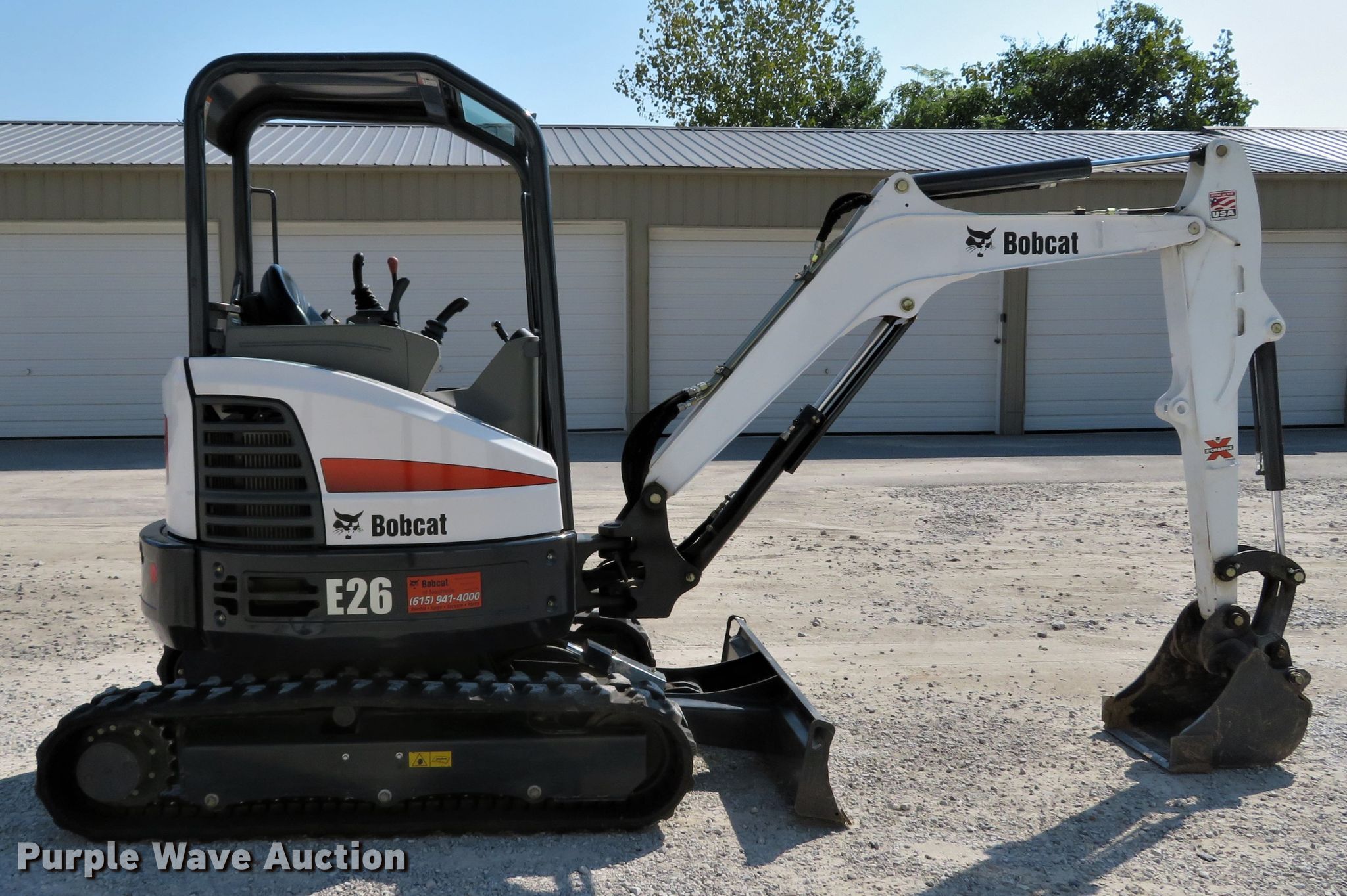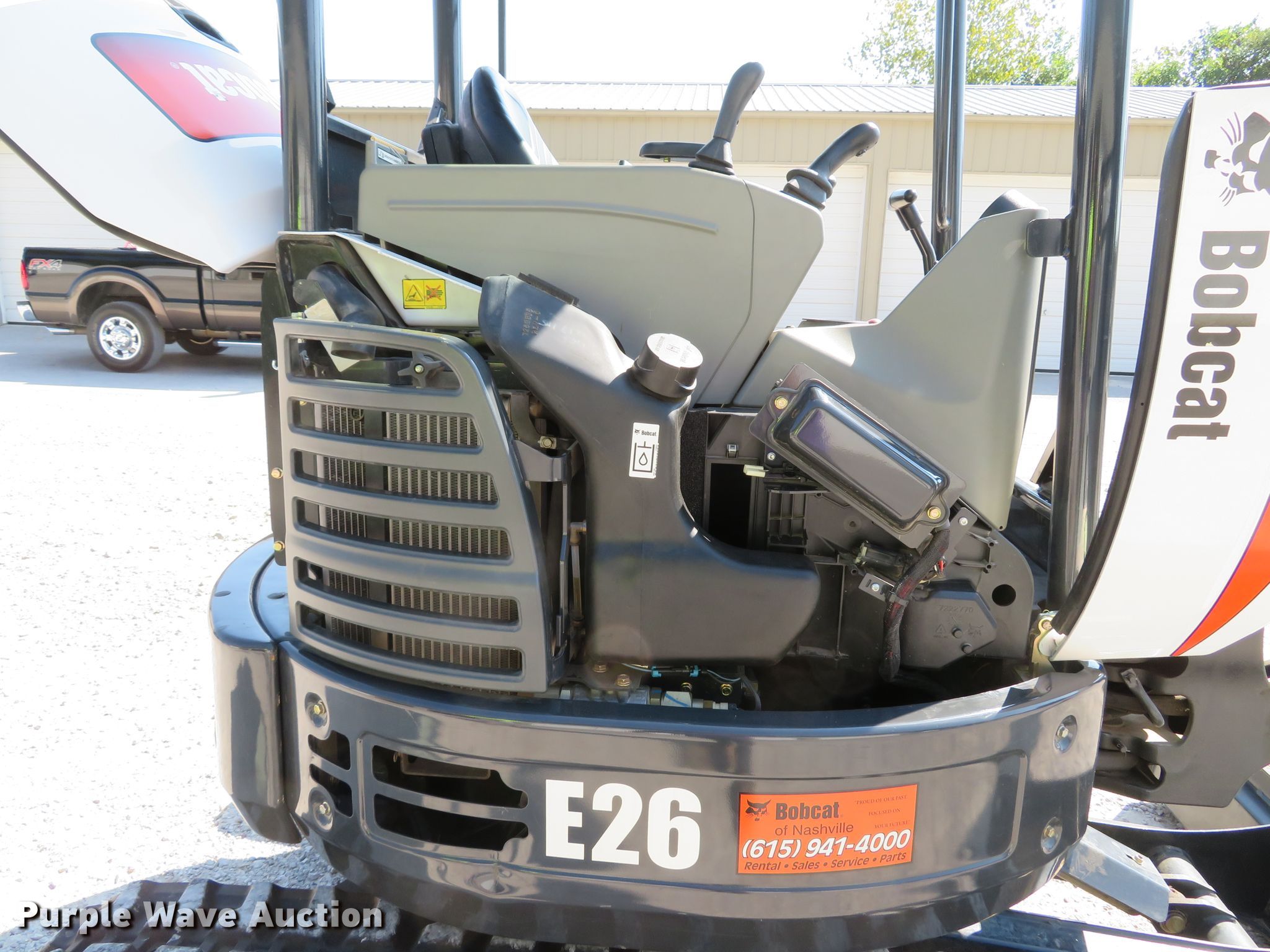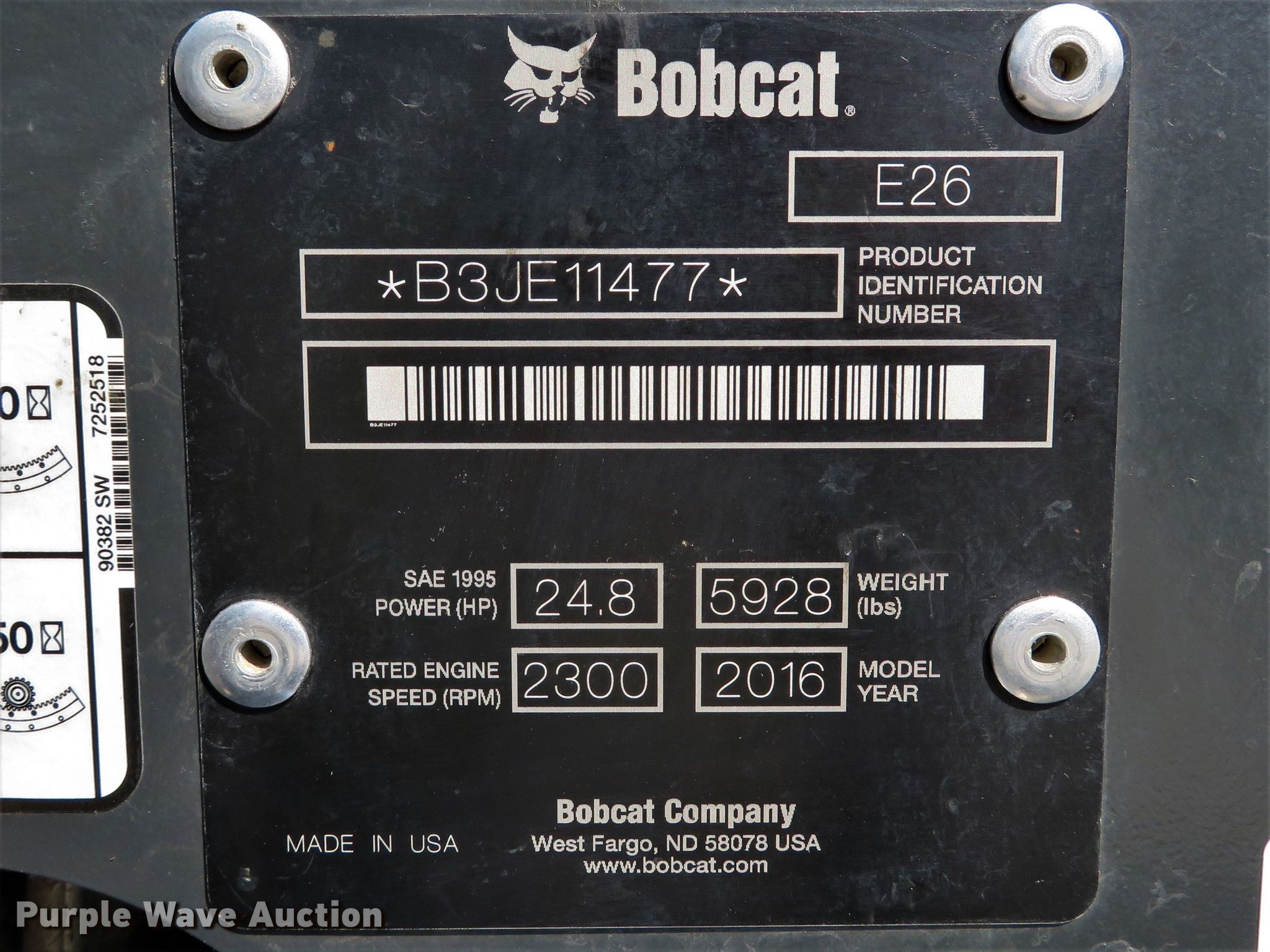 Purple Wave is selling a used Mini Excavator in Illinois. This item is a 2016 Bobcat E26 mini excavator with the following: 72 hours on meter, Kubota three cylinder diesel engine, 25 HP, Two speed hydrostatic transmission, OROPS, Pattern changer, 60"W backfill blade, Standard boom, 55" stick length, Bobcat 24"W bucket, (4) teeth, Bobcat mechanical quick coupler, Auxiliary hydraulics, 12"W rubber tracks, Serial B3JE11477