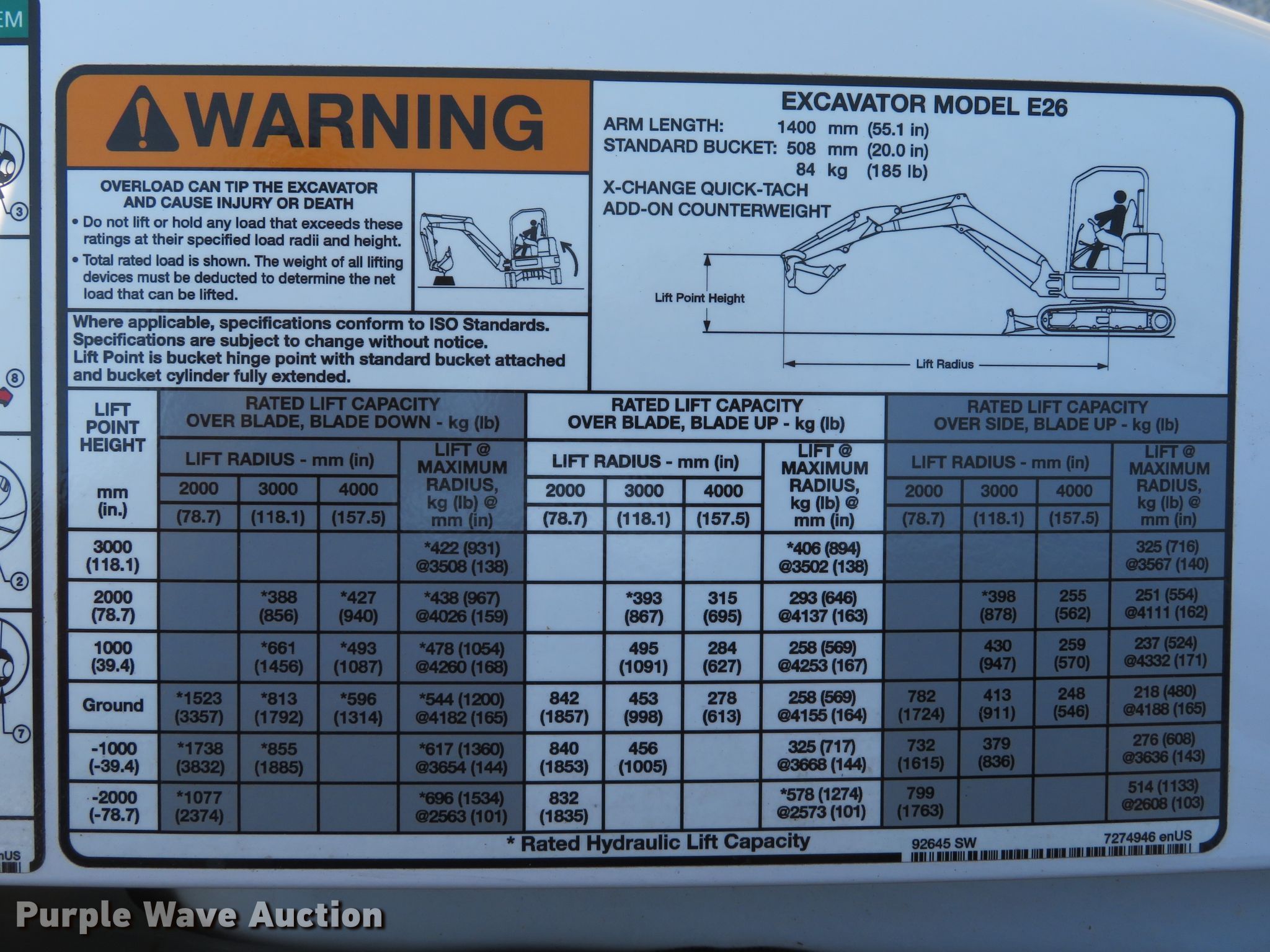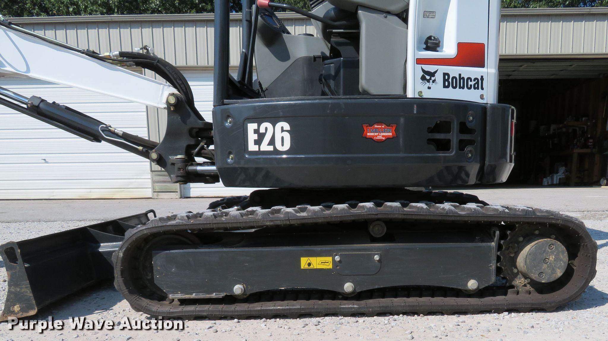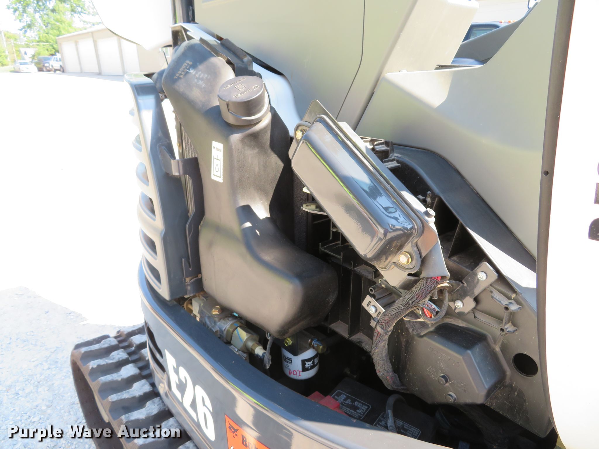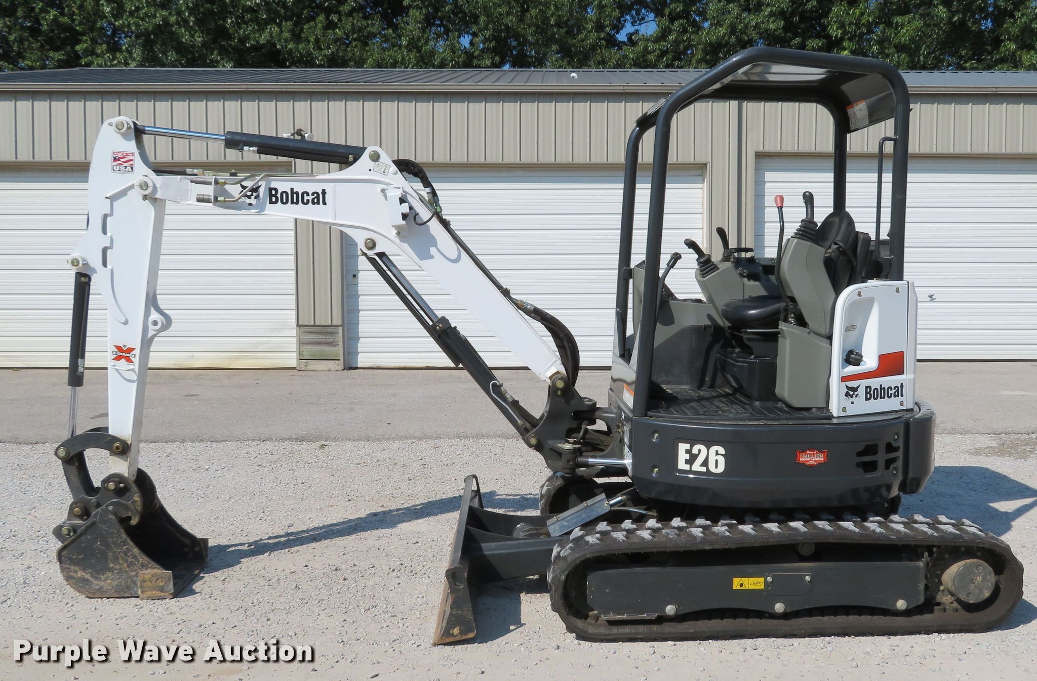 Purple Wave is selling a used Mini Excavator in Illinois. This item is a 2016 Bobcat E26 mini excavator with the following: 72 hours on meter, Kubota three cylinder diesel engine, 25 HP, Two speed hydrostatic transmission, OROPS, Pattern changer, 60"W backfill blade, Standard boom, 55" stick length, Bobcat 24"W bucket, (4) teeth, Bobcat mechanical quick coupler, Auxiliary hydraulics, 12"W rubber tracks, Serial B3JE11477
