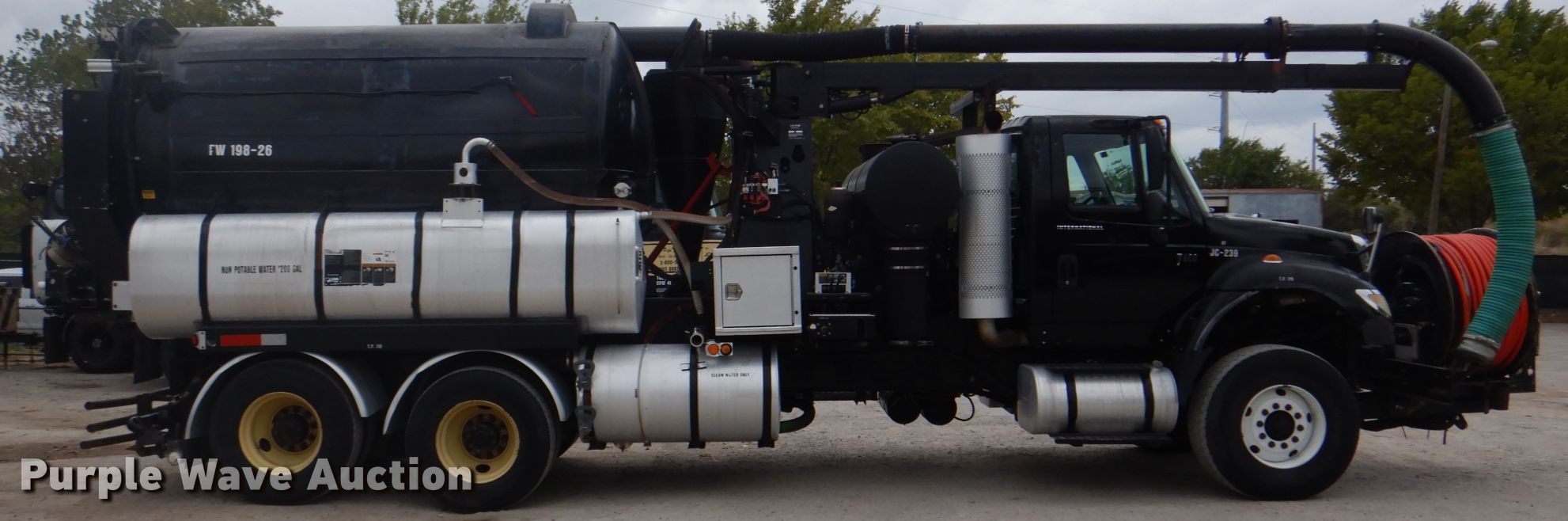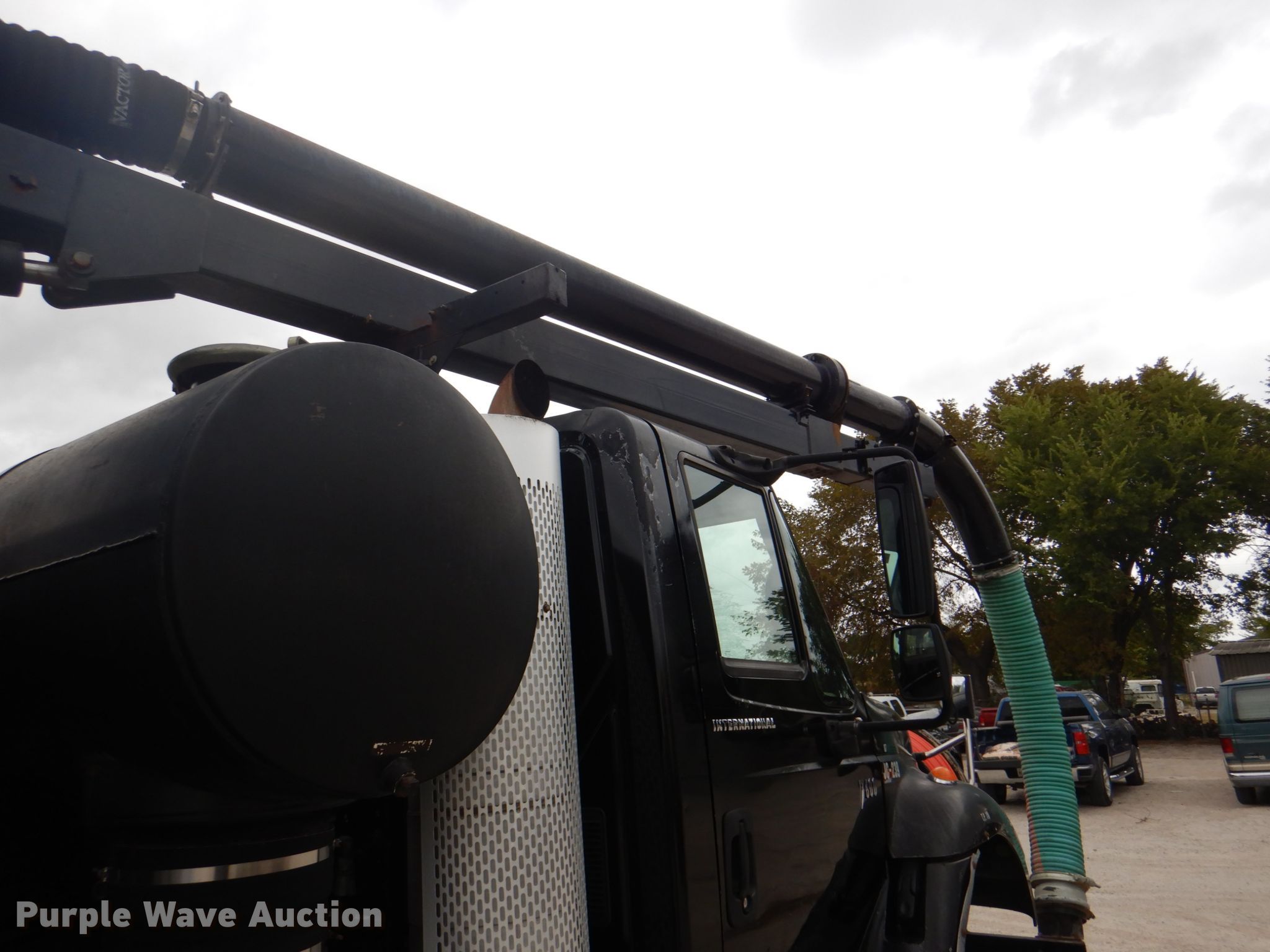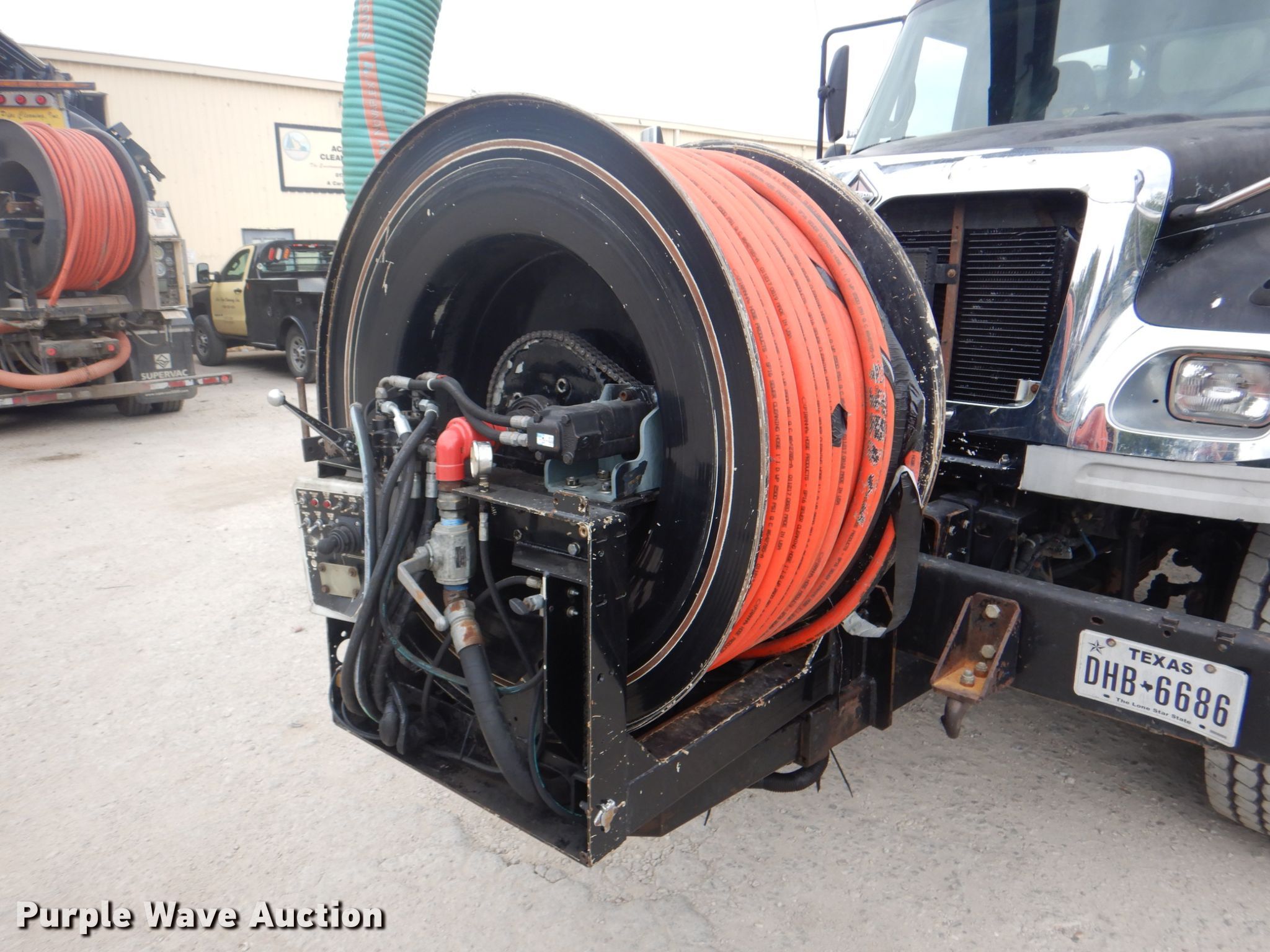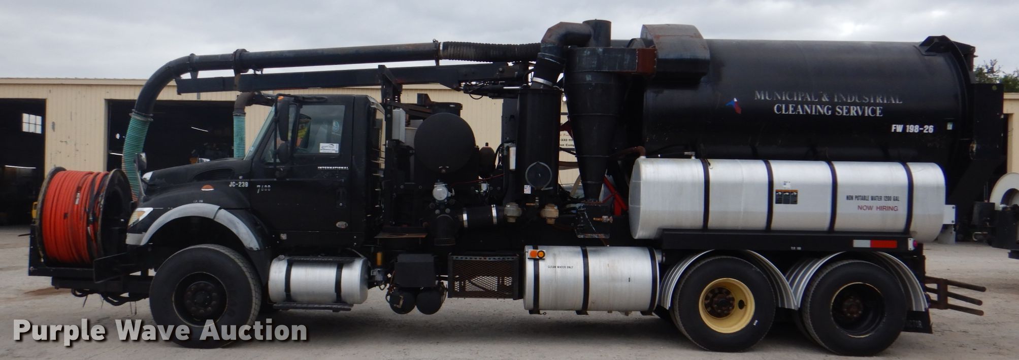 Purple Wave is selling a used Vacuum Truck in Texas. This item is a 2006 International 7600 hydrovac truck with the following: 106,533 miles on odometer, Caterpillar C13 12.5L L6 diesel engine, Automatic transmission, Tandem axle, AC and heat, PTO, Vactor 2115RAS-18 vacuum bed, 1,200 gallon capacity, 6" rear outlet, Front hydraulic hose reel, Ram Jet water pump, 80 gallon per minute at 2,000 psi, Roots positive displacement blower, 15 cu.yd. debris capacity, 8' telescopic boom, Serial 07-04V-10455, Spring suspension, Air brakes, 252" wheelbase, 425/65R22.5 front tires, 11R22.5 rear tires, GVWR 66,000 lbs, Decals will be removed
