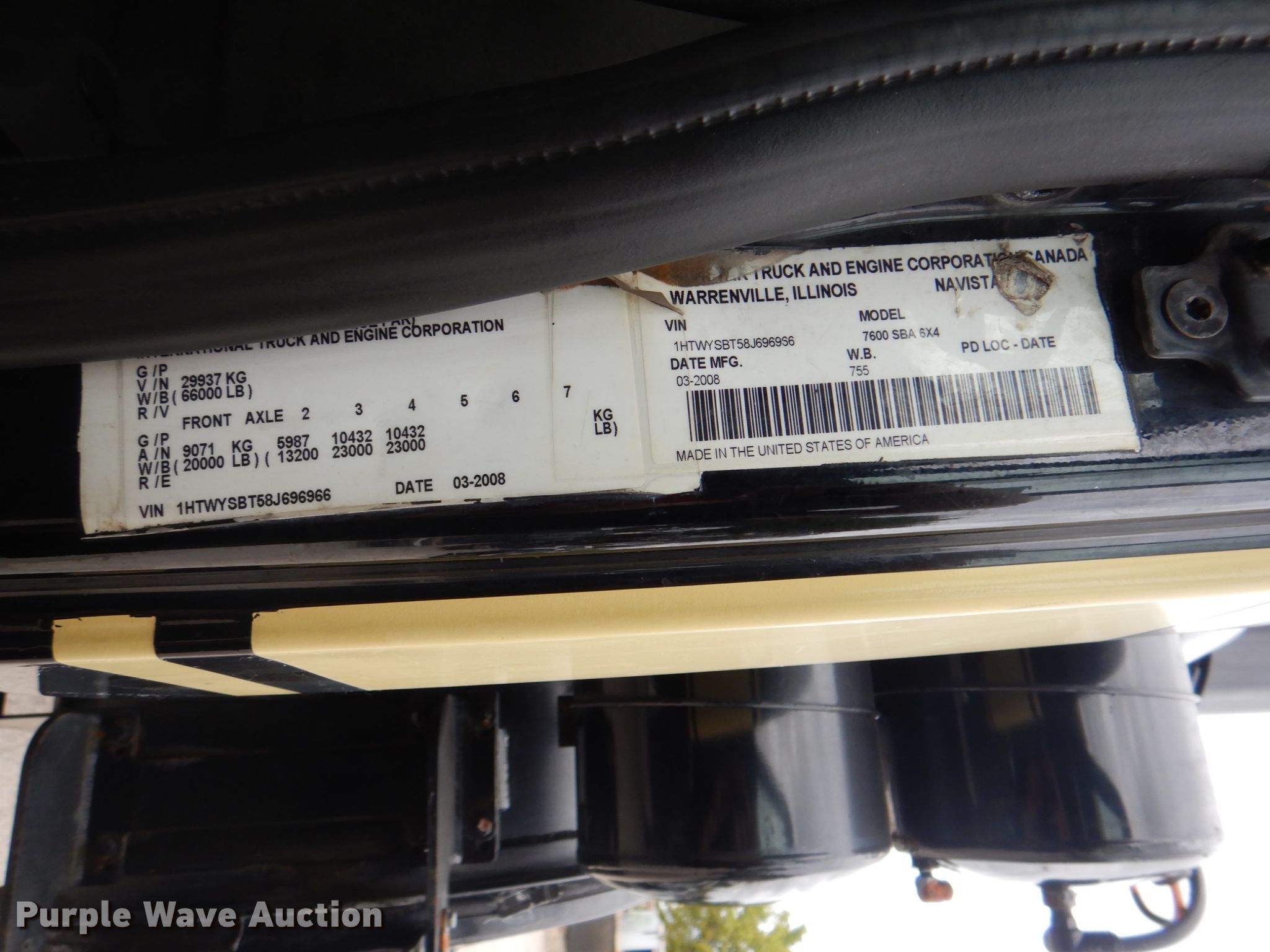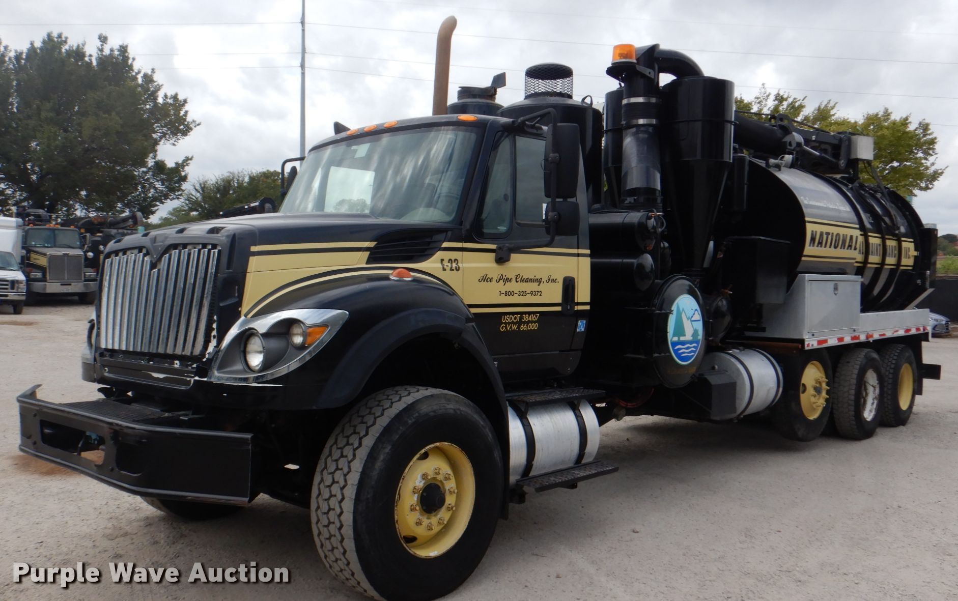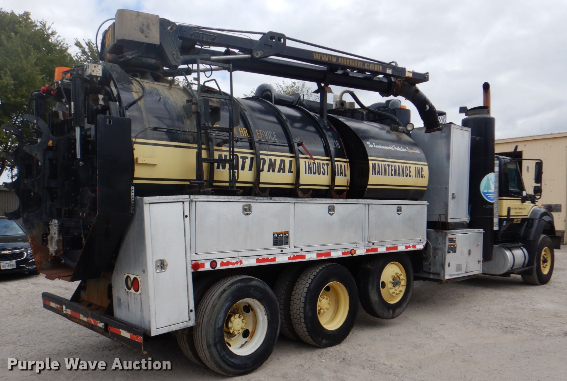 Purple Wave is selling a used Vacuum Truck in Texas. This item is a 2008 International 7600 hydro excavation truck with the following: 120,427 miles on odometer, Caterpillar C13 12.5L L6 diesel engine, Eaton Fuller 10 speed manual transmission, Triple axle, AC and heat, PTO, 2009 Vactor vacuum bed, 8" rear outlet, Water Pro Tech pump water heater, 10 gallon per minute at 3,000 psi, 400,000 BTU, 8' telescopic boom, Remote control, Positive displacement blower, 5,000 CFM, Omsi transfer case, Serial 08-09V11357, Spring suspension, Air brakes, 298" wheelbase, 425/65R22.5 front tires, 11R22.5 rear tires, GVWR 66,000 lbs, Decals will be removed