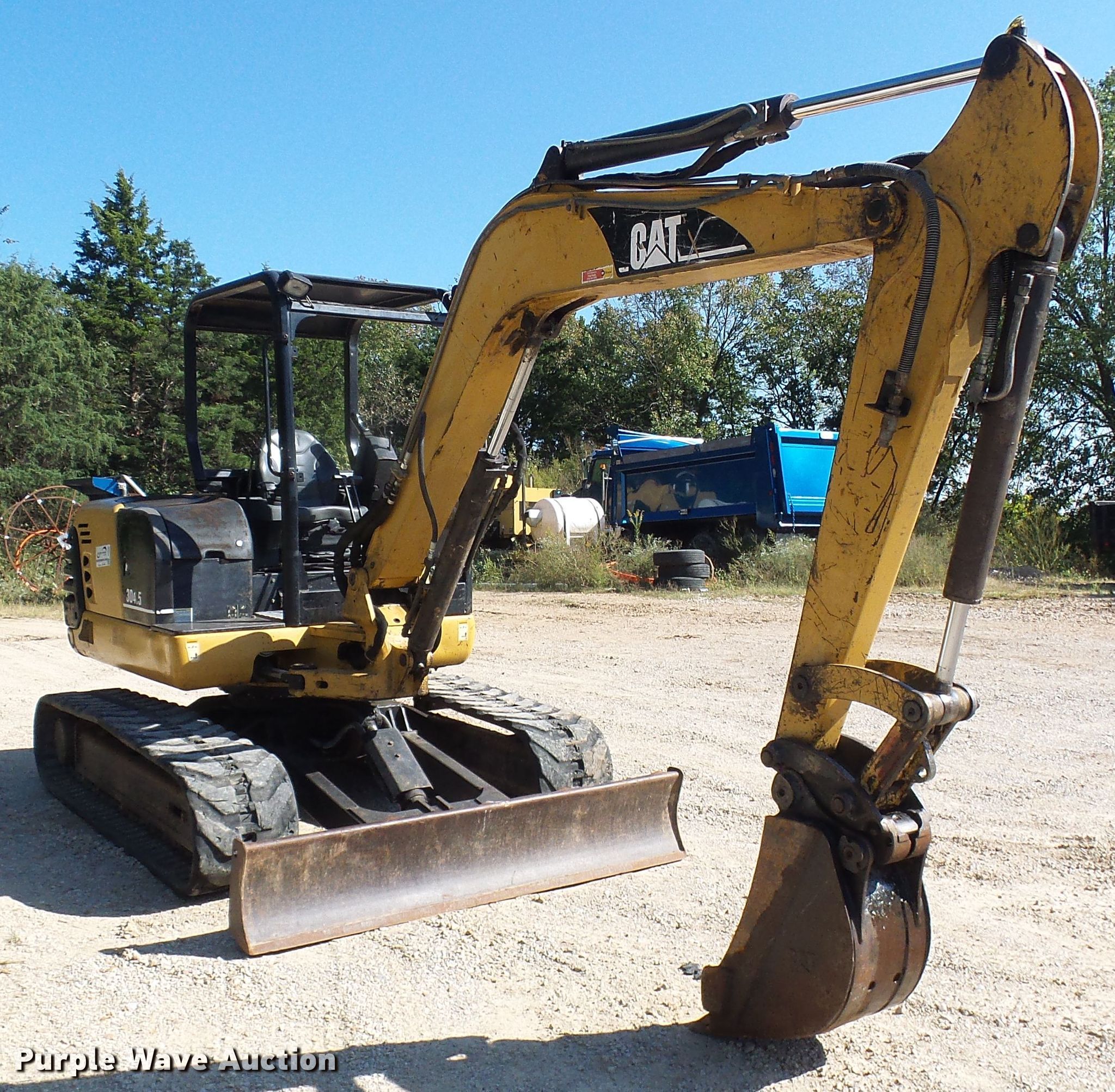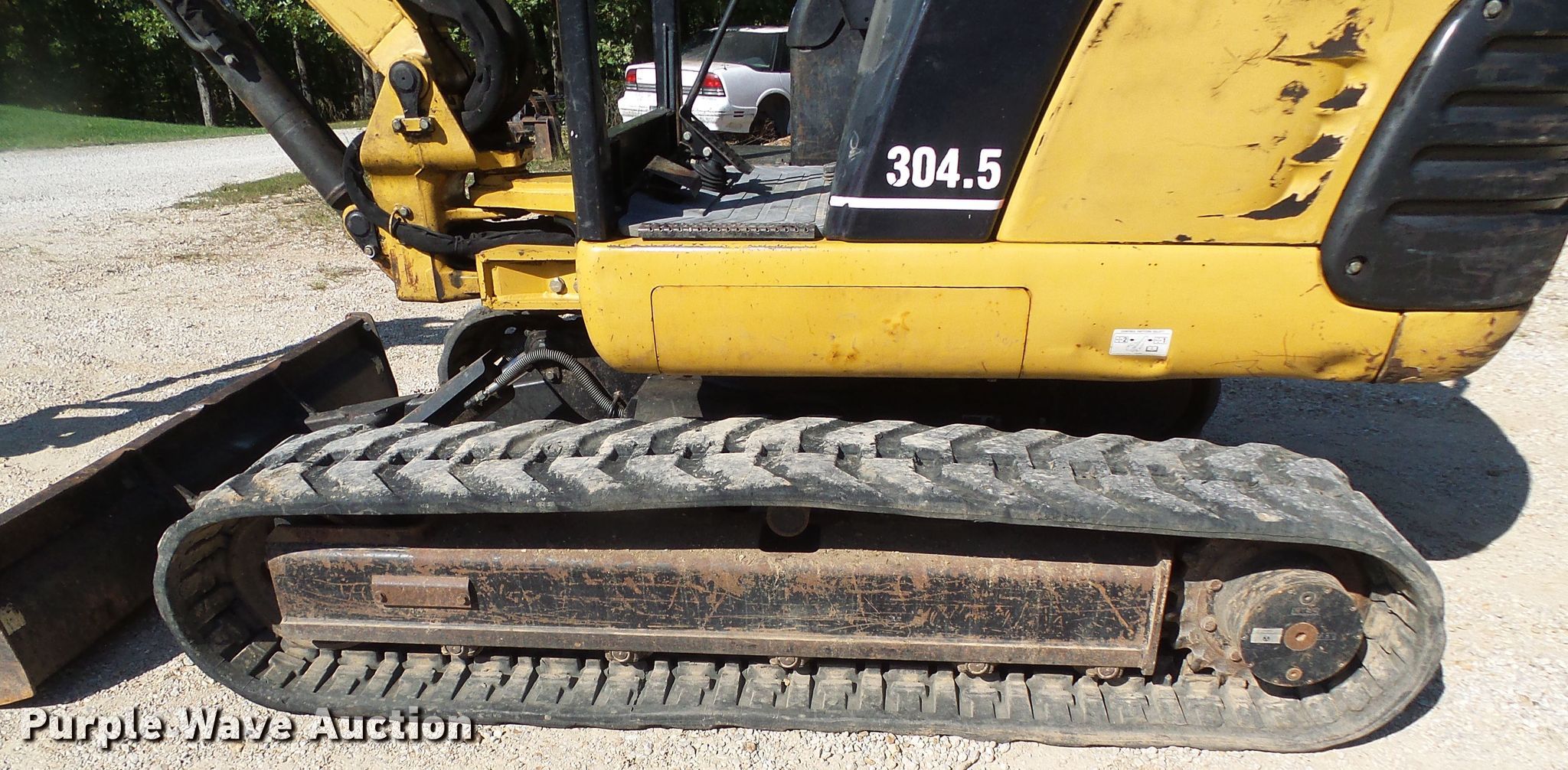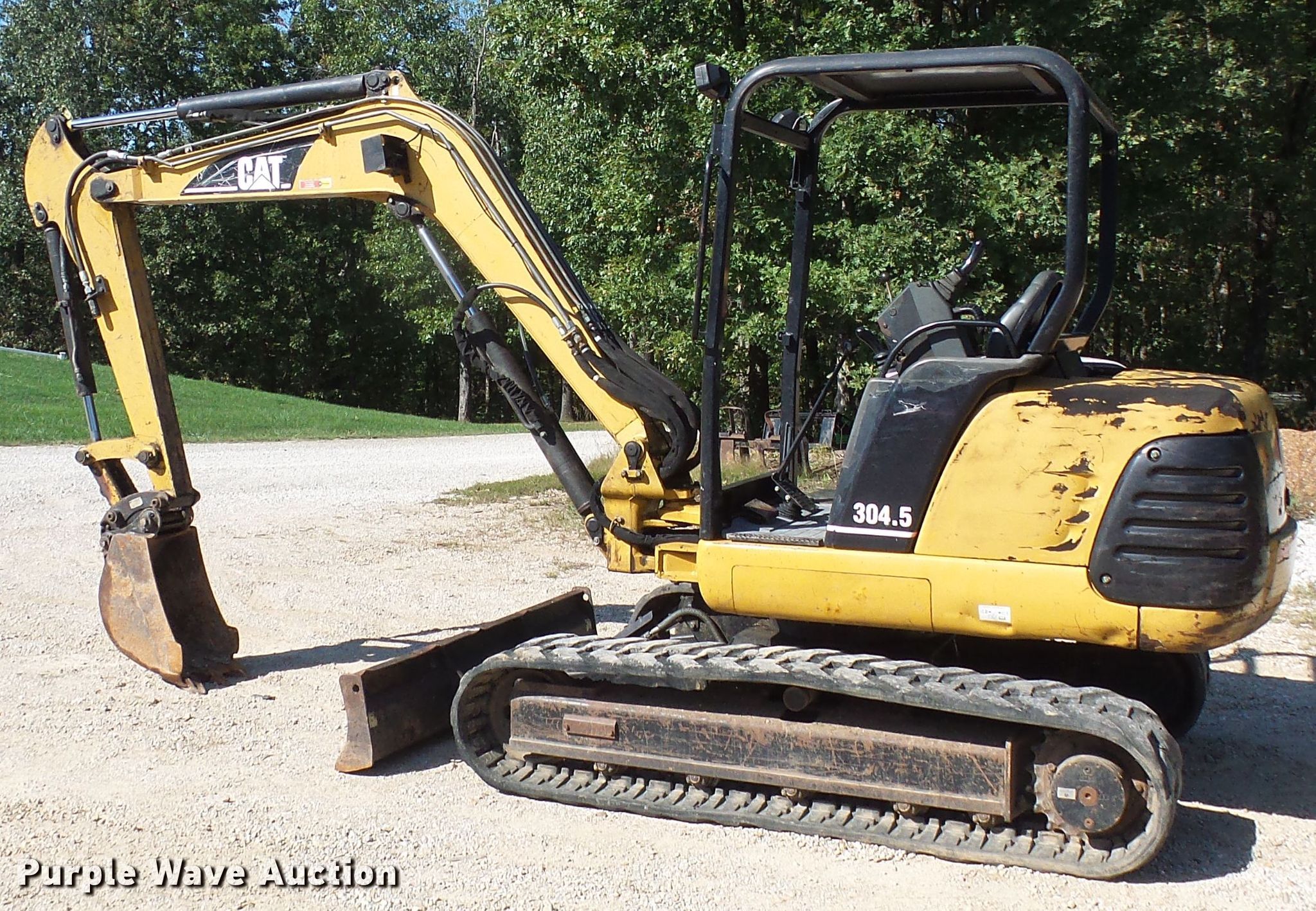 Purple Wave is selling a used Mini Excavator in Missouri. This item is a 2002 Caterpillar 304.5 mini excavator with the following: 4,017 hours on meter, Caterpillar 3024 four cylinder diesel engine, Two speed hydrostatic transmission, 75"W backfill blade, Standard boom, 16"W bucket, 36"W bucket, 27"W bucket, Mechanical quick coupler, Auxiliary hydraulics, 16"W rubber tracks, Serial CAT03045CWAK0035
