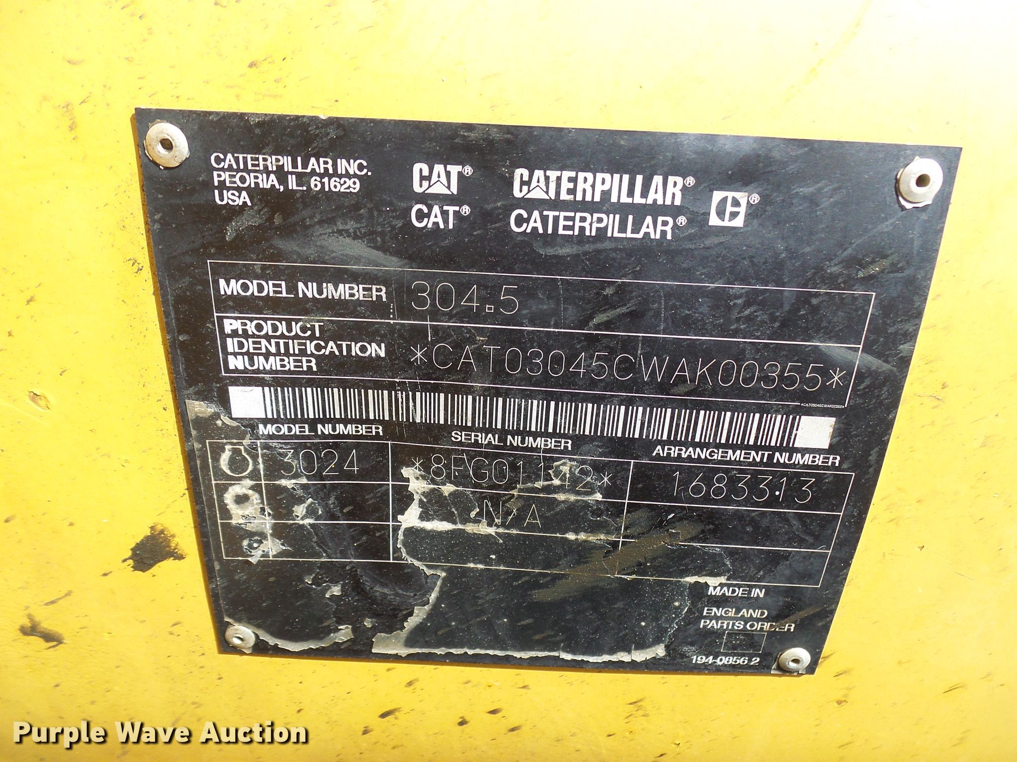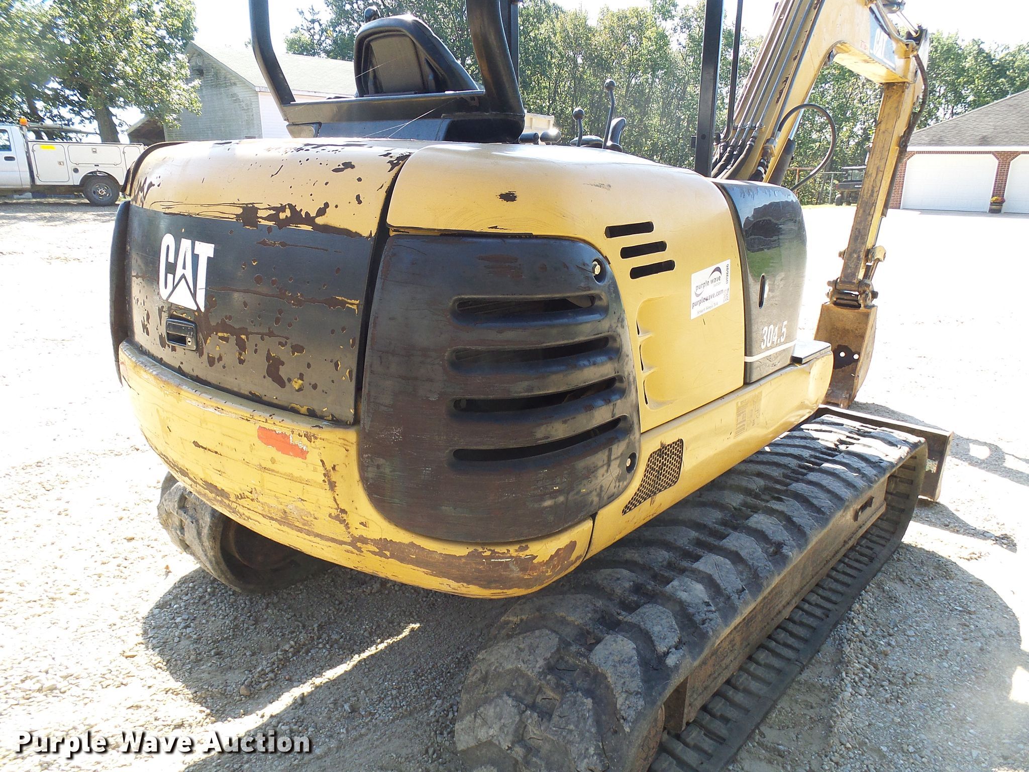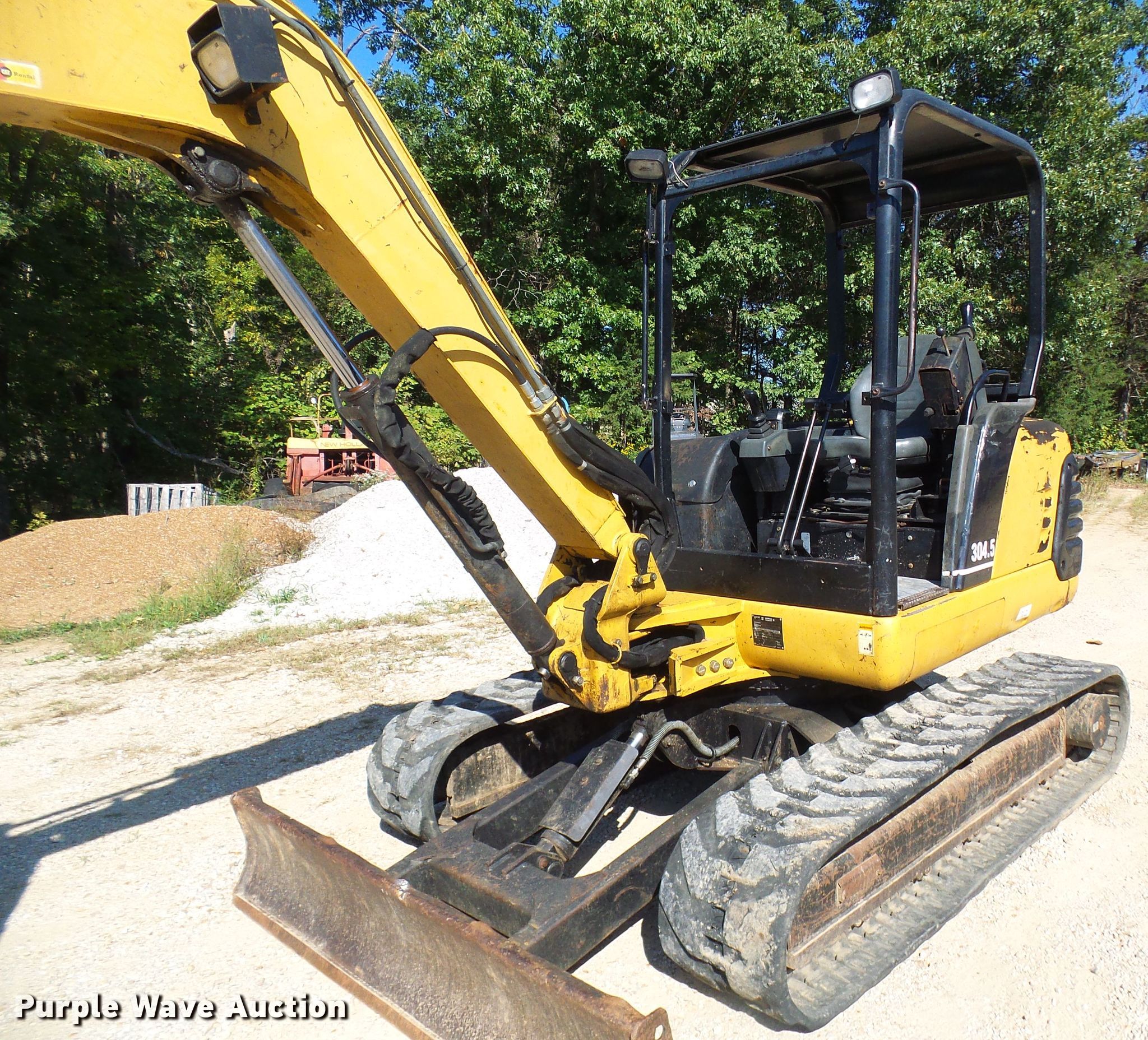 Purple Wave is selling a used Mini Excavator in Missouri. This item is a 2002 Caterpillar 304.5 mini excavator with the following: 4,017 hours on meter, Caterpillar 3024 four cylinder diesel engine, Two speed hydrostatic transmission, 75"W backfill blade, Standard boom, 16"W bucket, 36"W bucket, 27"W bucket, Mechanical quick coupler, Auxiliary hydraulics, 16"W rubber tracks, Serial CAT03045CWAK0035