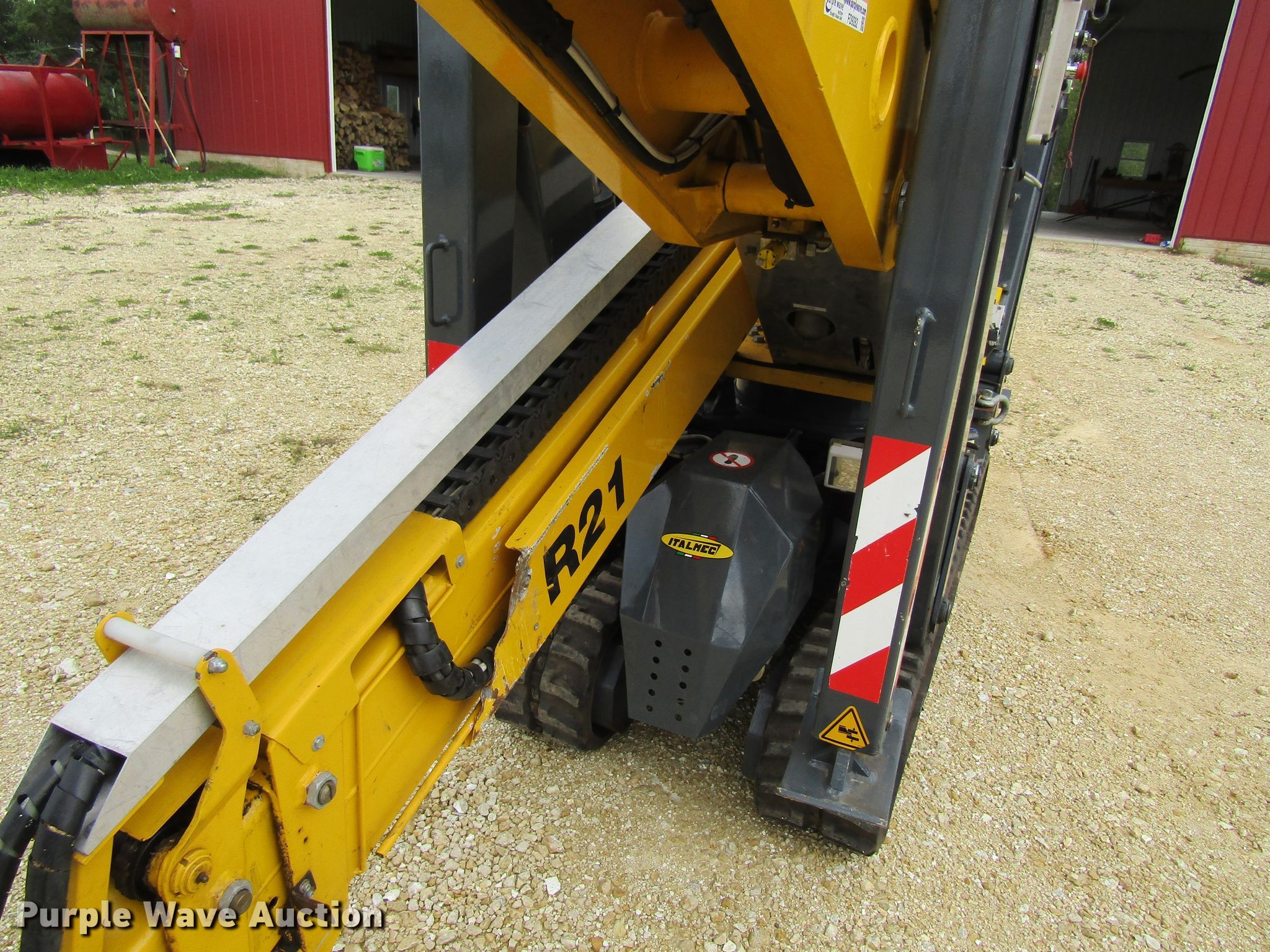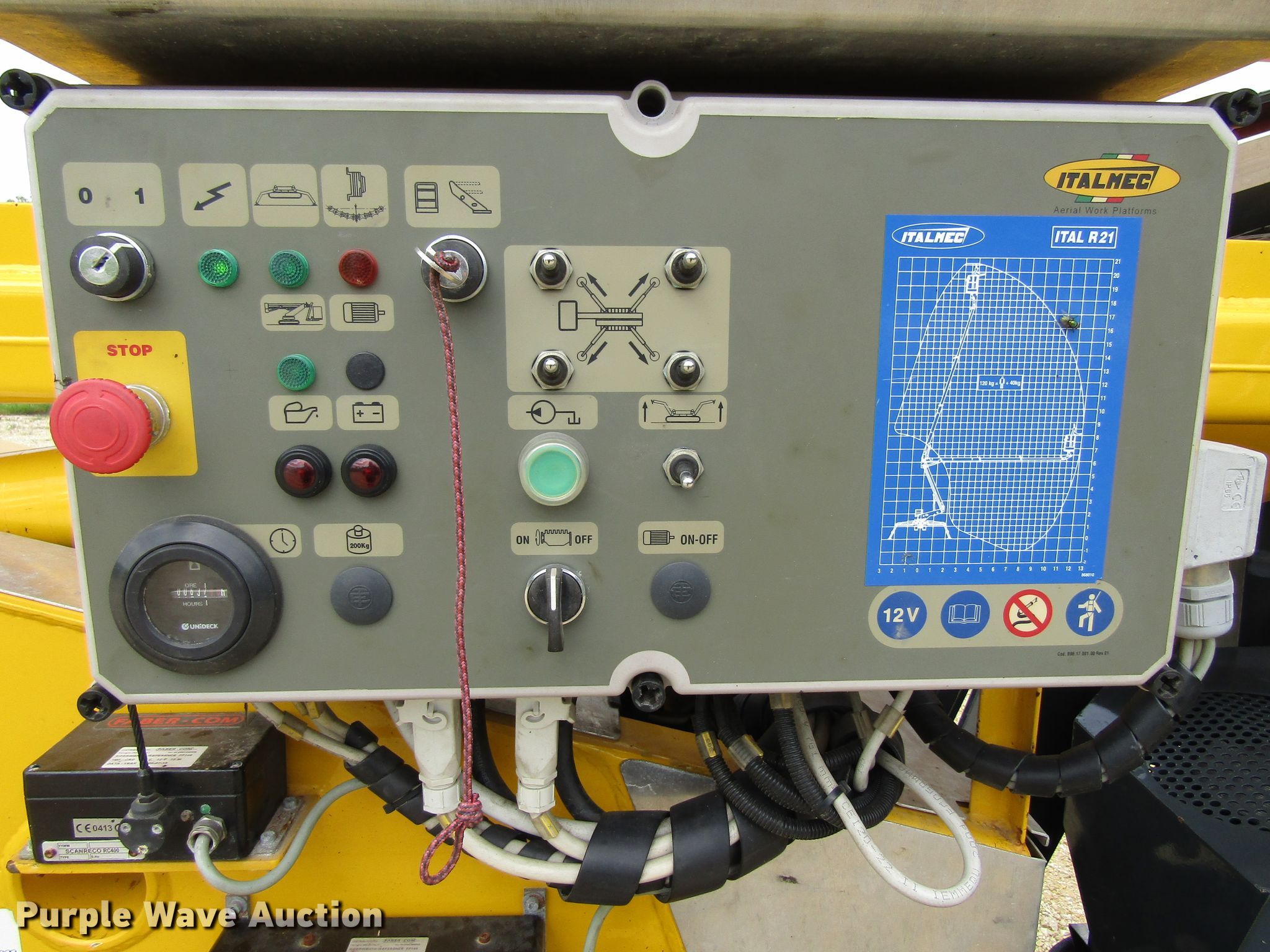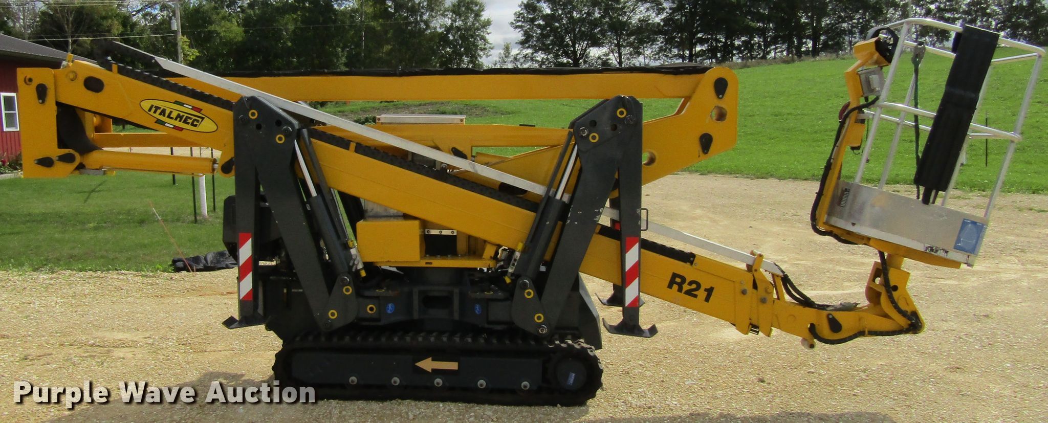 Purple Wave is selling a used Boom Lift in Iowa. This item is a 2008 Italmec R21 boom lift with the following: 637 hours on meter, One cylinder diesel engine, 265 lbs max lift capacity, 75' max reach length, 70' max lift height, Hydraulic leveling, 30"L x 30"W platform, Platform, ground, and remote controls, Powered platform extensions, Hydraulic platform rotation, Hydraulic outriggers, 10"W rubber tracks, Fits through 36" opening, Possible idle issues, Serial I-13111