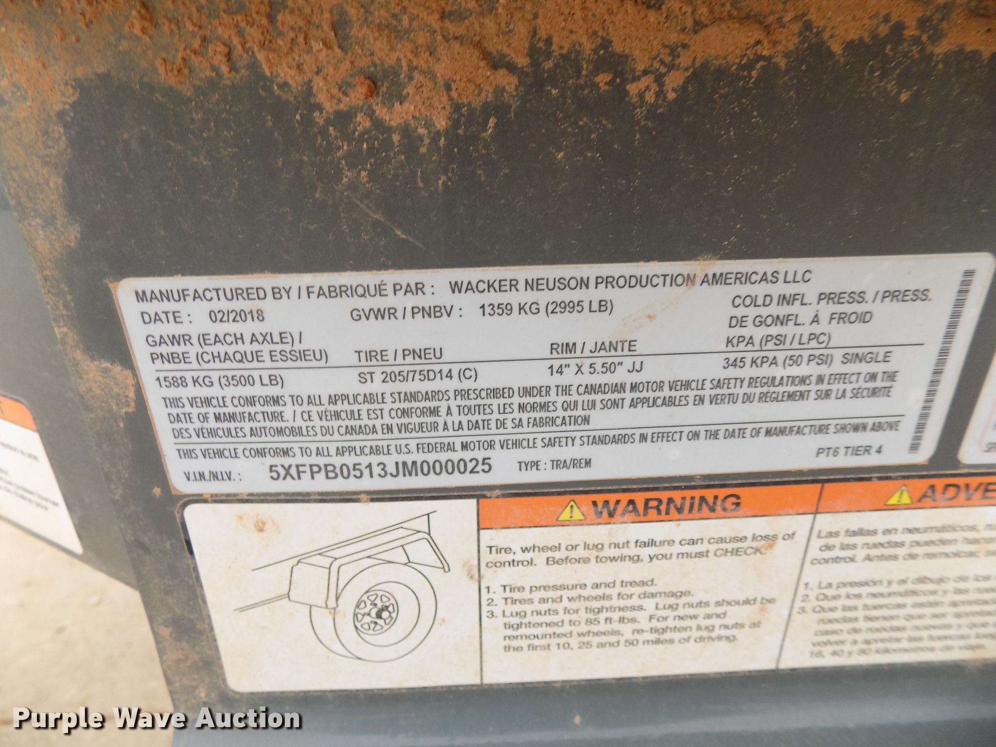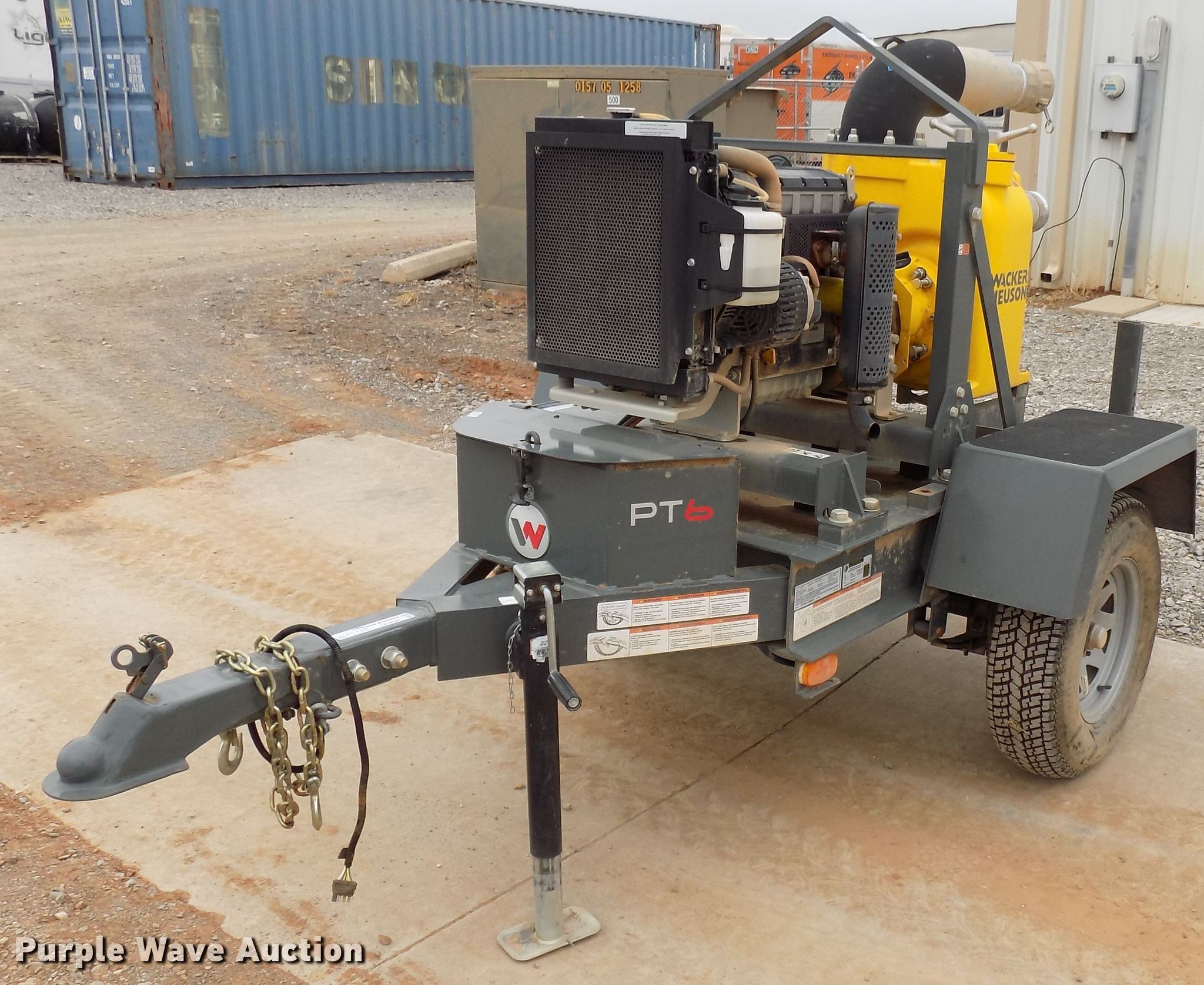 Purple Wave is selling a used Pump in Oklahoma. This item is a 2018 Wacker Neuson PT6LT pump with the following: Kohler 1.3L four cylinder diesel engine, 1,300 gallon per minute capacity, 6" inlet, Reduced to 4", Fabrique trailer, 205/75D14 tires